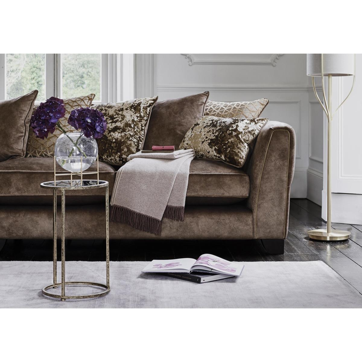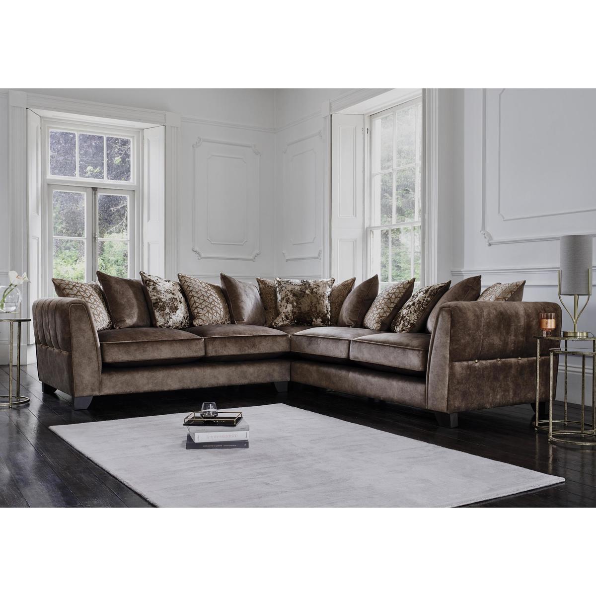 Come home to indulgent comfort on the grandest scale. This large pillow back corner sofa has deep and inviting seats cushions – plumpness guaranteed – and 12 feather- filled scatters. Why you'll love it This large fabric pillow back corner sofa is perfect for your contemporary home. Sumptuous style, serious comfort, superb quality. Luxurious yet durable upholstery looks and feels like nubuck leather. Generously proportioned and ready for lounging with deep roomy seats. Exceptional craftsmanship – firm seat edges, solid hardwood frame, dark wood feet. Sink- in soft seat cushions come with our 5- year plumpness guarantee. They’re filled with Encore foam so they spring back into shape, time after time. The high, gently- curved arms feature hand- sewn fluting. Opt for brass- effect or chrome- effect piping and studs – at no extra cost. This pillow back sofa comes with 12 feather- filled cushions in beautiful coordinating fabrics. Handmade in the UK and only at Furniture Village. This large fabric pillow back corner sofa is part of our Ariana range. What you need to know Medium comfort level. Seat suspension: sprung with firm front edges. Seat cushioning: Encore foam. Back support: webbing. Back cushioning: feather- filled. For easy access this sofa will be delivered in three parts. Some fabrics can show wear on areas of more use or in direct sunlight. Plump, turn and rotate seat and back cushions regularly. Please read our upholstery care guide for more advice. Shop our Ariana range for a huge choice of sofa, chair and footstool styles, sizes and fabrics.