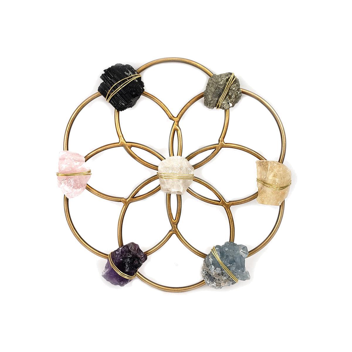 Bring the power of crystals into your home with this Flower of Life healing crystal grid from Ariana Ost. With a geometric flower design handcrafted from brass, it features seven crystals each with powerful healing properties.