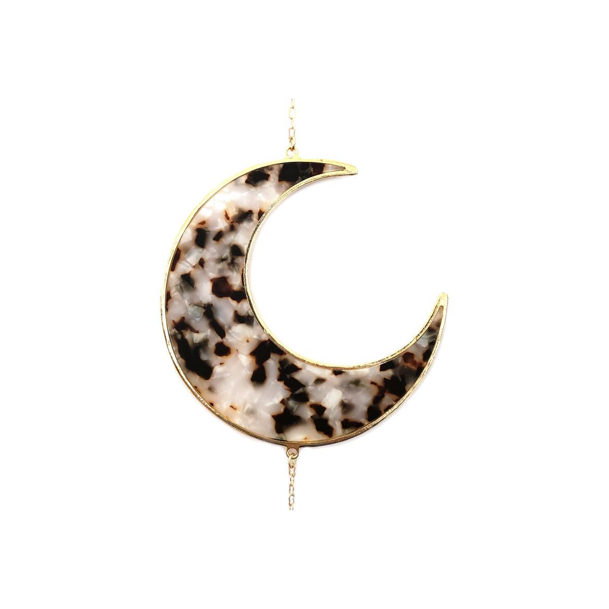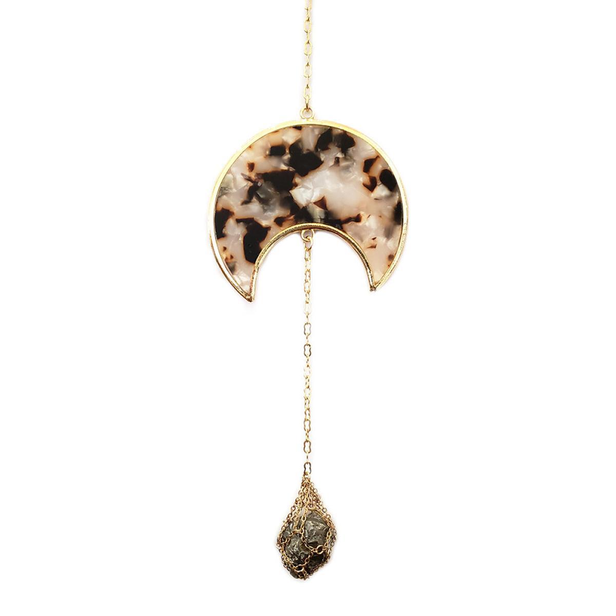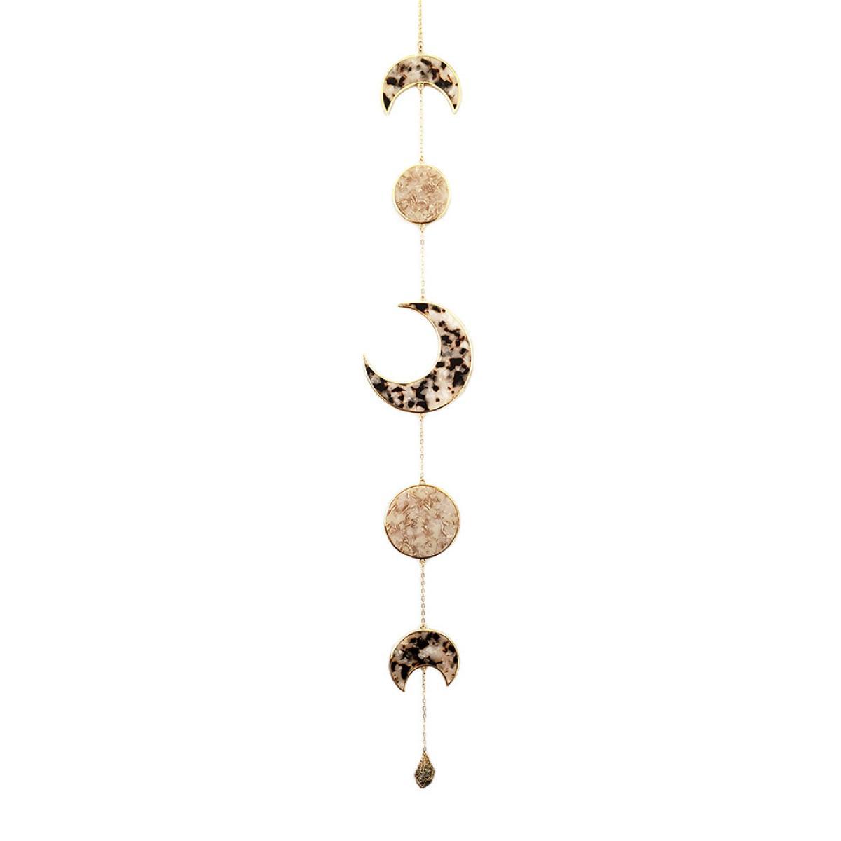 Bring the warmth of the moonlight into any room of the house with this Moon Phase wall hanging from Ariana Ost. Handcrafted from a golden brass with beautiful resin pieces alongside sparkly gemstone accents, this wall hanging is perfect for bringing positive energy into any space. Key features: * Material: brass, resin, pyrite gemstone * Dimensions: L85xW11cm * Warm earthy shades * Golden brass chain * With sparkly gemstone accents * Mimics the warmth of moonlight * Handcrafted in New York City