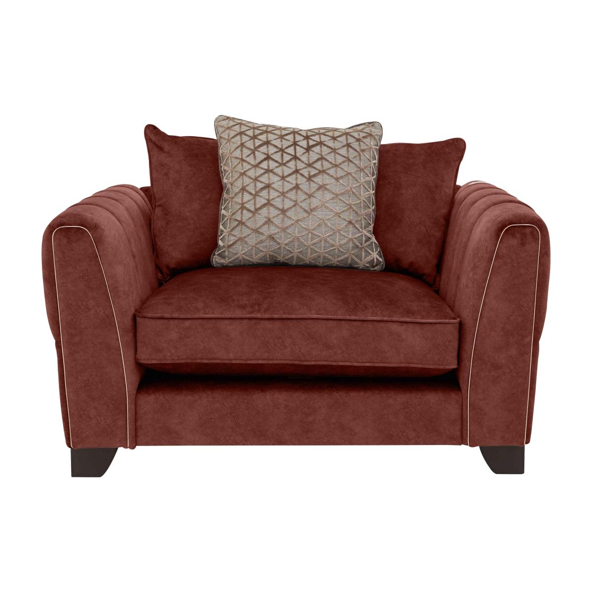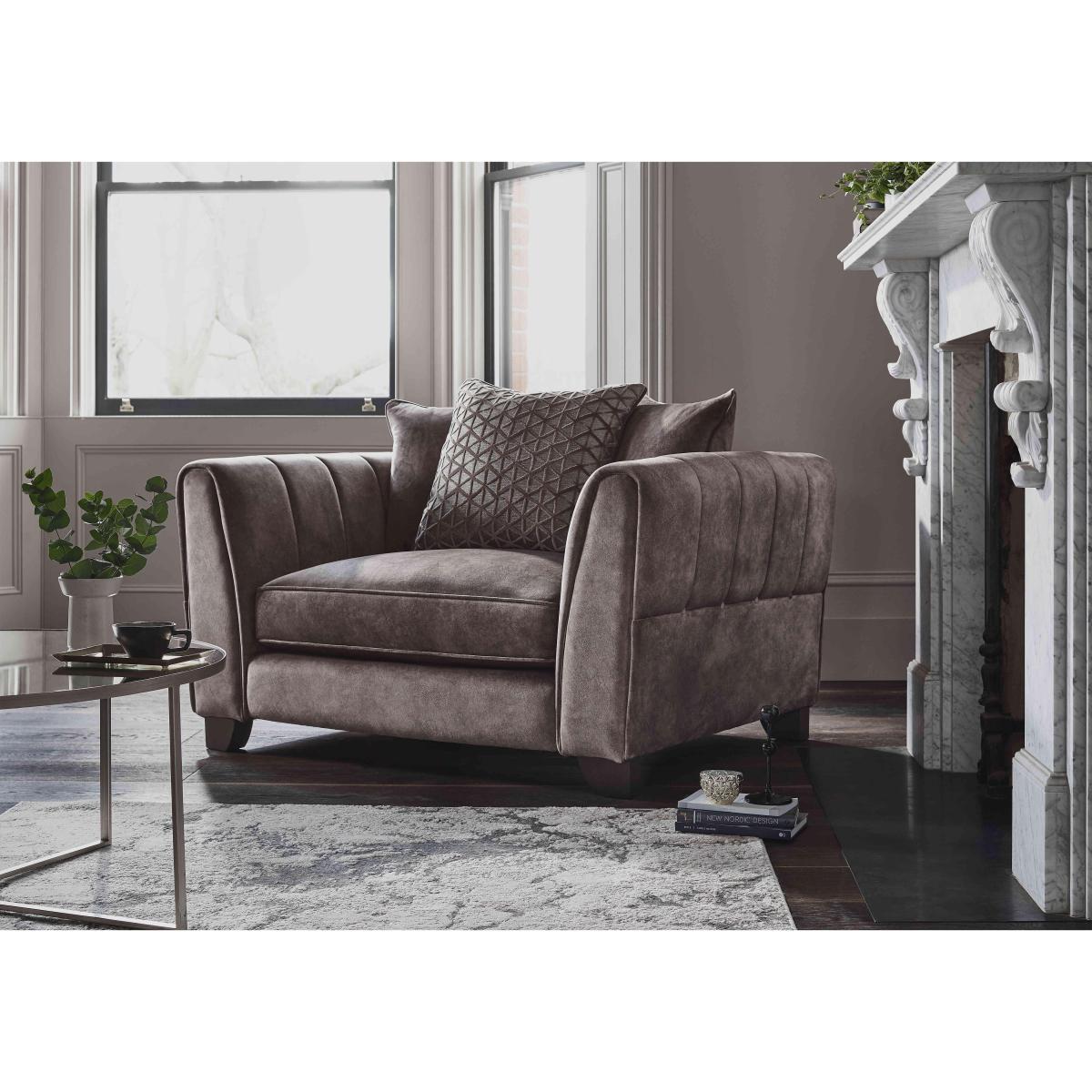 The perfect blend of modern elegance and luxury comfort, the Ariana Collection was designed to stand out. Grand in scale and contemporary in style, its generous, deep seats are upholstered in a unique fabric with the industrial look of leather but the incredible softness of luxury velvet for a truly indulgent lounging experience. Encore foam seats are sumptuously comfortable and keep their shape perfectly without re-plumping and a beautiful array of feather filled scatter cushions with a velvety sheen create a cushioned heaven. The elegant arms are decorated with delicate fluting and each piece comes with the option of brass or chrome studding and piping for a touch of opulence. Available in a variety of plush, gorgeous colours to complement the modern home. Handcrafted in the UK and exclusive to Furniture Village. With plumpness-guaranteed sink-in seats, and beautiful nubuck leather-look upholstery, this roomy snuggle chair is perfect whether you’re curling up solo or relaxing with a friend. This glam fabric pillow back snuggler chair is the perfect large armchair. Sumptuous style, serious comfort, superb quality. Luxurious yet durable upholstery looks and feels like nubuck leather. Generously proportioned and ready for lounging with a deep roomy seat. Exceptional craftsmanship – firm seat edge, solid hardwood frame, dark wood feet. Sink-in soft seat cushion comes with our 5-year plumpness guarantee. It’s filled with Encore foam so it springs back into shape, time after time. The high, gently-curved arms feature hand-sewn fluting. Opt for brass-effect or chrome-effect piping and studs – at no extra cost. This pillow back chair comes with 3 feather-filled cushions in beautiful coordinating fabrics. Handmade in the UK and only at Furniture Village. This fabric pillow back snuggler chair is part of our Ariana range. What you need to know Medium comfort level. Seat suspension: sprung with firm front edge. Seat cushioning: Encore foam. Back support: webbing. Back cushioning: feather-filled. For ease of delivery, please ensure there is sufficient access to your home. Some fabrics can show wear on areas of more use or in direct sunlight. Plump, turn and rotate seat and back cushions regularly. Please read our upholstery care guide for more advice. Shop our Ariana range for a huge choice of sofa, chair and footstool styles, sizes and fabrics.