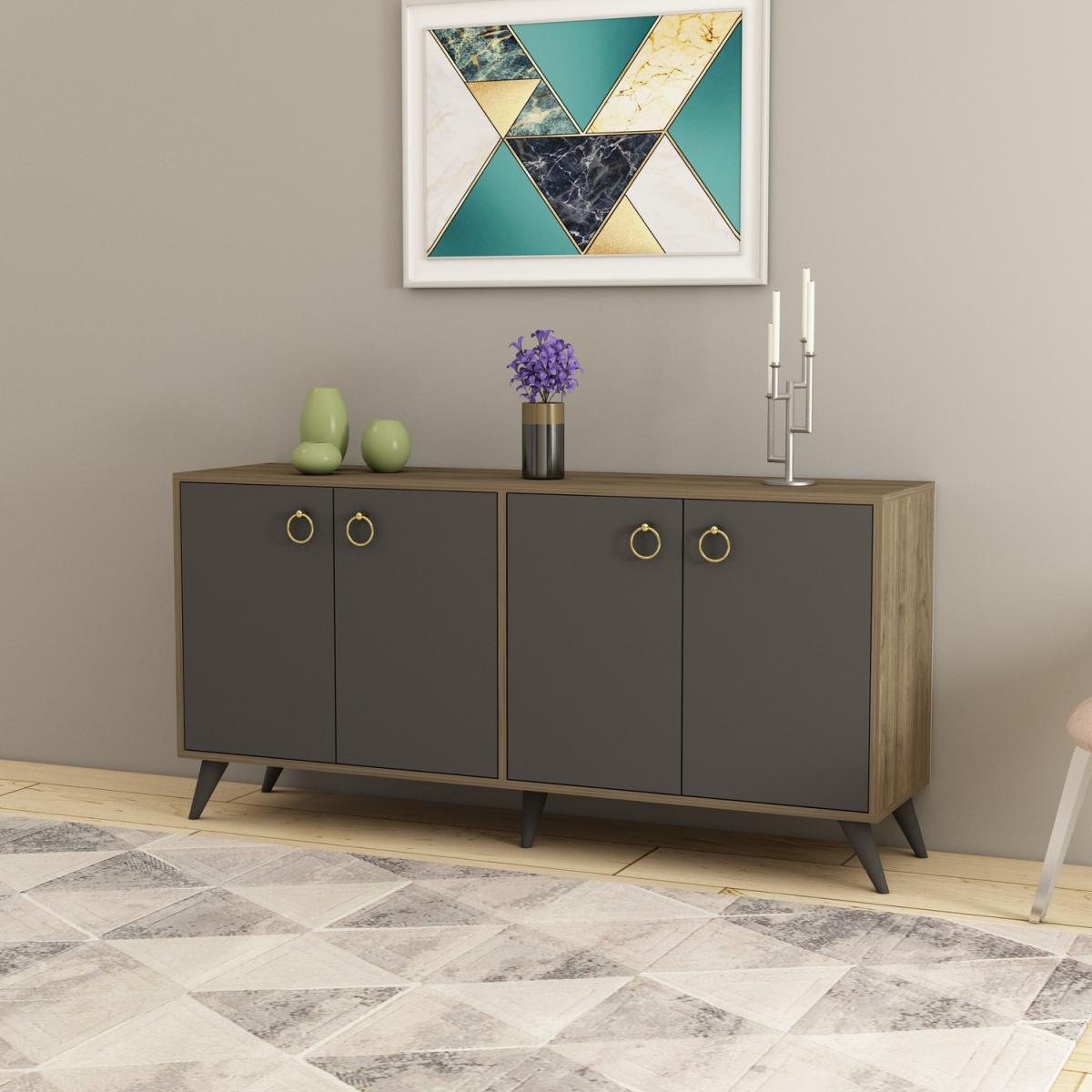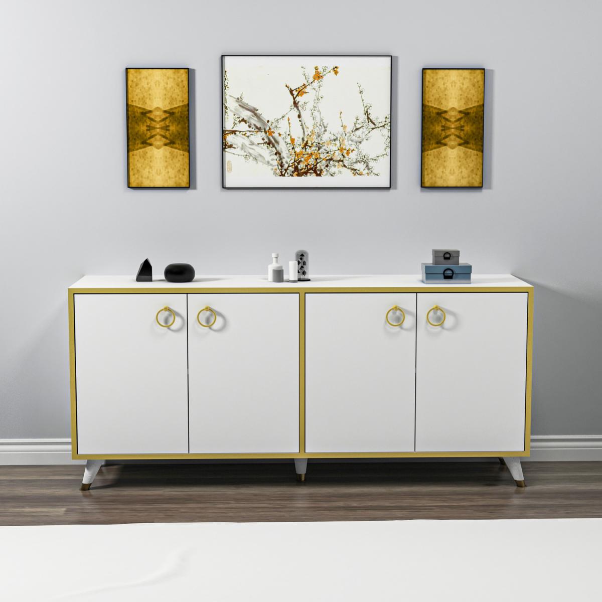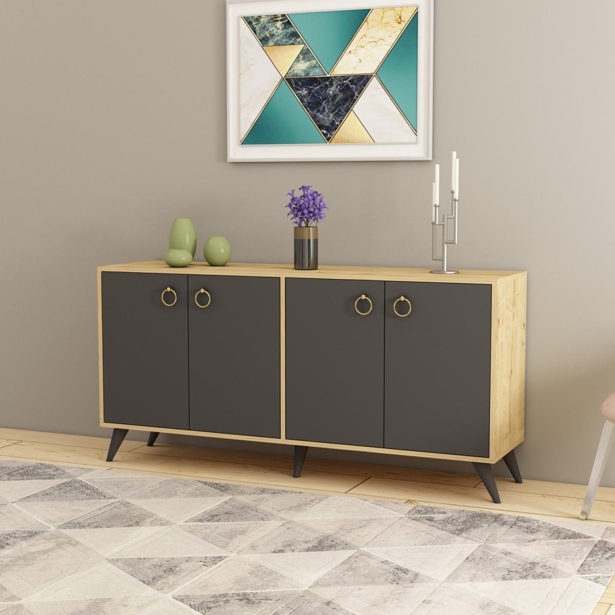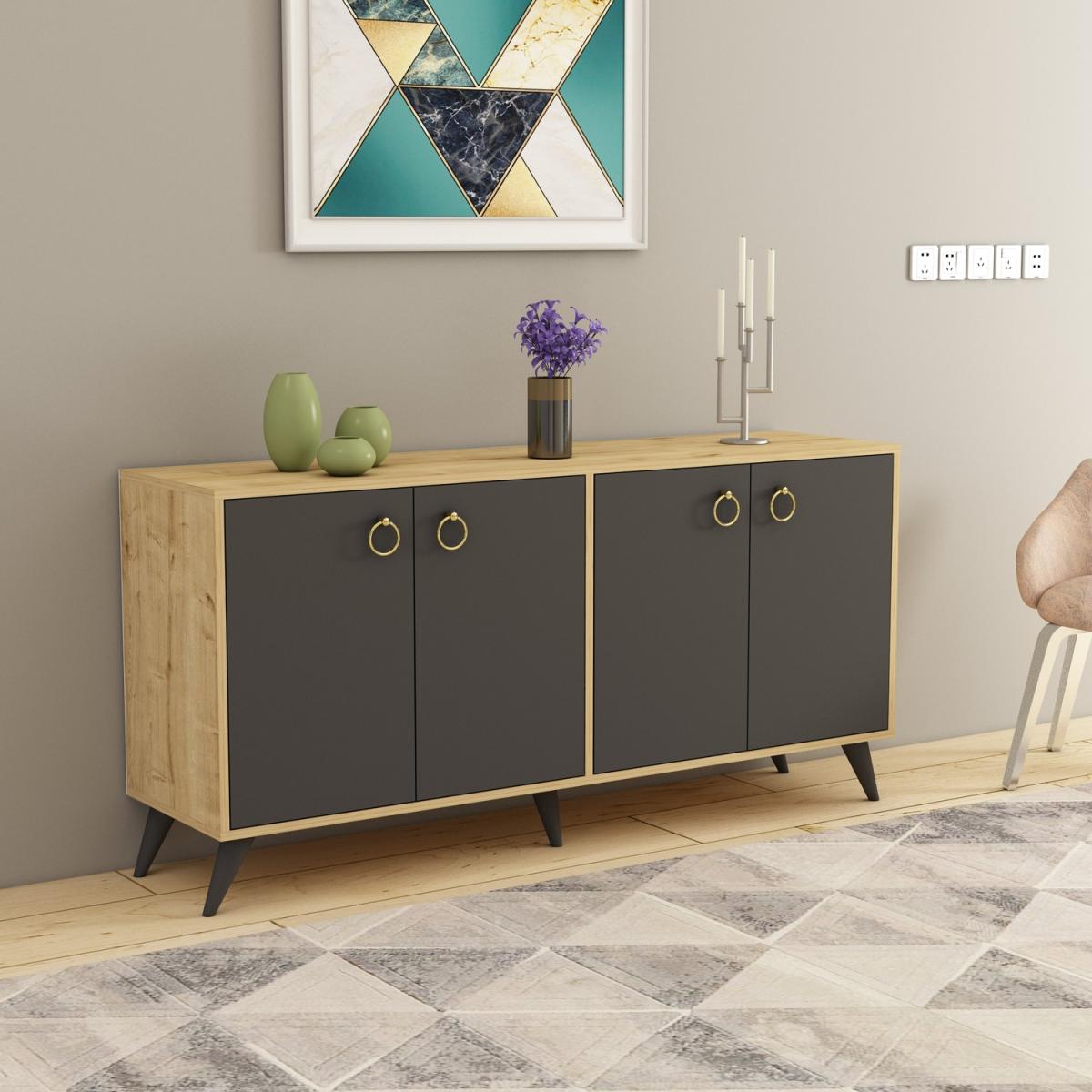 The sideboard has an elegant look with its metal handles. Also, you can store your utilities and other belongings. MATERIAL The sideboard is made of an 18 mm thick quality melamine-coated particleboard. The manufactured wood surface is water-resistant to some extent and the edges are banded with PVC edge banding tape. First-class assemblyinstallation hardware and accessories are used. Our products are produced from certified quality raw materials that do not contain carcinogenic substances and comply with European Union health norms. CLEANING You can clean your furniture with a dry cloth. Avoid prolonged contact of your product with moisture and water. ASSEMBLY The product will be delivered to the customer in the original package as disassembled. It is designed to be assembled by the customer using a power drill and screwdriver. Assembly instruction and installation hardware are included in the package. For fast and error-free installation, product parts are numbered with stickers in accordance with the assembly guide.