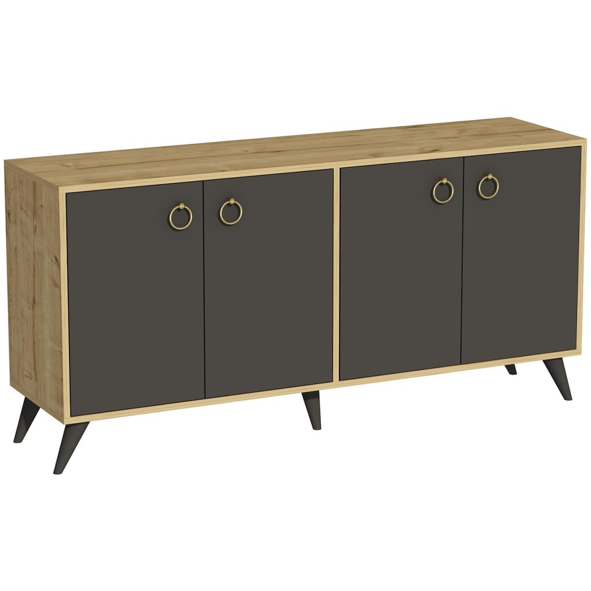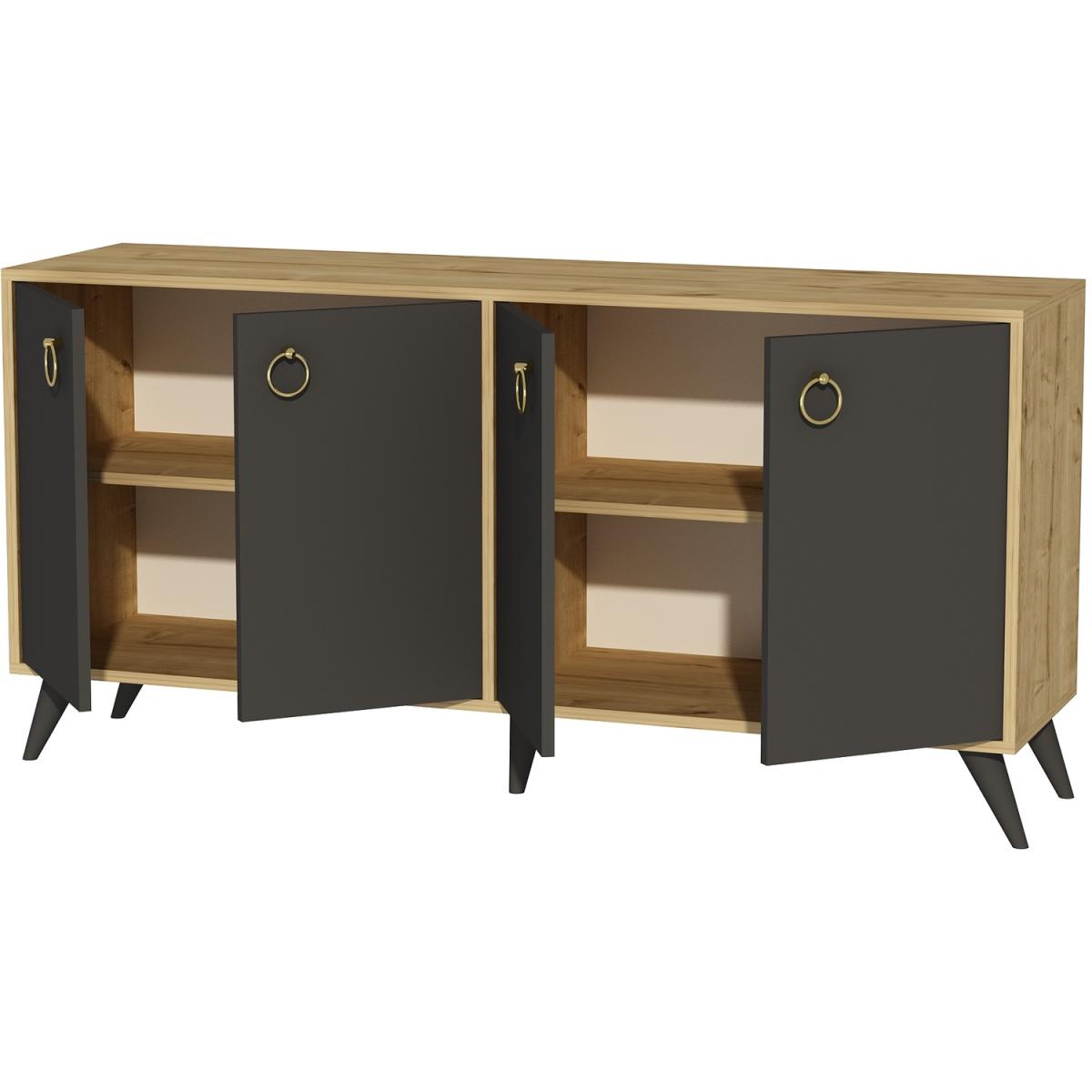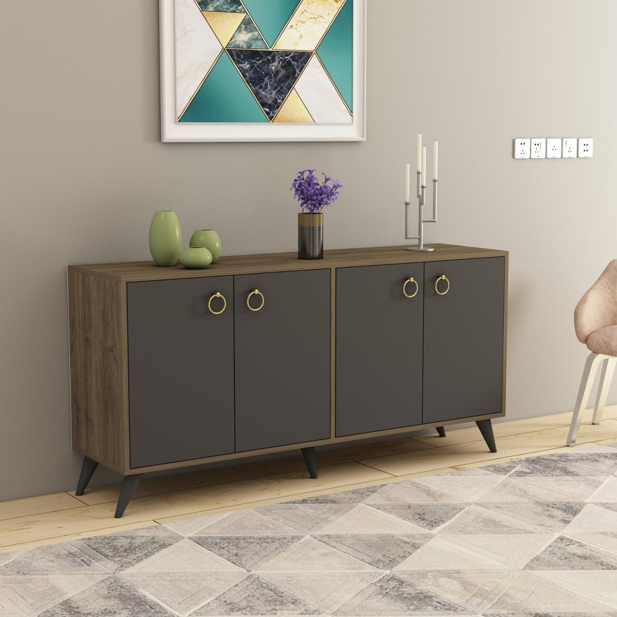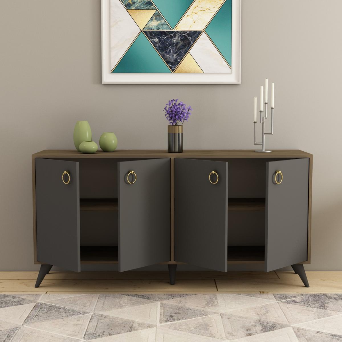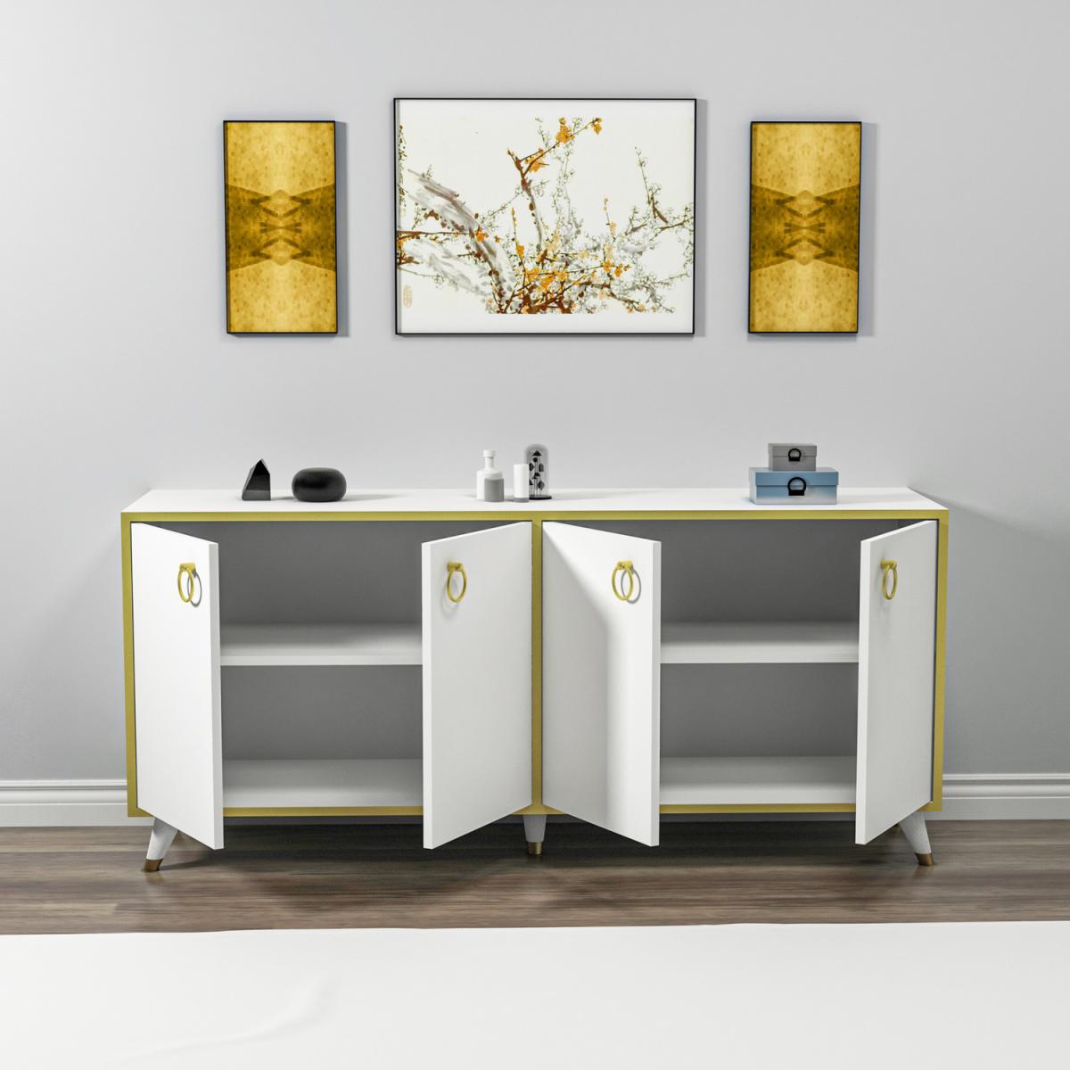 The sideboard has an elegant look with its metal handles. Also, you can store your utilities and other belongings. MATERIAL The sideboard is made of an 18 mm thick quality melamine-coated particleboard. The manufactured wood surface is water-resistant to some extent and the edges are banded with PVC edge banding tape. First-class assemblyinstallation hardware and accessories are used. Our products are produced from certified quality raw materials that do not contain carcinogenic substances and comply with European Union health norms. CLEANING You can clean your furniture with a dry cloth. Avoid prolonged contact of your product with moisture and water. ASSEMBLY The product will be delivered to the customer in the original package as disassembled. It is designed to be assembled by the customer using a power drill and screwdriver. Assembly instruction and installation hardware are included in the package. For fast and error-free installation, product parts are numbered with stickers in accordance with the assembly guide.