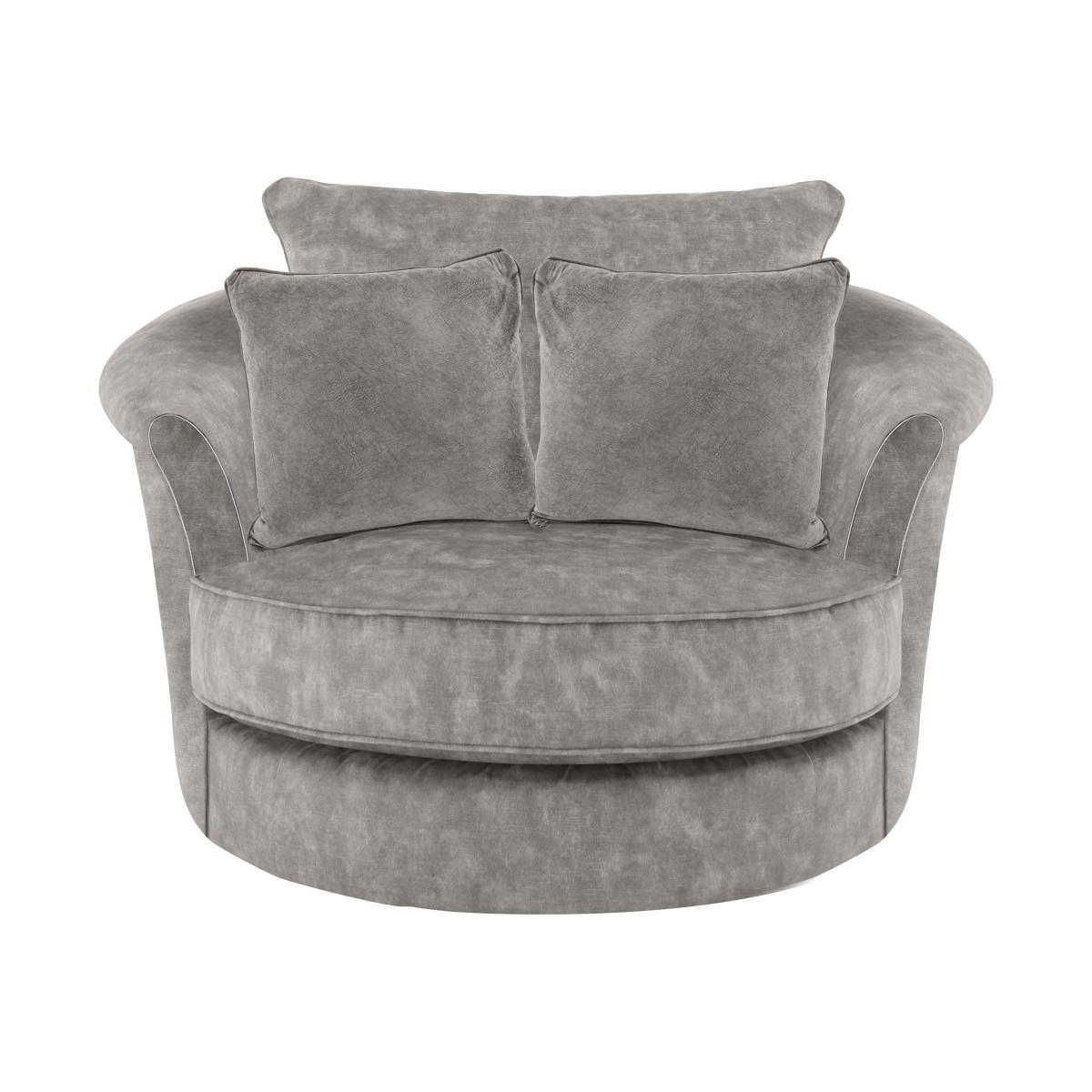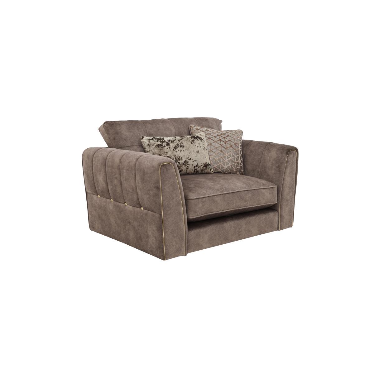 The perfect blend of modern elegance and luxury comfort, the Ariana Collection was designed to stand out. Grand in scale and contemporary in style, its generous, deep seats are upholstered in a unique fabric with the industrial look of leather but the incredible softness of luxury velvet for a truly indulgent lounging experience. Encore foam seats are sumptuously comfortable and keep their shape perfectly without re-plumping and a beautiful array of feather filled scatter cushions with a velvety sheen create a cushioned heaven. The elegant arms are decorated with delicate fluting and each piece comes with the option of brass or chrome studding and piping for a touch of opulence. Available in a variety of plush, gorgeous colours to complement the modern home. Handcrafted in the UK and exclusive to Furniture Village. This snuggler chair is roomy and luxurious, ideal for lounging. The unique twisting motion makes it ideal for lounging. The fabric upholstery is velvety soft, but has look of leather. With an indulgently comfy encore foam cushion, and scatters and bolster included. Why you’ll love it. Roomy, ultra-comfy twister snuggler chair. Velvet-soft fabric upholstery just like leather. Unique ‘twist’ motion. An indulgently luxe, glamorous way to lounge. Generously deep ‘spring-back’ encore foam seat cushion. Arms feature hand-sewn fluting, brass piping and studs. 2 reversible feather-filled scatters and 1 bolster cushion included. Beautifully handcrafted in the UK, exclusively for Furniture Village. What you need to know. Medium comfort level. Encore foam seat cushions spring back into shape. Unique fabric has the softness of velvet and the look of industrial leather. Sprung seat with firm front edge, webbed back suspension. Solid hardwood frame. Some fabrics can show wear on areas of more use or in direct sunlight. Plump, turn and rotate seat and back cushions regularly if possible. Please read our upholstery care guide for more advice. Part of the Ariana range including sofas, armchair and footstools.