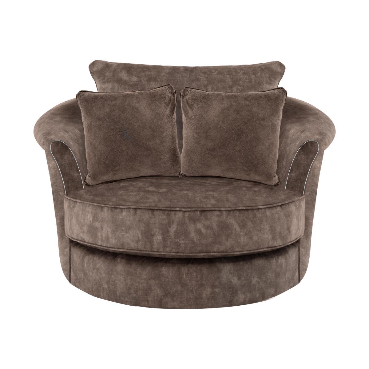 The perfect blend of modern elegance and luxury comfort, the Ariana Collection was designed to stand out. Grand in scale and contemporary in style, its generous, deep seats are upholstered in a unique fabric with the industrial look of leather but the incredible softness of luxury velvet for a truly indulgent lounging experience. Encore foam seats are sumptuously comfortable and keep their shape perfectly without re-plumping and a beautiful array of feather filled scatter cushions with a velvety sheen create a cushioned heaven. The elegant arms are decorated with delicate fluting and each piece comes with the option of brass or chrome studding and piping for a touch of opulence. Available in a variety of plush, gorgeous colours to complement the modern home. Handcrafted in the UK and exclusive to Furniture Village. This snuggler chair is roomy and luxurious, ideal for lounging. The unique twisting motion makes it ideal for lounging. The fabric upholstery is velvety soft, but has look of leather. With an indulgently comfy encore foam cushion, and scatters and bolster included. Why you’ll love it. Roomy, ultra-comfy twister snuggler chair. Velvet-soft fabric upholstery just like leather. Unique ‘twist’ motion. An indulgently luxe, glamorous way to lounge. Generously deep ‘spring-back’ encore foam seat cushion. Arms feature hand-sewn fluting, brass piping and studs. 2 reversible feather-filled scatters and 1 bolster cushion included. Beautifully handcrafted in the UK, exclusively for Furniture Village. What you need to know. Medium comfort level. Encore foam seat cushions spring back into shape. Unique fabric has the softness of velvet and the look of industrial leather. Sprung seat with firm front edge, webbed back suspension. Solid hardwood frame. Some fabrics can show wear on areas of more use or in direct sunlight. Plump, turn and rotate seat and back cushions regularly if possible. Please read our upholstery care guide for more advice. Part of the Ariana range including sofas, armchair and footstools.
