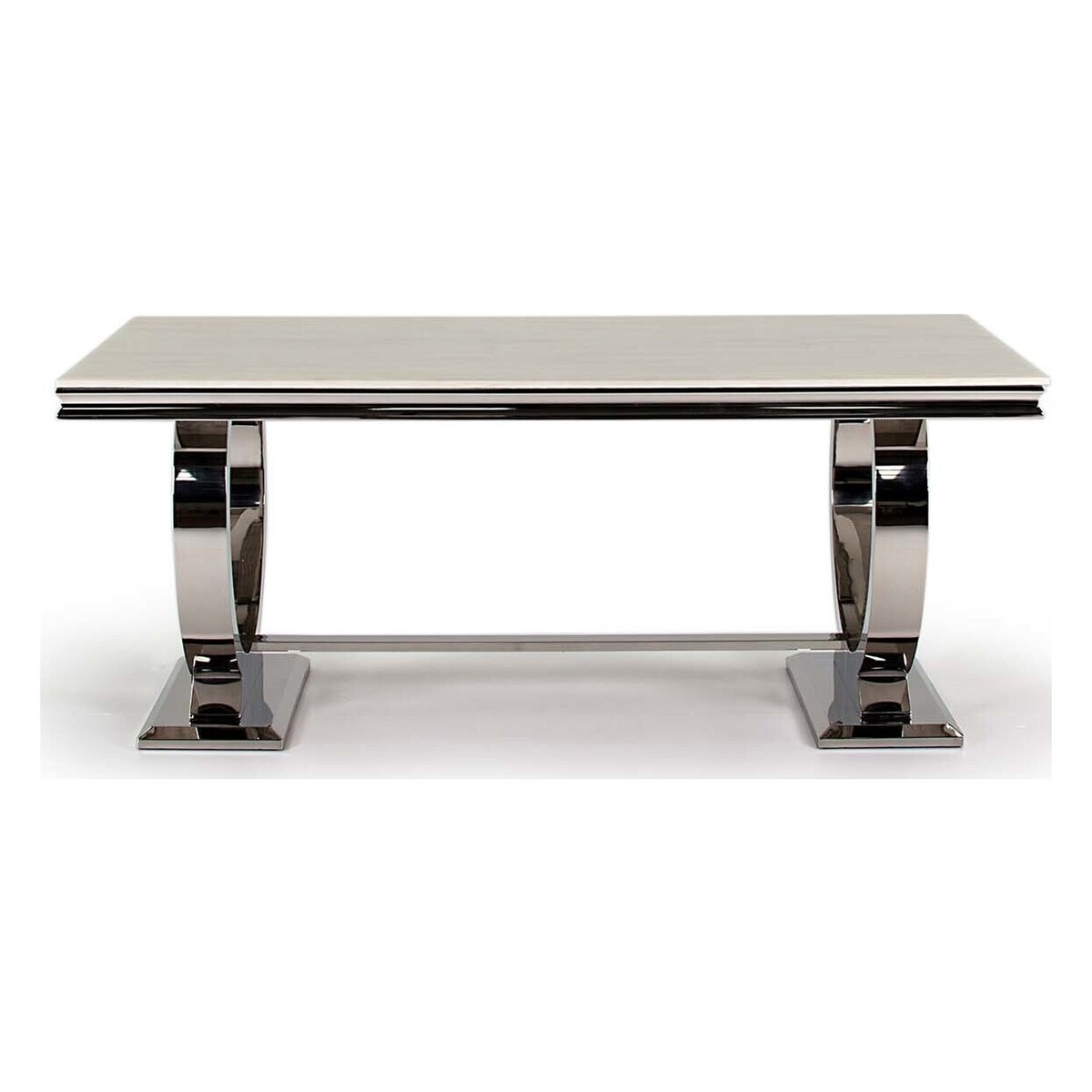 The Arianna Dining Table is a luxurious, high-end choice for many styles of home. It has an ultra-modern elegance to its design and brings together stunning materials to create a centre point for your dining space. The eye-catching polished stainless-steel frame is topped with a pristine cream marble tabletop, creating a beautiful setting for dinner. Sturdy yet stylish stainless-steel table frame. Beautiful warm cream marble tabletop. Comfortably seats up to 6 diners. Pairs perfectly with the wider Arianna Collection. Ground floor delivery only.
