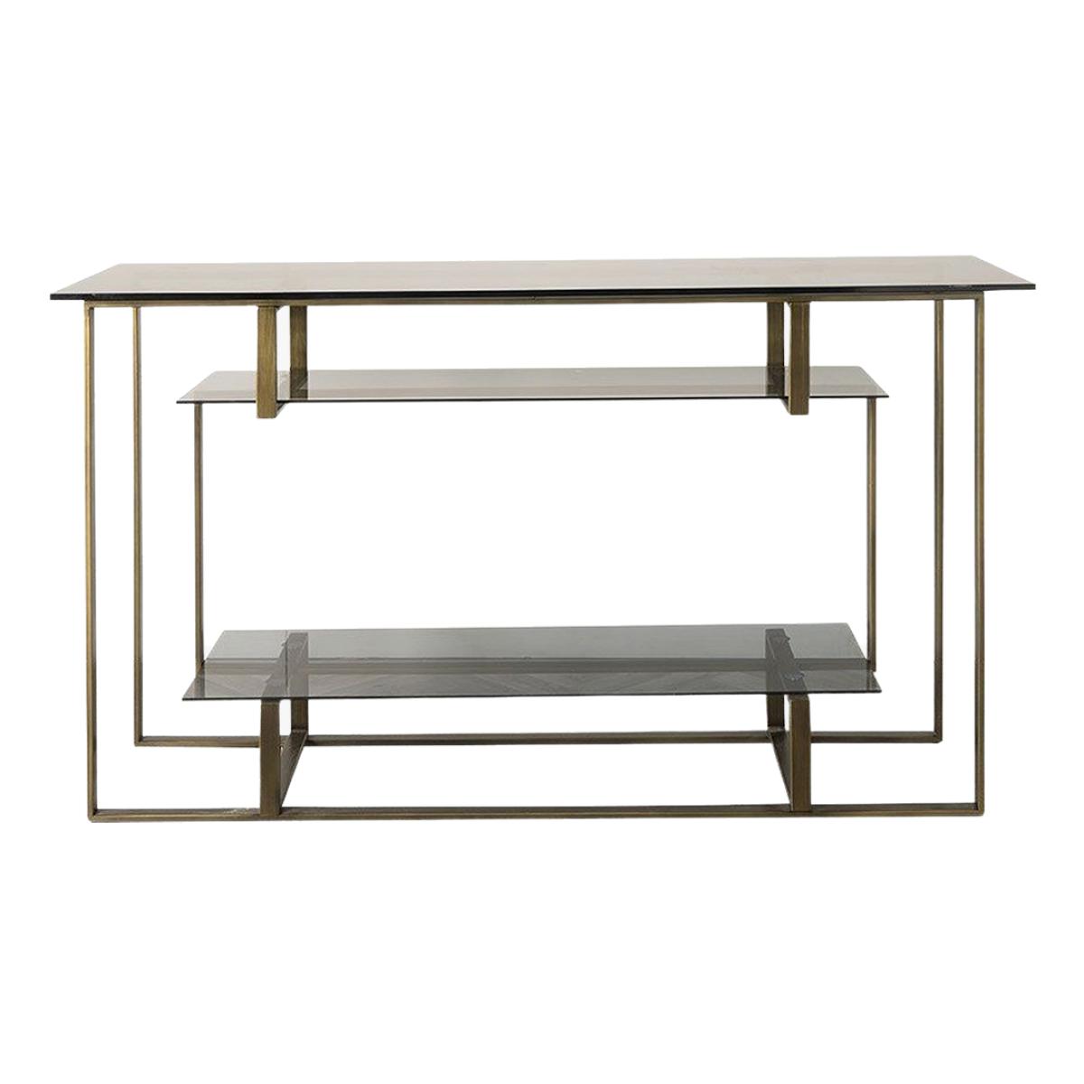 I love how this bronze console’s slim metal frame and smoked glass tiers bring both lightness and structure to a space. It works equally well in a modern minimalist hallway, an art-deco inspired living room or even a softer industrial scheme thanks to that warm metallic finish. For styling, anchor it with a large round mirror or statement artwork above, then layer a mix of decorative objects - think a sculptural vase, a pair of hardcover books and a small pot plant. Use the lower shelf for woven baskets or neat storage boxes to keep clutter at bay, and add a table lamp at one end to create a cosy glow in the evening.