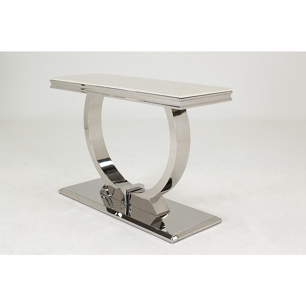 The Arianna Console Table is a stylish way of adding a touch of glamour to any modern home. Combining highly polished stainless-steel with an elegant and warm cream marble tabletop, this table lends itself to many areas of the home. It's ideal for hallways thanks to its slim profile and it teams easily with other pieces from the Arianna Collection. Warm cream marble tabletop. Highly polished stainless-steel frame. Glamorous accent piece for any modern interior. Coordinate with other pieces in the Arianna Collection.