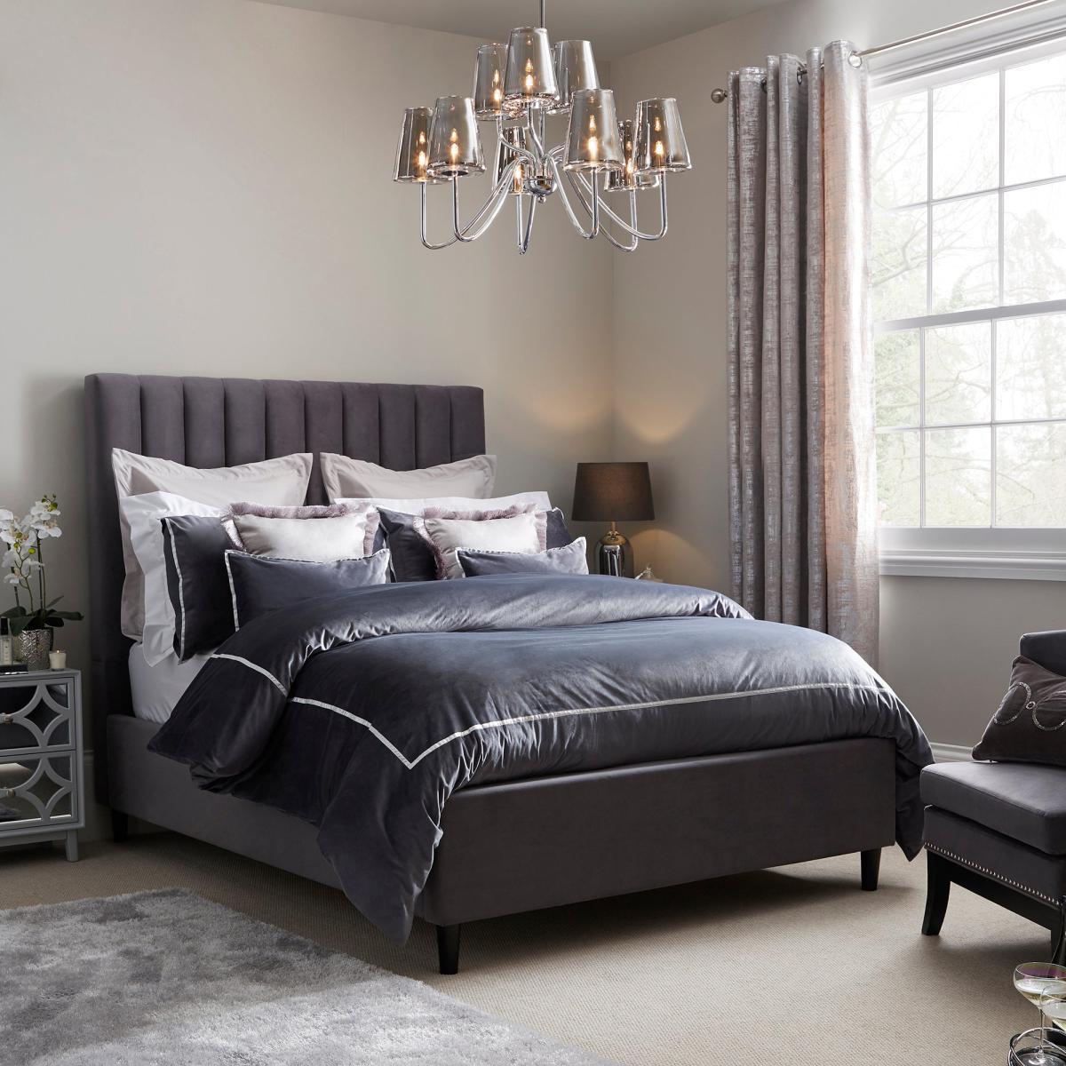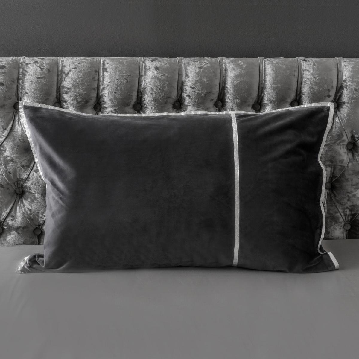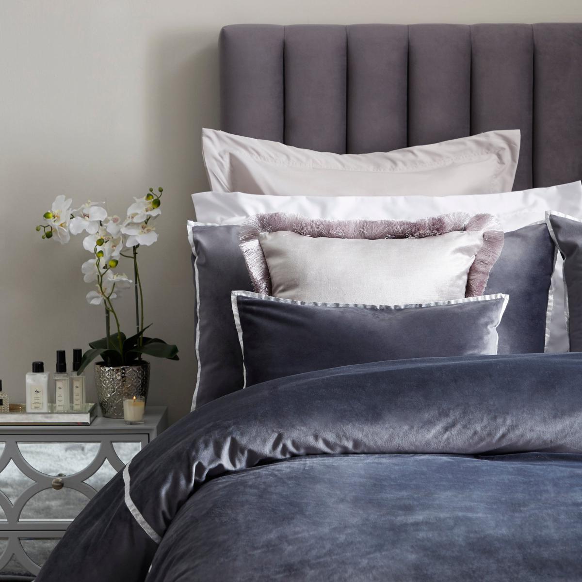 Style your bedroom with our glamorous Arianna bedlinen created in opulent velvet with metallic silver piping and ribbon detail. This luxurious duvet set is styled in elegant grey and crafted from durable synthetic fibres for easy care and durability. This velvet duvet cover and pillowcase set is perfect for styling your bed like a luxury hotel as it boasts elegance, comfort and sophistication. Additional coordinating accessories are available.