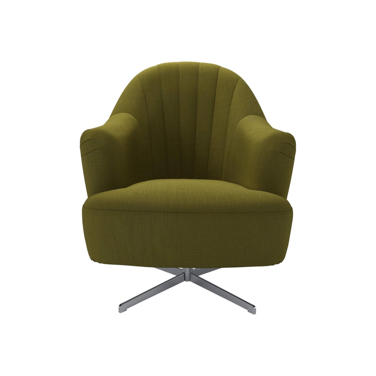 I love this armchair for its bold colour and contemporary silhouette, which make it an instant statement piece. The Royal Fern Brushed Linen Cotton fabric adds subtle texture and a hint of luxury, making it versatile enough to sit in both modern and more traditional interiors. It works particularly well in living rooms or bedrooms as a standout accent, especially when paired with neutral tones to let the colour pop, or with other rich jewel tones for a layered look. Practical styling tips include placing a cosy throw or decorative cushions to enhance its inviting feel, and considering its swivel base when positioning it for easy access and flexibility in seating arrangements.