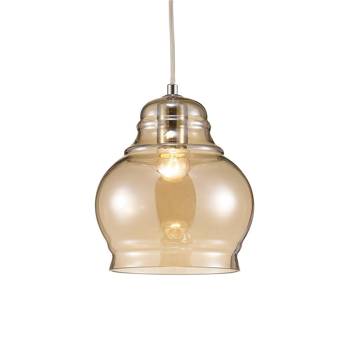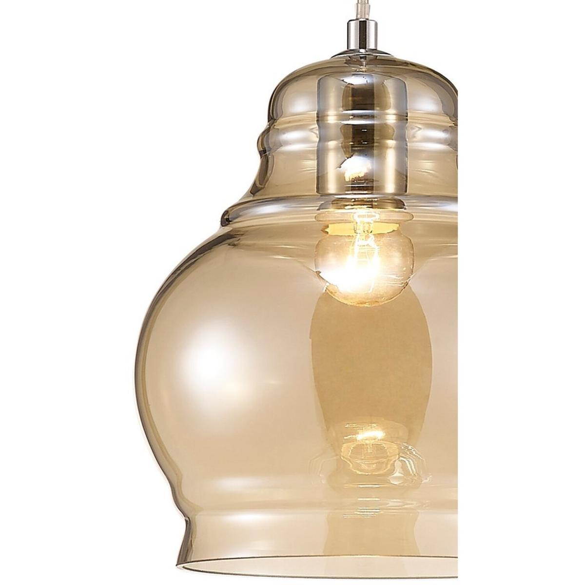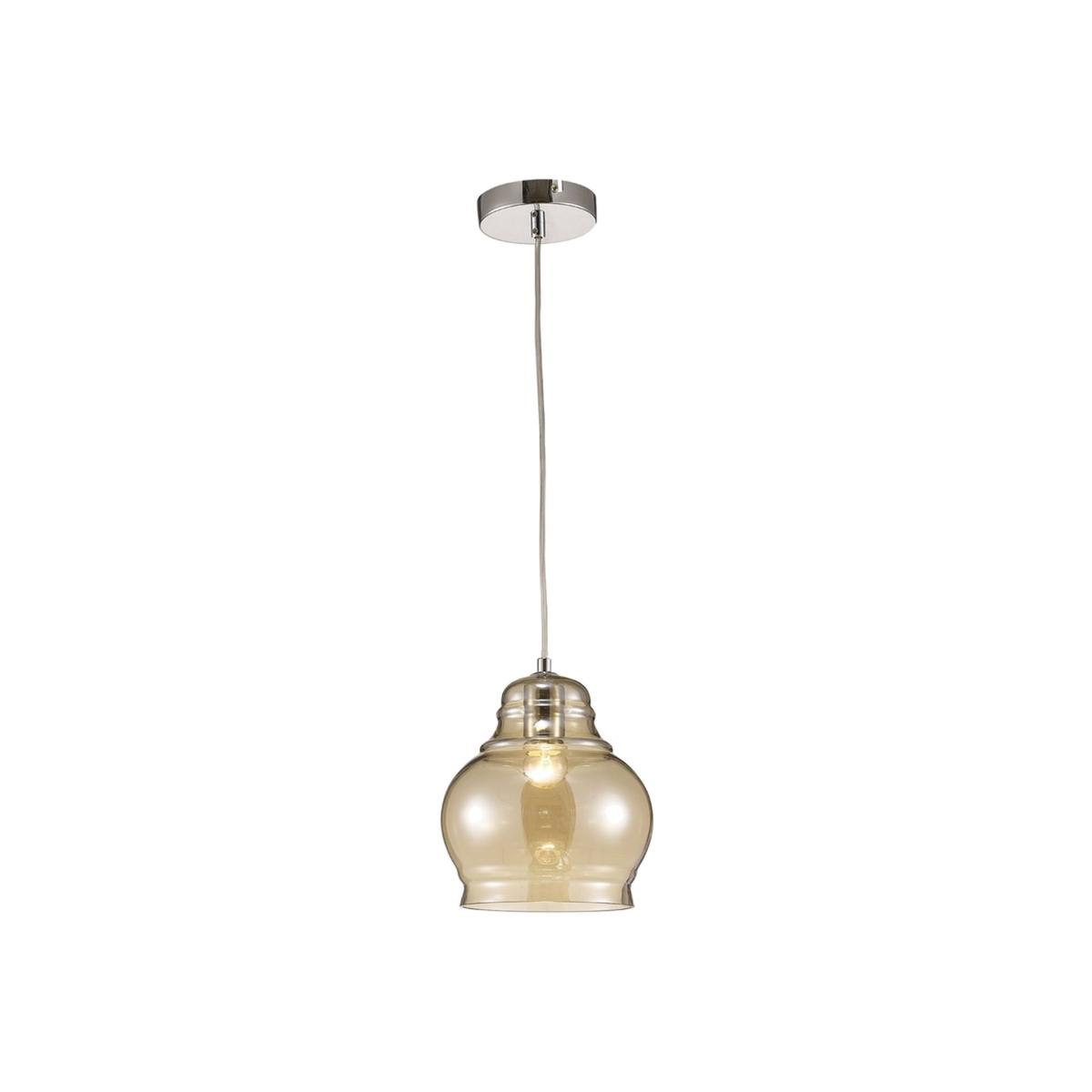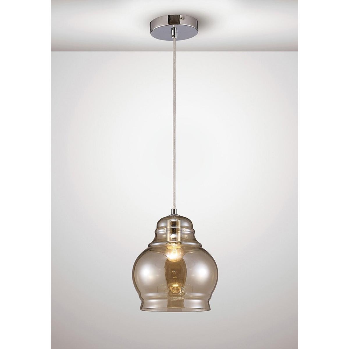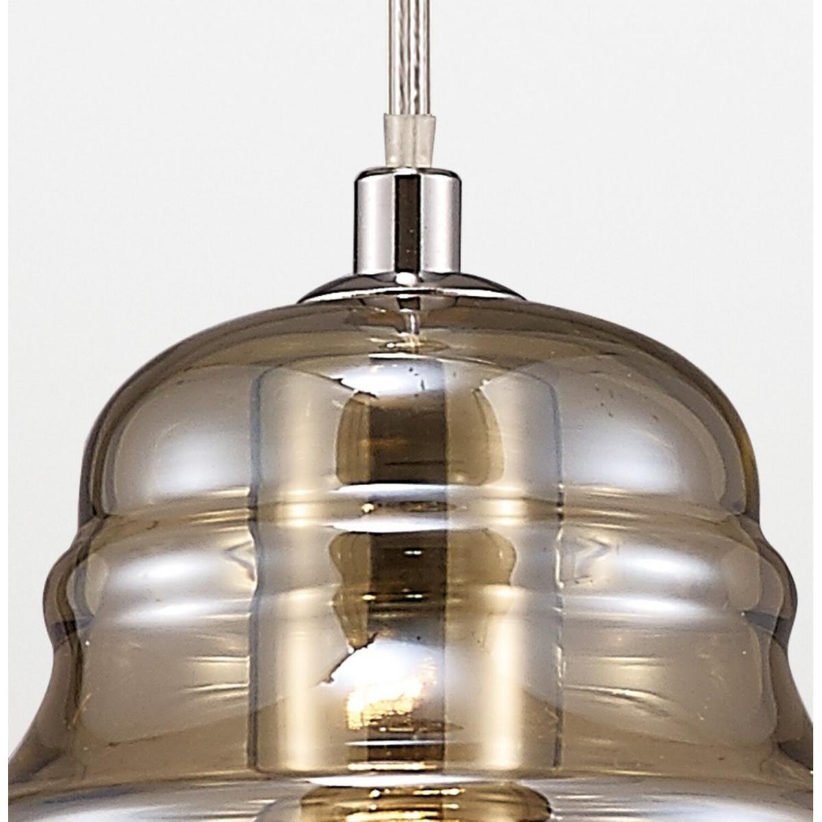 Available in two different colour finishes and 3 unique designs this range creates a modern lampshade effect using slim, round and bell shapes in various sizes and coloured glass. All three pendant sizes have a colour option of either polished chrome and smoked glass or polished chrome and cognac glass. The translucent glass creates a stunning optical effect when the pendants are illuminated. The smaller pendants take an E27 maximum 40W lamp whilst the larger pendants take an E27 maximum 60W lamp.