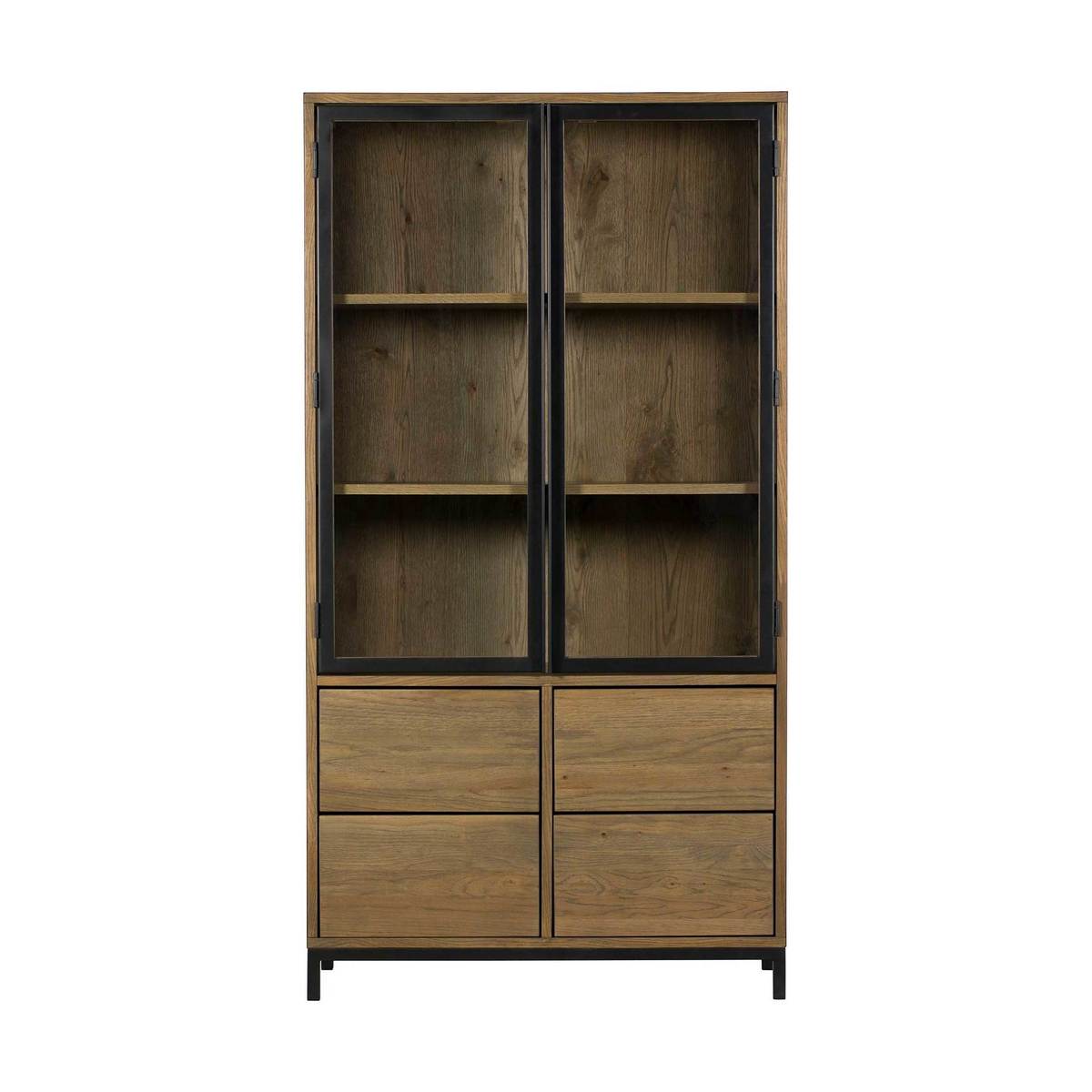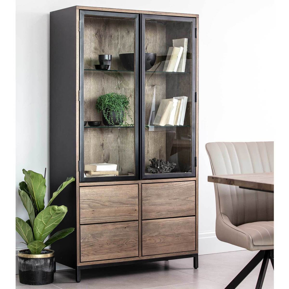 A stylish storage solution that offers an urban industrial look to homes with a combination of rustic oak veneer and metal accents, the Ariela Display Cabinet is an attractive means of stowing your possessions.;Suitable for living areas, dining areas, studies and even kitchens, 4 large drawers provide plenty of space for filing away whatever you like, while the glass doors and internal shelving allow you to tastefully arrange your favourite accessories, books and trinkets. Illuminated by internal lighting, make a statement as well as using the practical space the Ariela offers.