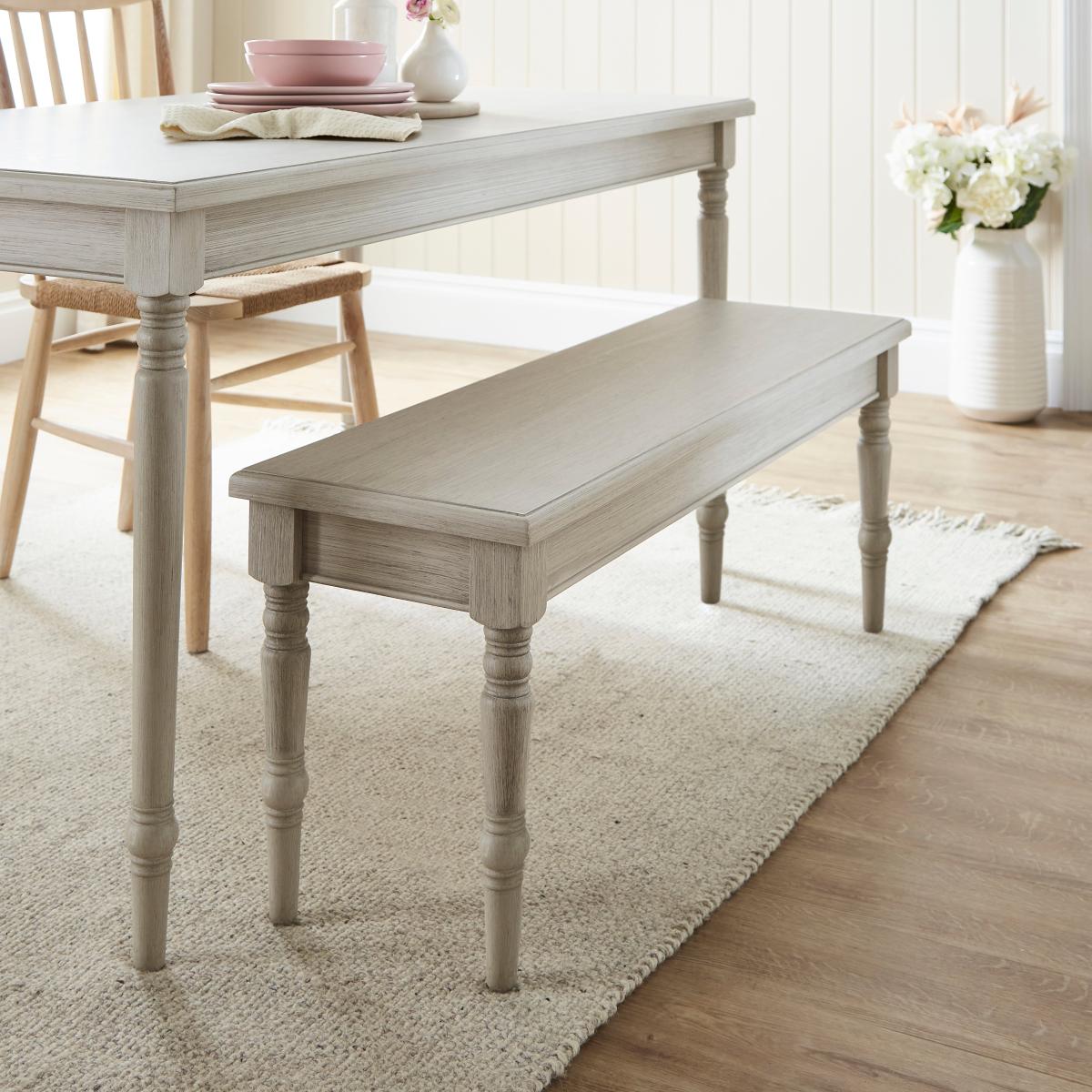 Bring a touch of timeless charm to your home with this gorgeous dining bench, that matches perfectly with our Ariella Dining Table. It seats up to 2, and its grey, woodgrain finish will complement almost any decor.