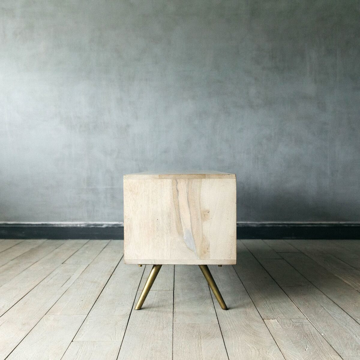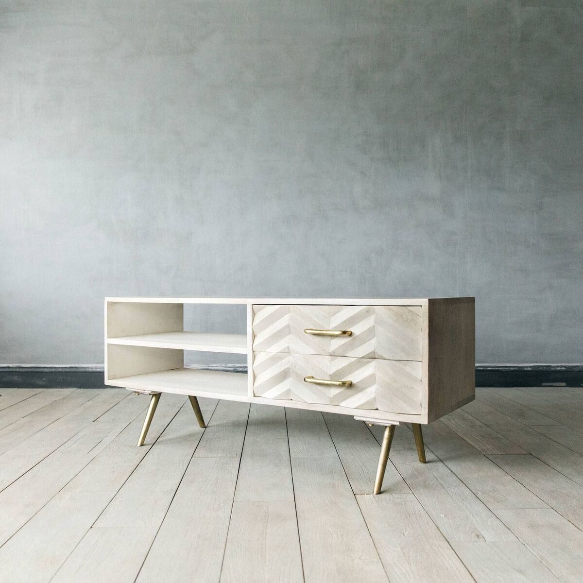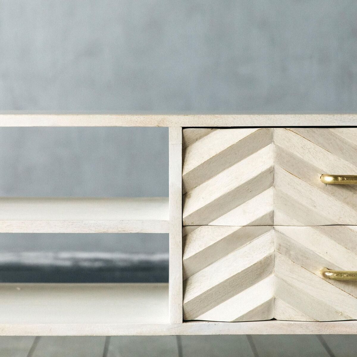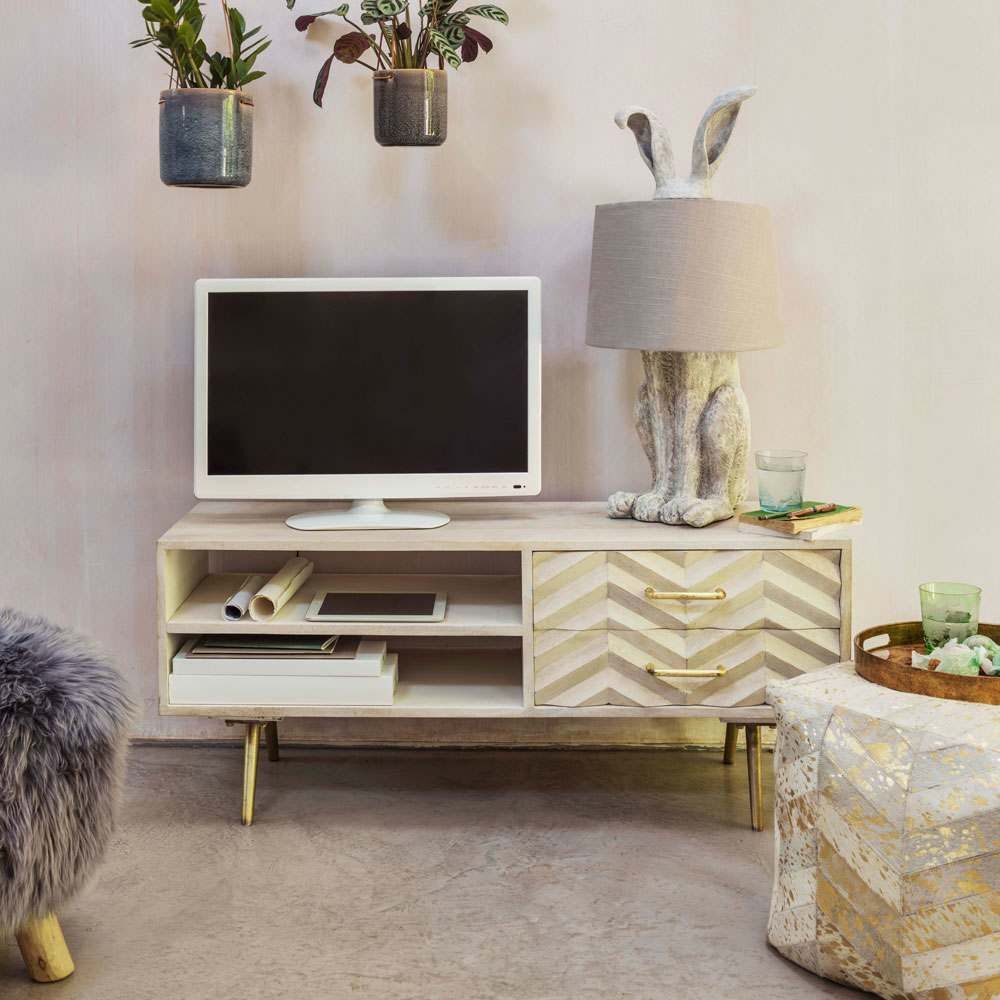 Our Ariella Chevron TV stand balances mid-century design and modern styling to a tee. Handcrafted from bleached mango wood with brass plated hairpin legs and matching handles, the raised chevron feature front ensures a distinctive piece of furniture for your bedroom or sitting room. With two drawers and two additional shelves for storage.