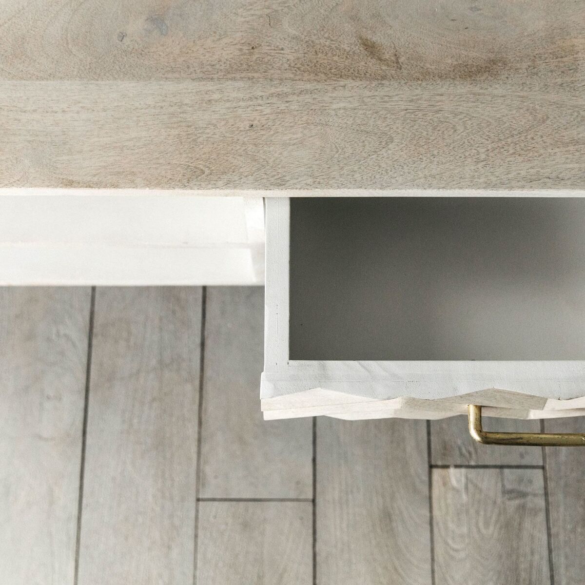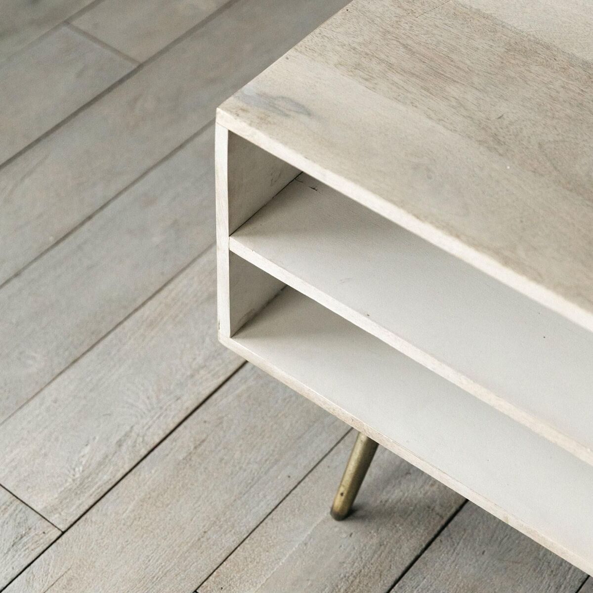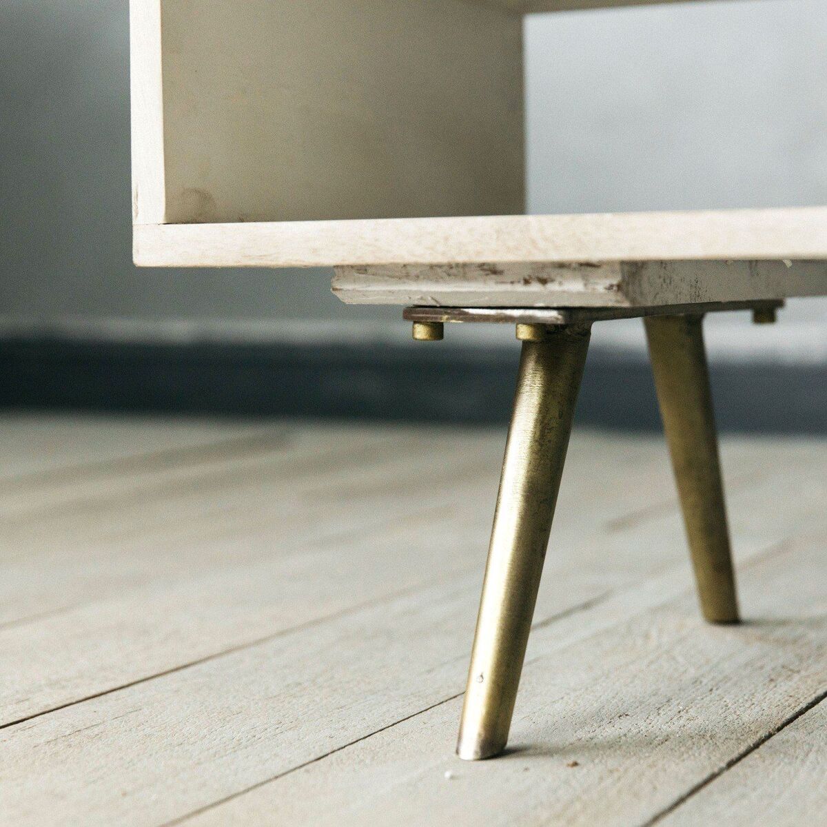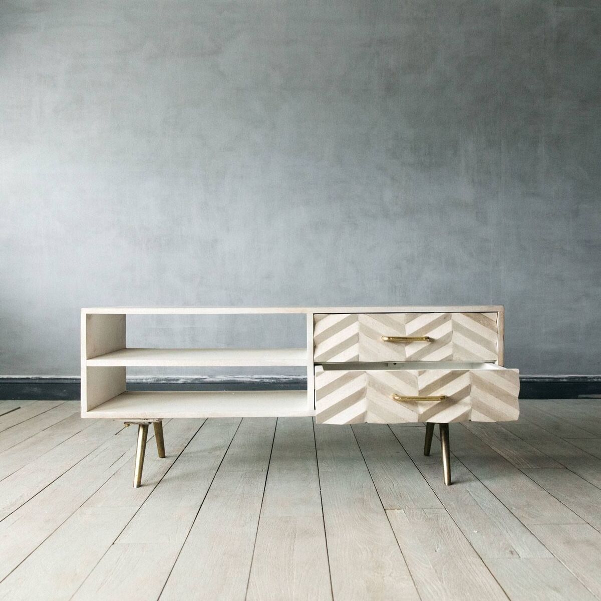 Our Ariella Chevron TV stand balances mid-century design and modern styling to a tee. Handcrafted from bleached mango wood with brass plated hairpin legs and matching handles, the raised chevron feature front ensures a distinctive piece of furniture for your bedroom or sitting room. With two drawers and two additional shelves for storage.