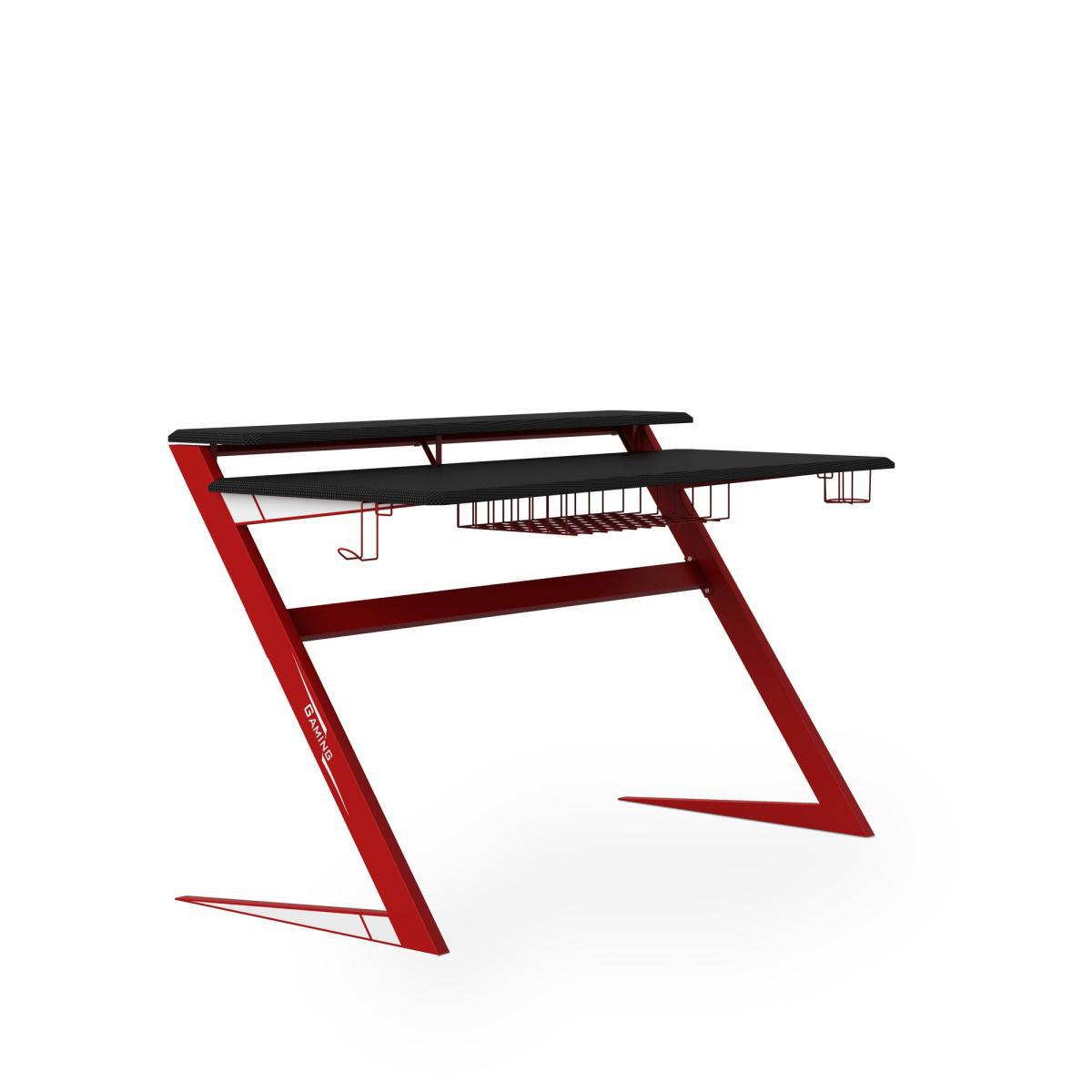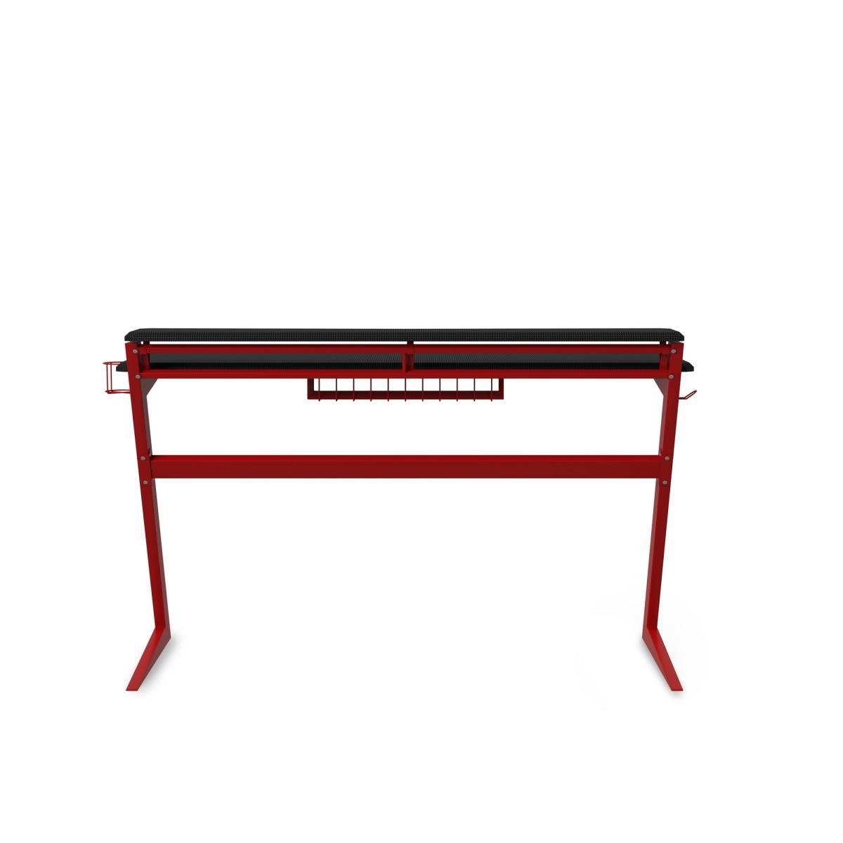 Finished in contrasting red and black colours with white accents, the Aries gaming desk would add a striking, modern edge to any bedroom or office space. The sleek angled steel frame supports a tough carbon fibre effect worktop, complete with raised platform to support multiple monitors and ensure you free up your workspace. The customisable add-on drinks holder, headphone rack and underdesk wire storage tray make it easy to keep your desk clutter free, whilst maintaining the same modern style.