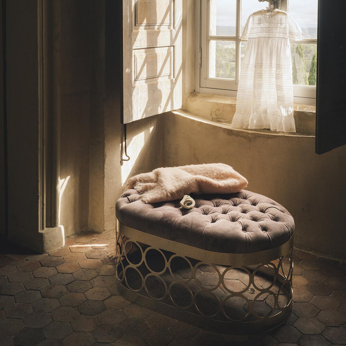 Sophisticated and chic, the Dusty Rose Ottoman will make a stylish statement in your nursery. An elegant place to perch, this ottoman features a lush, tufted top in a pink tone and golden steel base. Whether you use in the nursery, dressing room or living room, it’ll look right at home. It can also be converted into an heirloom piece you'll treasure for years to come with more accessories from Aristot.