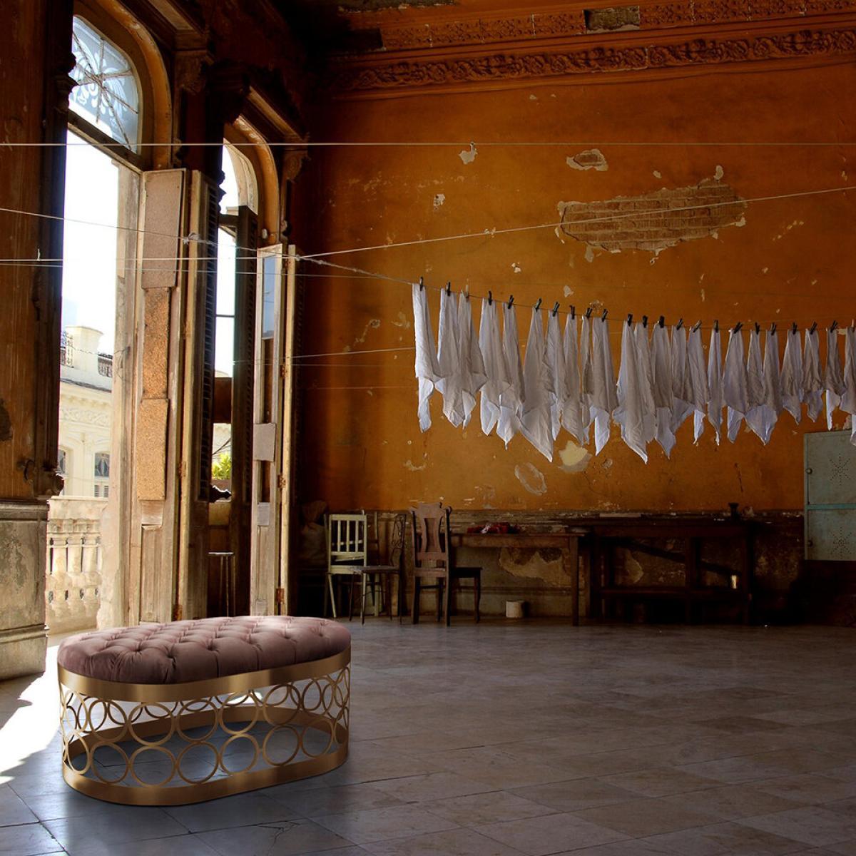 I love this pouffe for its elegant combination of soft velvet in a dusty rose hue and the striking gold-finished metal base, which adds a touch of glamour without being overpowering. It works particularly well in chic, contemporary interiors or luxe vintage-inspired schemes, where it can act as both a statement piece and a functional footstool. Practical styling tips include pairing it with neutral sofas or complementing it with other rose tones or gold accents for a cohesive look. It's versatile enough to be used in living rooms, bedrooms, or dressing areas, providing extra seating or a luxurious spot to rest your feet while adding a layer of sophistication to the space.