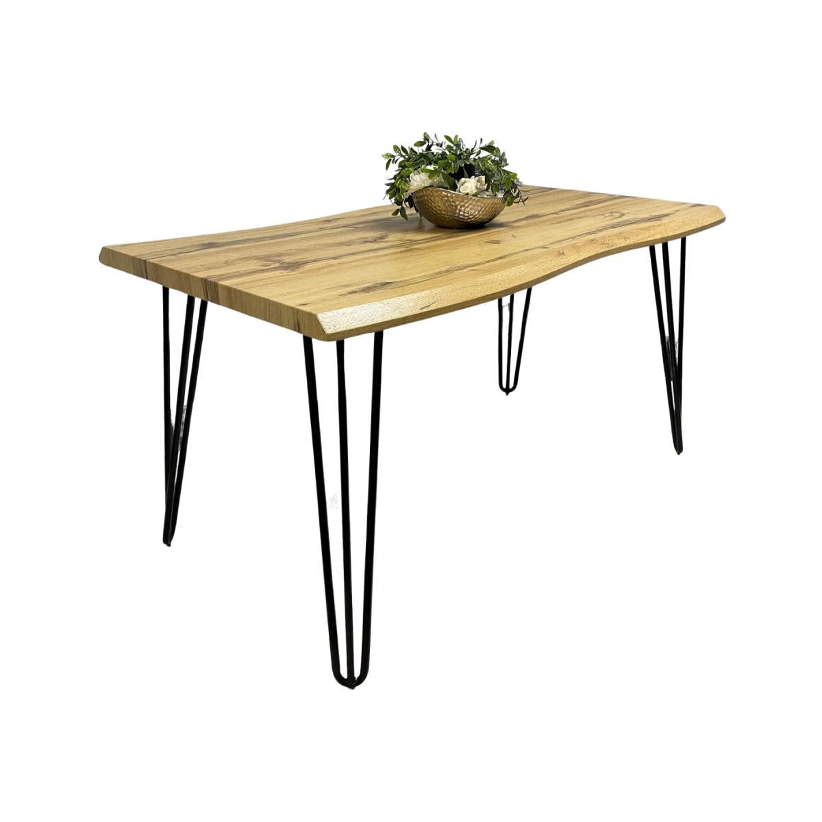 Enhance your space with this rustic wooden dining table, perfect for dining, work, or study. The curved live edge tabletop adds a natural organic touch, while sleek black metal hairpin legs offer sturdy support and a modern aesthetic. Spacious and versatile, this table blends effortlessly with contemporary, farmhouse, or classic interiors. Easy to assemble for quick setup, it is a functional and stylish centerpiece for any room.