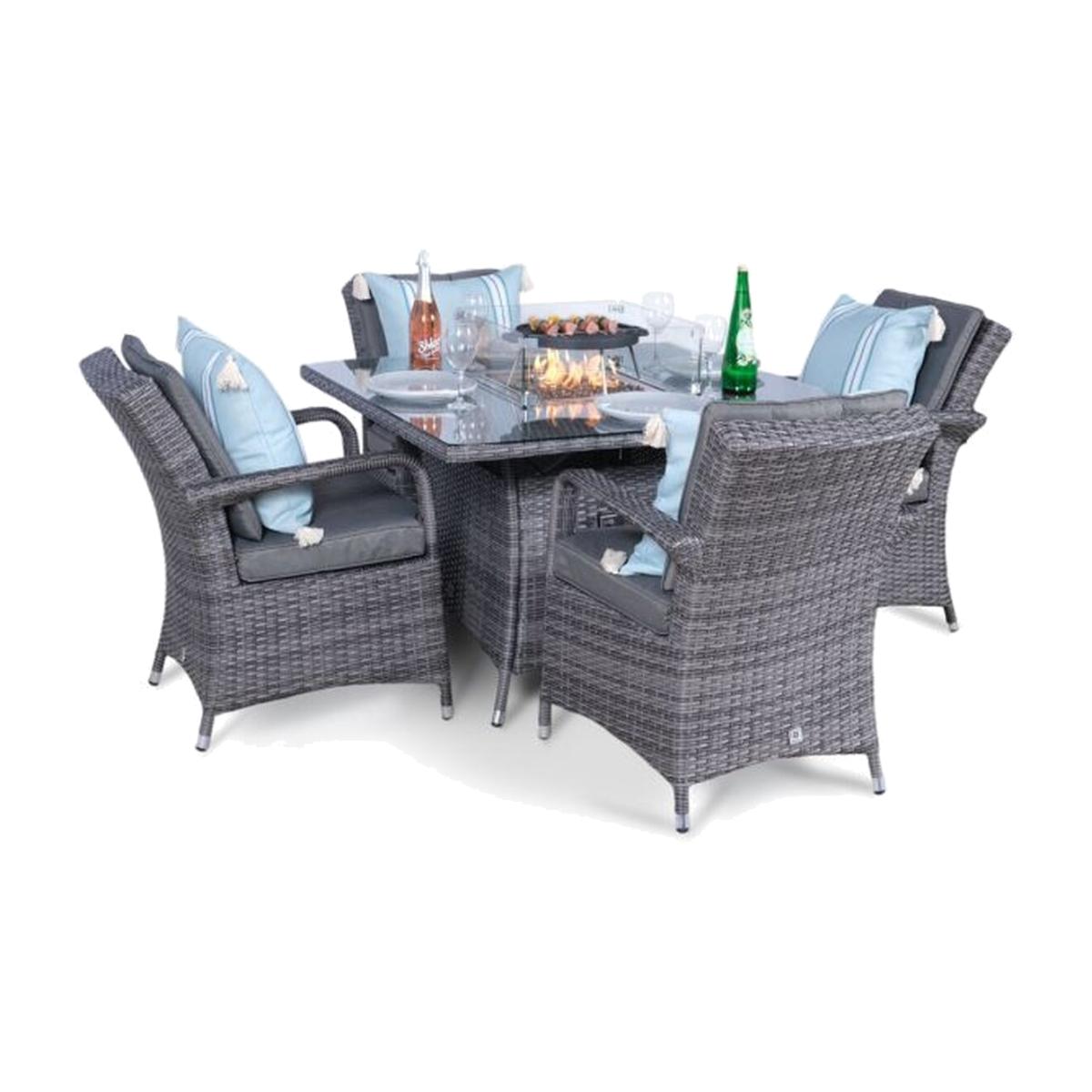 Relax and dine in style with the luxurious Arizona rattan dining set with fire pit by Giardino. Designed to be the focal point of your outdoor living space, the Arizona fire pit garden set consists of a feature packed gas fire pit table with grill, luxury padded dining chairs and all weather cover. The Arizona rattan dining set's statement feature is its luxury rattan dining chairs with wide curved armrests and contoured high backrests, this is one of our most comfortable and stylish outdoor rattan dining sets. The Arizona rattan dining table and chairs set is available in 4, 6 or 8 seater options and comes in an ultra-stylish mixed grey weave or the stunning mixed brown weave.