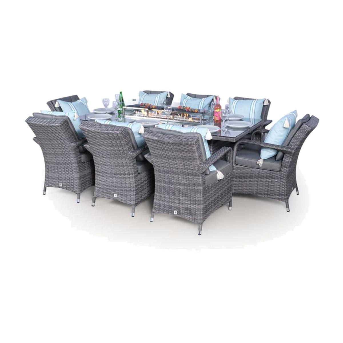 Relax and dine in style with the luxurious Arizona rattan dining set with fire pit by Giardino. Designed to be the focal point of your outdoor living space, the Arizona fire pit garden set consists of a feature packed gas fire pit table with grill, luxury padded dining chairs and all weather cover. The Arizona rattan dining set's statement feature is its luxury rattan dining chairs with wide curved armrests and contoured high backrests, this is one of our most comfortable and stylish outdoor rattan dining sets. The Arizona rattan dining table and chairs set is available in 4, 6 or 8 seater options and comes in an ultra-stylish mixed grey weave or the stunning mixed brown weave.