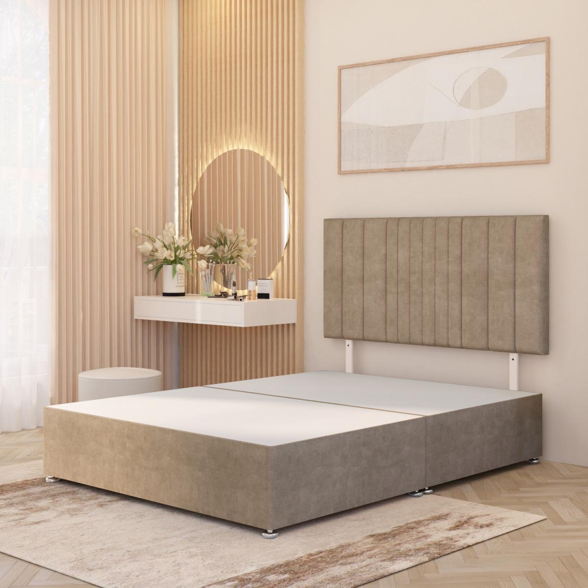 The Arizona Plush Velvet Divan Bed Base with 32" Upholstered strut Headboard combines luxury design with durable everyday support. The solid platform top divan base provides a stable, firm foundation for your mattress, enhancing comfort and delivering superior all round support compared to slatted frames. Expertly crafted in the UK from quality timber and upholstered in luxurious plush velvet fabric, this bed set adds refined elegance to both classic and modern interiors. The tall 32" upholstered headboard features vertical panel cushioning, offering a contemporary look that doubles as a comfortable backrest for sitting up in bed, at 32" in height for the face panel, this headboard makes a grand statement in your bedroom, elevating your bed, in comparison to much smaller 24" headboards. The divan base measures 34.5cm in height with gliders attached (30.5cm without) and is available in all standard UK sizes 2FT. 6 Small Single, 3FT Single, 4FT Small Double, 4FT. 6 Double, 5FT King, and 6FT Super King. For added practicality, choose from multiple storage drawer options including No Drawers, 2 Drawers (same side), or 4 Drawers, making this velvet divan bed with headboard both stylish and functional. Headboard height is 32"86cm, you can adjust the placement depending on how you position and fix the struts into your bed.