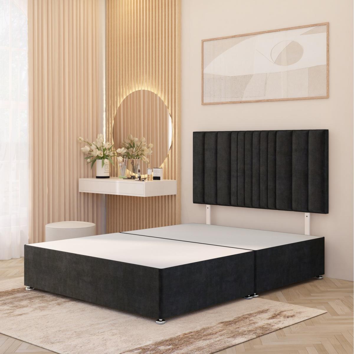 The Arizona Plush Velvet Divan Bed Base with 32" Upholstered strut Headboard combines luxury design with durable everyday support. The solid platform top divan base provides a stable, firm foundation for your mattress, enhancing comfort and delivering superior all round support compared to slatted frames. Expertly crafted in the UK from quality timber and upholstered in luxurious plush velvet fabric, this bed set adds refined elegance to both classic and modern interiors. The tall 32" upholstered headboard features vertical panel cushioning, offering a contemporary look that doubles as a comfortable backrest for sitting up in bed, at 32" in height for the face panel, this headboard makes a grand statement in your bedroom, elevating your bed, in comparison to much smaller 24" headboards. The divan base measures 34.5cm in height with gliders attached (30.5cm without) and is available in all standard UK sizes 2FT. 6 Small Single, 3FT Single, 4FT Small Double, 4FT. 6 Double, 5FT King, and 6FT Super King. For added practicality, choose from multiple storage drawer options including No Drawers, 2 Drawers (same side), or 4 Drawers, making this velvet divan bed with headboard both stylish and functional. Headboard height is 32"86cm, you can adjust the placement depending on how you position and fix the struts into your bed.