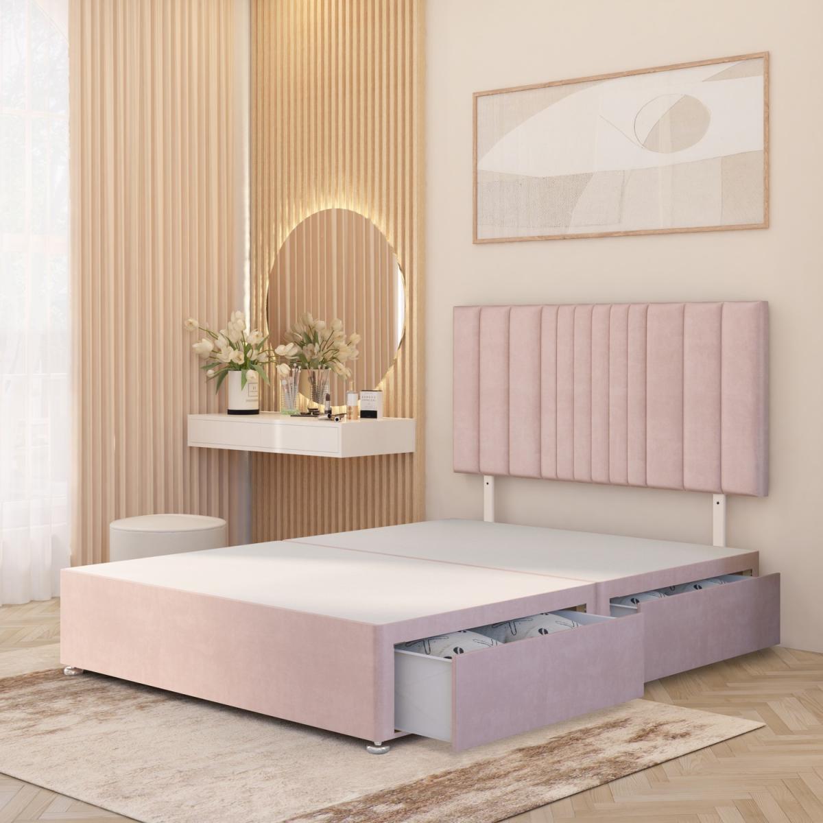 The Arizona Plush Velvet Divan Bed Base with 32" Upholstered strut Headboard combines luxury design with durable everyday support. The solid platform top divan base provides a stable, firm foundation for your mattress, enhancing comfort and delivering superior all round support compared to slatted frames. Expertly crafted in the UK from quality timber and upholstered in luxurious plush velvet fabric, this bed set adds refined elegance to both classic and modern interiors. The tall 32" upholstered headboard features vertical panel cushioning, offering a contemporary look that doubles as a comfortable backrest for sitting up in bed, at 32" in height for the face panel, this headboard makes a grand statement in your bedroom, elevating your bed, in comparison to much smaller 24" headboards. The divan base measures 34.5cm in height with gliders attached (30.5cm without) and is available in all standard UK sizes 2FT. 6 Small Single, 3FT Single, 4FT Small Double, 4FT. 6 Double, 5FT King, and 6FT Super King. For added practicality, choose from multiple storage drawer options including No Drawers, 2 Drawers (same side), or 4 Drawers, making this velvet divan bed with headboard both stylish and functional. Headboard height is 32"86cm, you can adjust the placement depending on how you position and fix the struts into your bed. An excellent space saving storage bed. Drawers can be placed left or right side as the headboard fits either end of the base.