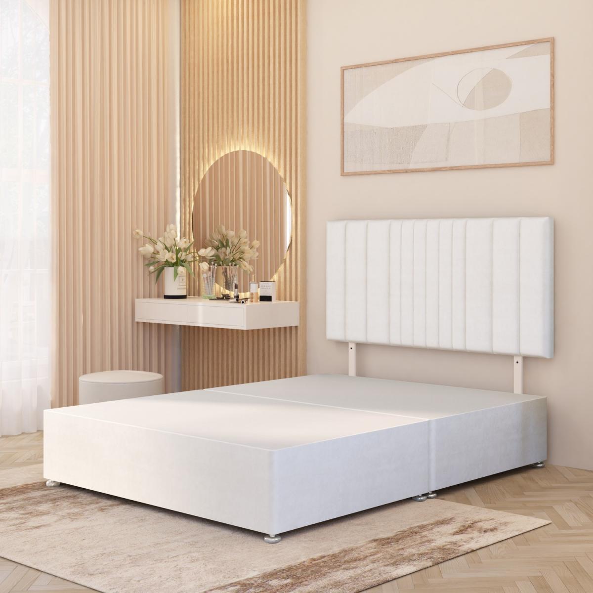 The Arizona Plush Velvet Divan Bed Base with 32" Upholstered strut Headboard combines luxury design with durable everyday support. The solid platform top divan base provides a stable, firm foundation for your mattress, enhancing comfort and delivering superior all round support compared to slatted frames. Expertly crafted in the UK from quality timber and upholstered in luxurious plush velvet fabric, this bed set adds refined elegance to both classic and modern interiors. The tall 32" upholstered headboard features vertical panel cushioning, offering a contemporary look that doubles as a comfortable backrest for sitting up in bed, at 32" in height for the face panel, this headboard makes a grand statement in your bedroom, elevating your bed, in comparison to much smaller 24" headboards. The divan base measures 34.5cm in height with gliders attached (30.5cm without) and is available in all standard UK sizes 2FT. 6 Small Single, 3FT Single, 4FT Small Double, 4FT. 6 Double, 5FT King, and 6FT Super King. For added practicality, choose from multiple storage drawer options including No Drawers, 2 Drawers (same side), or 4 Drawers, making this velvet divan bed with headboard both stylish and functional. Headboard height is 32"86cm, you can adjust the placement depending on how you position and fix the struts into your bed.