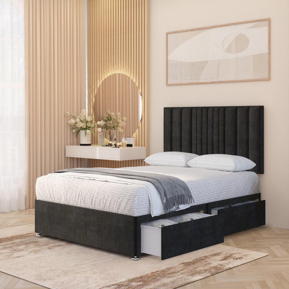 The Plush Velvet Divan Bed Set with Upholstered Headboard blends timeless design with lasting comfort. Its solid platform top divan base ensures strength, durability, and the perfect surface to enhance mattress performance. Upholstered in luxurious plush velvet, both base and headboard add elegance and a refined finish to any bedroom. The set includes a 32" tall headboard with vertical panel design and a 28cm deep Hybrid Midnight Orthopaedic Pocket Spring Mattress. The mattress features individually nested pocket springs for personalised support, reducing partner disturbance and improving comfort. A 7-zone orthopaedic system relieves pressure on shoulders, hips, and back, while layers of luxury foams contour the body and provide bounce-back resilience. The breathable mattress core helps regulate temperature, and the soft-touch cashmere fabric with hand tufting creates a supportive and durable sleep surface. Available in all UK sizes from Small Single to Super King, this set is proudly UK manufactured to the highest standard. Base height is 30.5cm, with gliders attached it is 34.5cm. This option bed comes with 2 easy access storage drawers. Headboard can be placed in either end of the base, so you can either have both drawers facing on the right side, or left side.