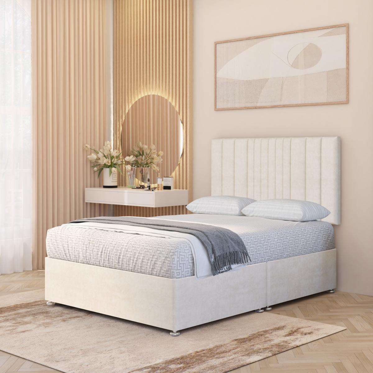 The Plush Velvet Divan Bed Set with Upholstered Headboard blends timeless design with lasting comfort. Its solid platform top divan base ensures strength, durability, and the perfect surface to enhance mattress performance. Upholstered in luxurious plush velvet, both base and headboard add elegance and a refined finish to any bedroom. The set includes a 32" tall headboard with vertical panel design and a 28cm deep Hybrid Midnight Orthopaedic Pocket Spring Mattress. The mattress features individually nested pocket springs for personalised support, reducing partner disturbance and improving comfort. A 7-zone orthopaedic system relieves pressure on shoulders, hips, and back, while layers of luxury foams contour the body and provide bounce-back resilience. The breathable mattress core helps regulate temperature, and the soft-touch cashmere fabric with hand tufting creates a supportive and durable sleep surface. Available in all UK sizes from Small Single to Super King, this set is proudly UK manufactured to the highest standard. Base height is 30.5cm, with gliders attached it is 34.5cm.