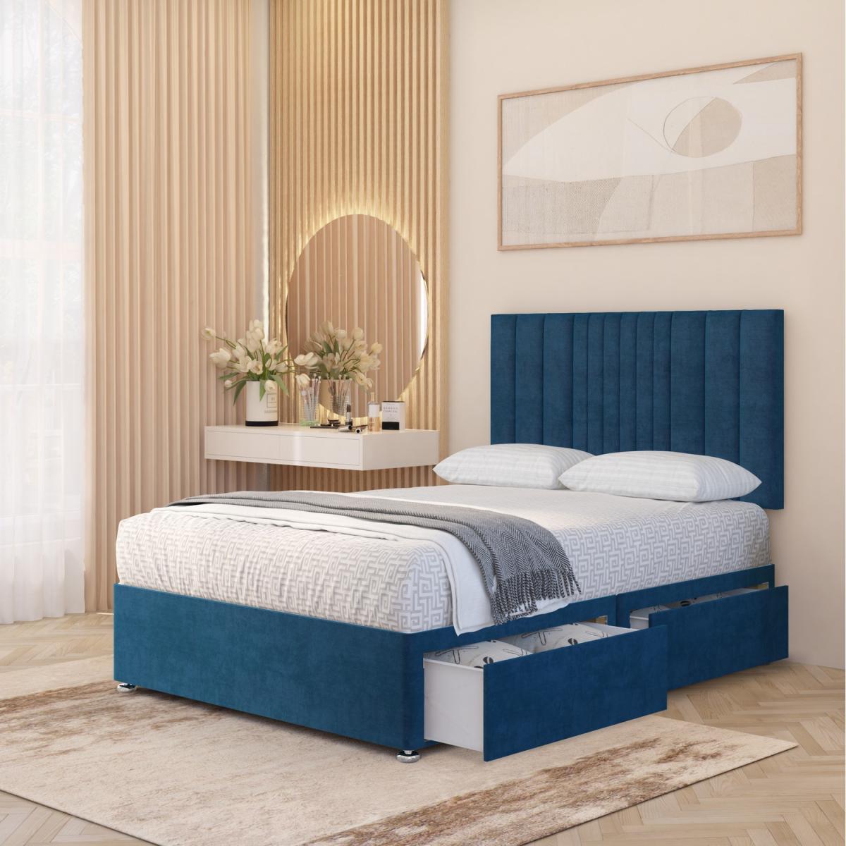 The Plush Velvet Divan Bed Set with Upholstered Headboard blends timeless design with lasting comfort. Its solid platform top divan base ensures strength, durability, and the perfect surface to enhance mattress performance. Upholstered in luxurious plush velvet, both base and headboard add elegance and a refined finish to any bedroom. The set includes a 32" tall headboard with vertical panel design and a 28cm deep Hybrid Midnight Orthopaedic Pocket Spring Mattress. The mattress features individually nested pocket springs for personalised support, reducing partner disturbance and improving comfort. A 7-zone orthopaedic system relieves pressure on shoulders, hips, and back, while layers of luxury foams contour the body and provide bounce-back resilience. The breathable mattress core helps regulate temperature, and the soft-touch cashmere fabric with hand tufting creates a supportive and durable sleep surface. Available in all UK sizes from Small Single to Super King, this set is proudly UK manufactured to the highest standard. Base height is 30.5cm, with gliders attached it is 34.5cm. This option storage bed comes with 4 easy access storage drawers, 2 on each side.