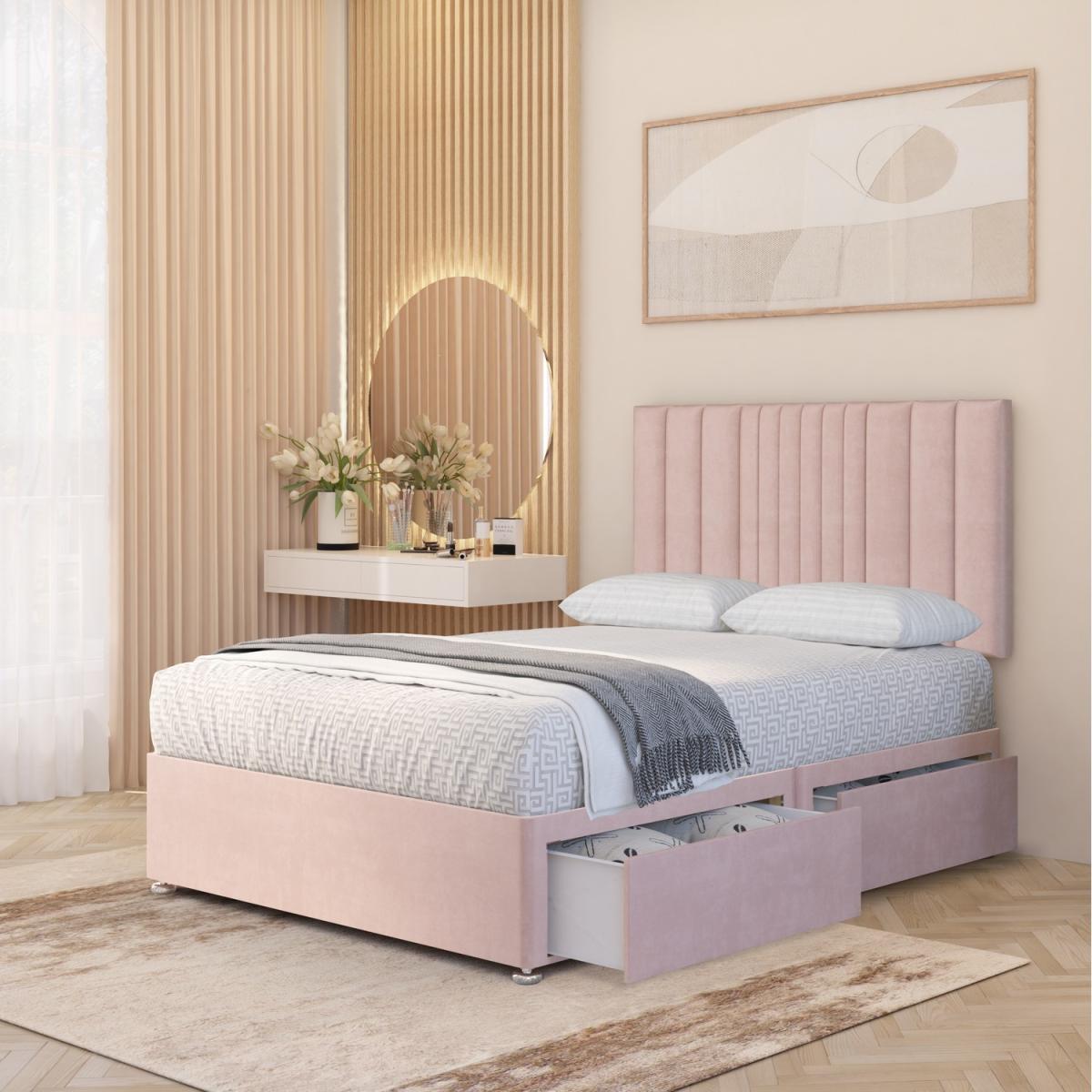 The Plush Velvet Divan Bed Set with Upholstered Headboard blends timeless design with lasting comfort. Its solid platform top divan base ensures strength, durability, and the perfect surface to enhance mattress performance. Upholstered in luxurious plush velvet, both base and headboard add elegance and a refined finish to any bedroom. The set includes a 32" tall headboard with vertical panel design and a 28cm deep Hybrid Midnight Orthopaedic Pocket Spring Mattress. The mattress features individually nested pocket springs for personalised support, reducing partner disturbance and improving comfort. A 7-zone orthopaedic system relieves pressure on shoulders, hips, and back, while layers of luxury foams contour the body and provide bounce-back resilience. The breathable mattress core helps regulate temperature, and the soft-touch cashmere fabric with hand tufting creates a supportive and durable sleep surface. Available in all UK sizes from Small Single to Super King, this set is proudly UK manufactured to the highest standard. Base height is 30.5cm, with gliders attached it is 34.5cm. This option bed comes with 2 easy access storage drawers. Headboard can be placed in either end of the base, so you can either have both drawers facing on the right side, or left side.