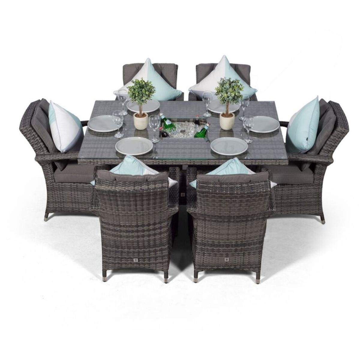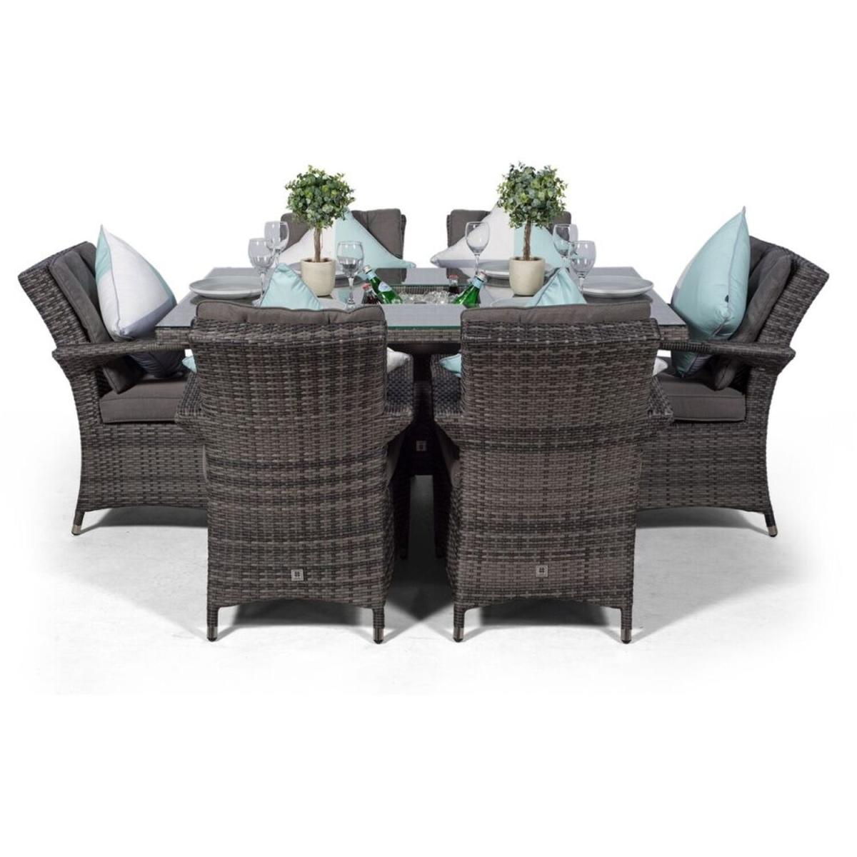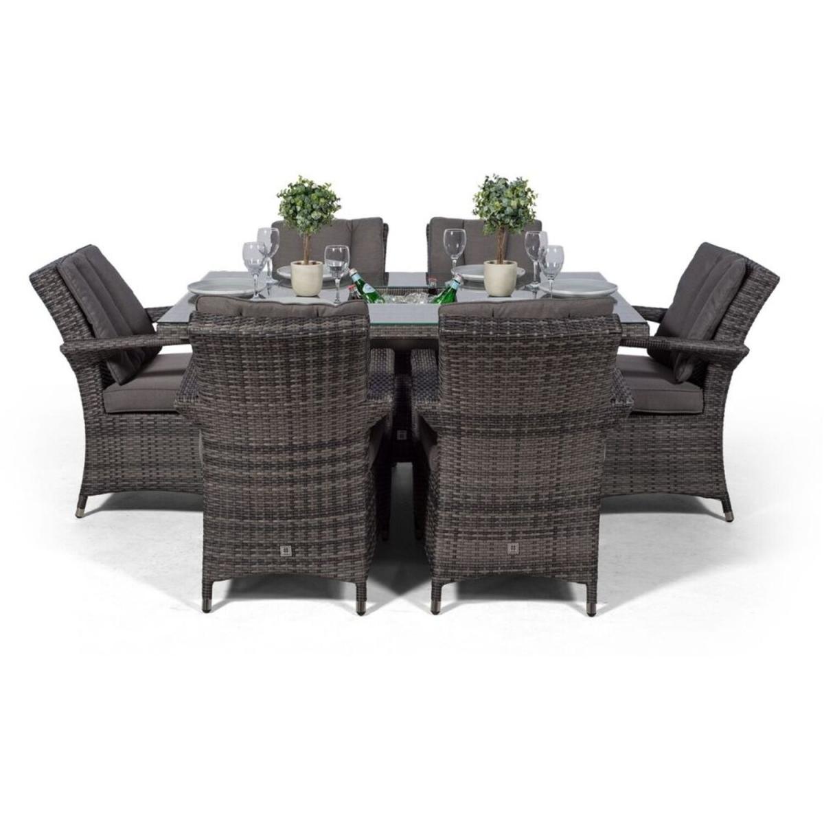 Relax and dine in style with the luxurious Arizona 6 seater rattan dining set with ice bucket drinks cooler by Giardino, its statement feature is the luxury rattan dining chairs with wide curved armrests and contoured high back rests. The Arizona outdoor dining set comes in an ultra stylish mixed grey weave or the stunning mixed brown weave. Consisting of a 150cm rectangular rattan dining table, 6 luxury padded dining chairs, 3m parasol and a 12kg parasol base. The 6 seater rattan dining table features a built in drinks cooler, simply fill with ice and enjoy chilled drinks all day long, great for hosting parties. The ice bucket drinks cooler features an integrated parasol holder to allow use of the umbrella whilst using the drinks cooler. The Arizona rattan garden furniture set is made using aluminium frames and polyethylene all weather rattan, making this outdoor rattan dining furniture strong, light-weight and corrosion resistant. The rattan dining chairs come fully assembled and the impressive synthetic wicker furniture material is UV resistant, able to withstand temperatures from -15 degrees celsius to 60 degrees celsius. A damp cloth or garden hose on a gentle setting is all that's needed to maintain this outdoor furniture. Luxurious multi-density foam and fiber padded cushions make this outdoor dining set super comfortable. Featuring 8cm thick seat cushions and 4cm thick contoured back cushions. Our special water-resistant fabrics protect your cushions from showers and the seat cushions feature removable zip-off covers for easy maintenance. At Thats Furniture, we pride ourselves on meeting all our customers' individual needs. Along with our impeccably designed outdoor furniture, our dedication to customer satisfaction means our rattan garden furniture comes with a full 12-month manufacturers warranty and 5 year extended warranty on the internal frames, backed by our no quibble 30 day money back guarantee so you can buy with complete confidence.