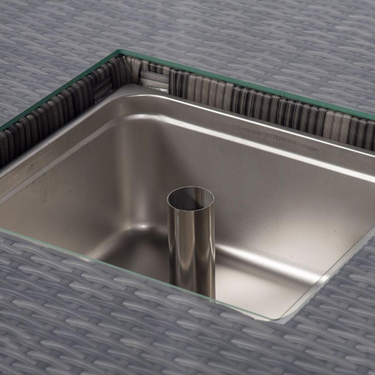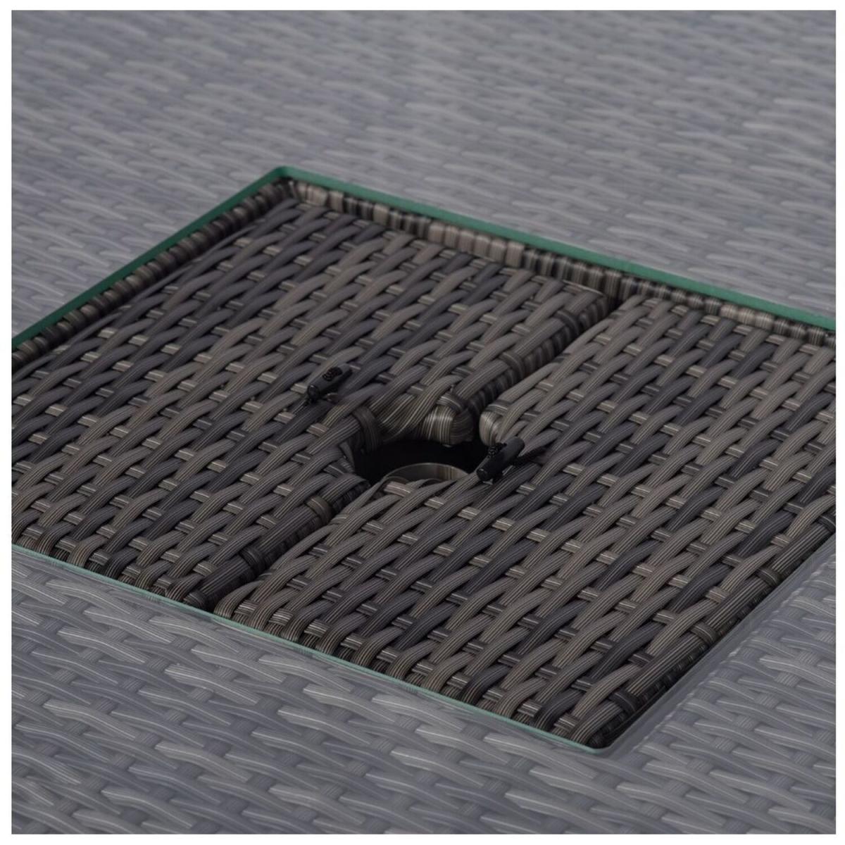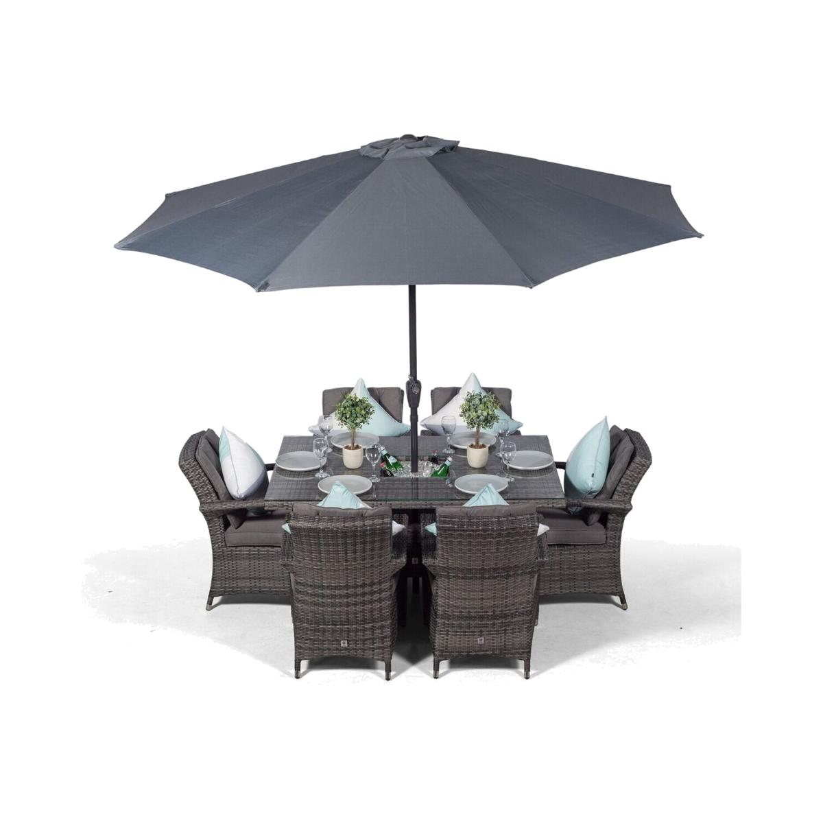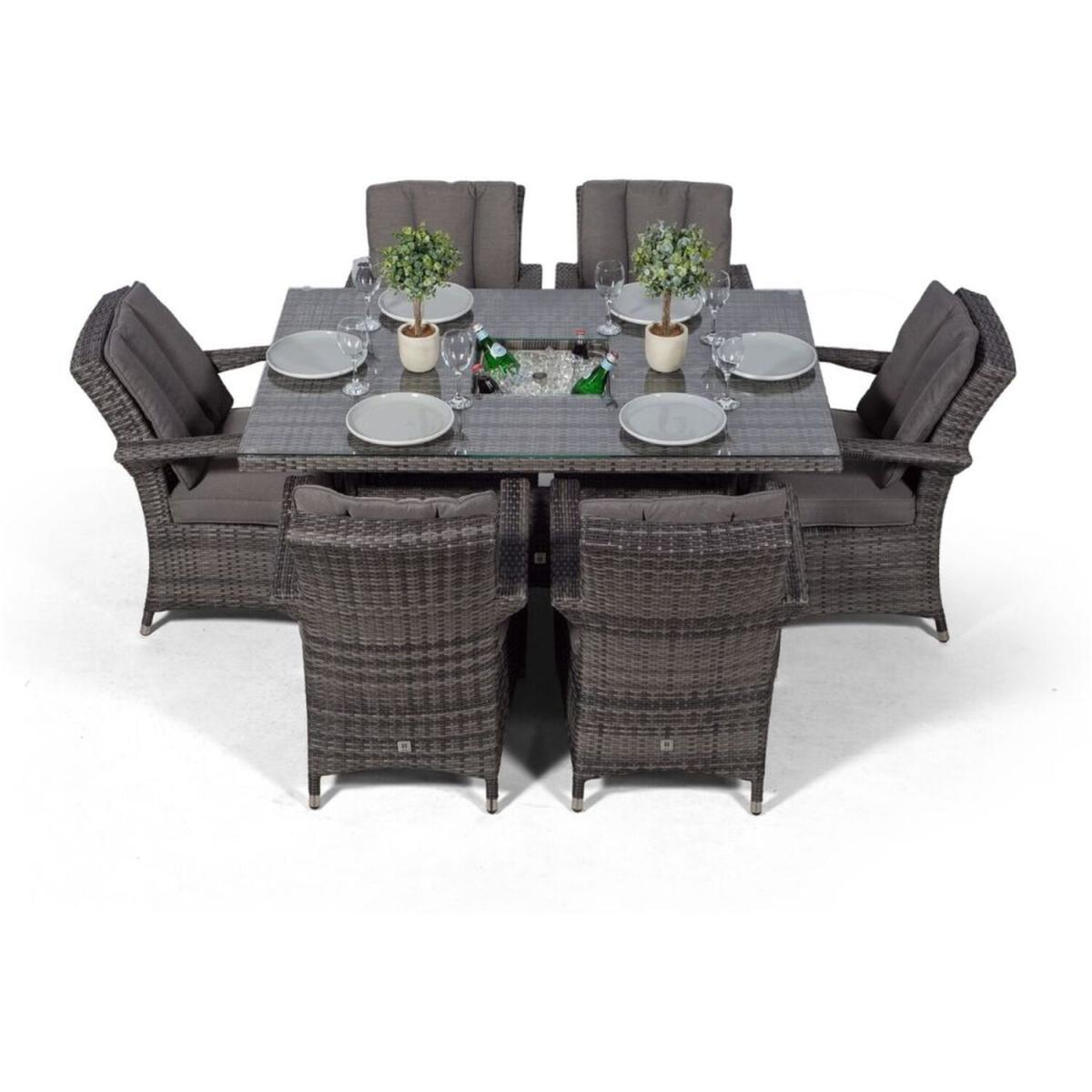 Relax and dine in style with the luxurious Arizona 6 seater rattan dining set with ice bucket drinks cooler by Giardino, its statement feature is the luxury rattan dining chairs with wide curved armrests and contoured high back rests. The Arizona outdoor dining set comes in an ultra stylish mixed grey weave or the stunning mixed brown weave. Consisting of a 150cm rectangular rattan dining table, 6 luxury padded dining chairs, 3m parasol and a 12kg parasol base. The 6 seater rattan dining table features a built in drinks cooler, simply fill with ice and enjoy chilled drinks all day long, great for hosting parties. The ice bucket drinks cooler features an integrated parasol holder to allow use of the umbrella whilst using the drinks cooler. The Arizona rattan garden furniture set is made using aluminium frames and polyethylene all weather rattan, making this outdoor rattan dining furniture strong, light-weight and corrosion resistant. The rattan dining chairs come fully assembled and the impressive synthetic wicker furniture material is UV resistant, able to withstand temperatures from -15 degrees celsius to 60 degrees celsius. A damp cloth or garden hose on a gentle setting is all that's needed to maintain this outdoor furniture. Luxurious multi-density foam and fiber padded cushions make this outdoor dining set super comfortable. Featuring 8cm thick seat cushions and 4cm thick contoured back cushions. Our special water-resistant fabrics protect your cushions from showers and the seat cushions feature removable zip-off covers for easy maintenance. At Thats Furniture, we pride ourselves on meeting all our customers' individual needs. Along with our impeccably designed outdoor furniture, our dedication to customer satisfaction means our rattan garden furniture comes with a full 12-month manufacturers warranty and 5 year extended warranty on the internal frames, backed by our no quibble 30 day money back guarantee so you can buy with complete confidence.