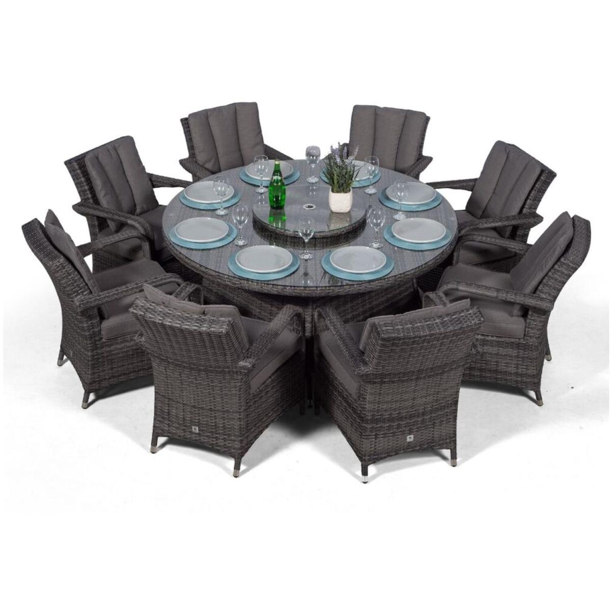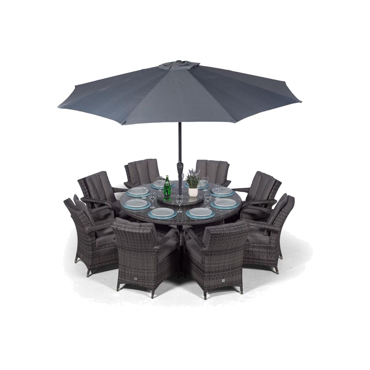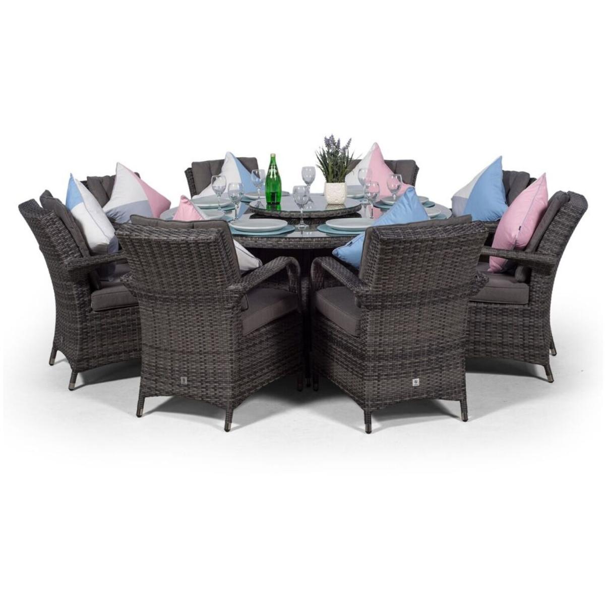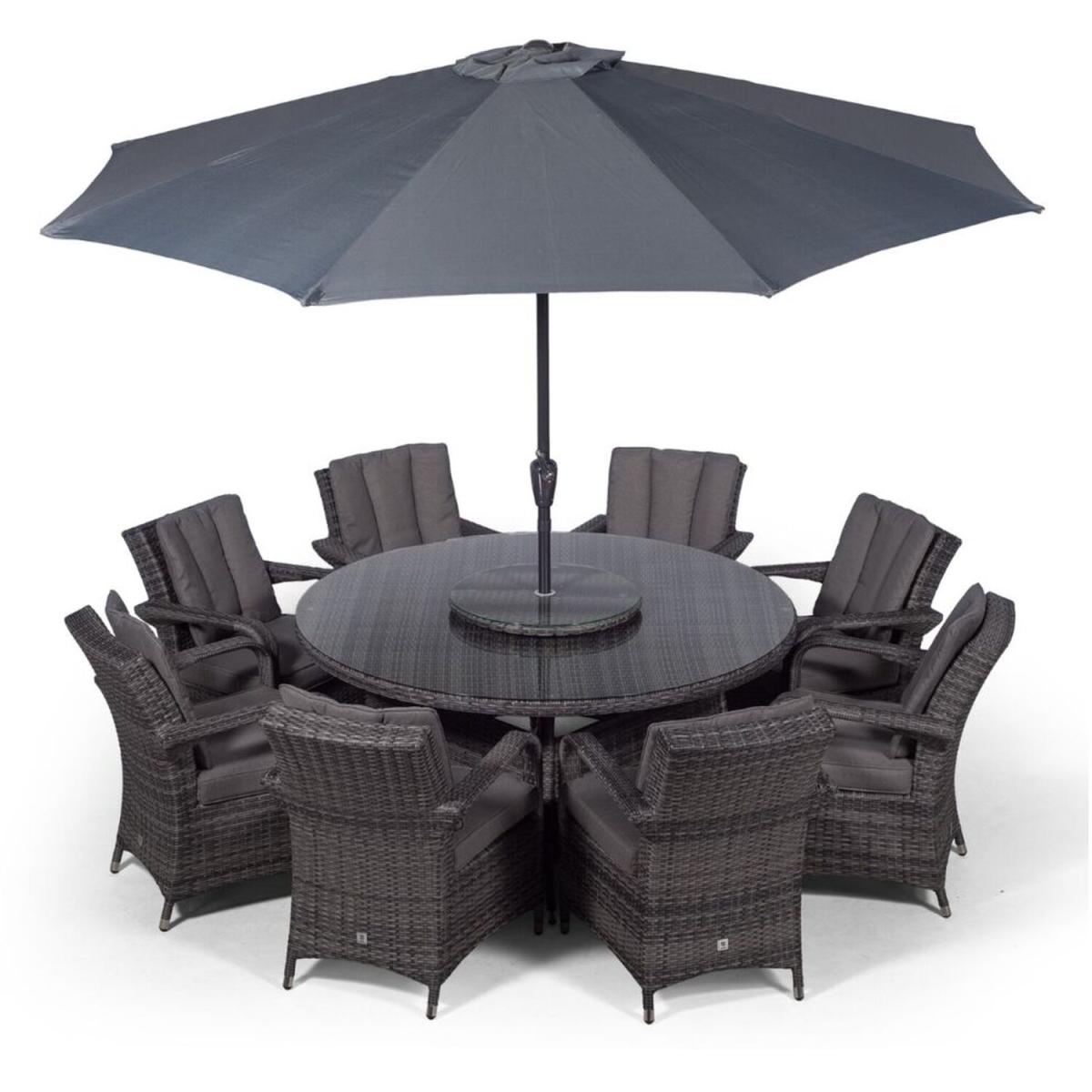 Relax and dine in style with the luxurious Arizona 6 seater rattan dining set by Giardino. Designed to be the focal point of your outdoor living space, the Arizona rattan dining sets statement feature is its luxury rattan dining chairs with wide curved armrests and contoured high back rests. This 6 seater rattan dining table and chairs set is available in an ultra stylish mixed grey weave or the stunning mixed brown weave. The versatile Arizona rattan dining set consists of a 135cm round rattan dining table, 6 luxury padded dining chairs, 3m parasol and a 12kg parasol base. The Arizona rattan garden furniture set is made using aluminium frames and polyethylene all weather rattan, making this outdoor rattan dining furniture strong, light-weight and corrosion resistant. The rattan dining chairs come fully assembled and the impressive synthetic wicker furniture material is UV resistant, able to withstand temperatures from -15 degrees celsius to 60 degrees celsius. A damp cloth or garden hose on a gentle setting is all that's needed to maintain this outdoor furniture. Giardino rattan garden furniture is designed with comfort and style in mind. Luxurious multi-density foam and fiber padded cushions make this outdoor dining set super comfortable. Featuring 8cm thick seat cushions and 4cm thick contoured back cushions. Our special water-resistant fabrics protect your cushions from showers and the seat cushions feature removable zip-off covers for easy maintenance. At Thats Furniture, we pride ourselves on meeting all our customers individual needs. Along with our impeccably designed outdoor furniture, our dedication to customer satisfaction means our rattan garden furniture comes with a full 12-month manufacturers warranty and 5 year extended warranty on the internal frames, backed by our no quibble 30 day money back guarantee so you can buy with complete confidence. Note Patterned scatter cushions and table accessories not included.