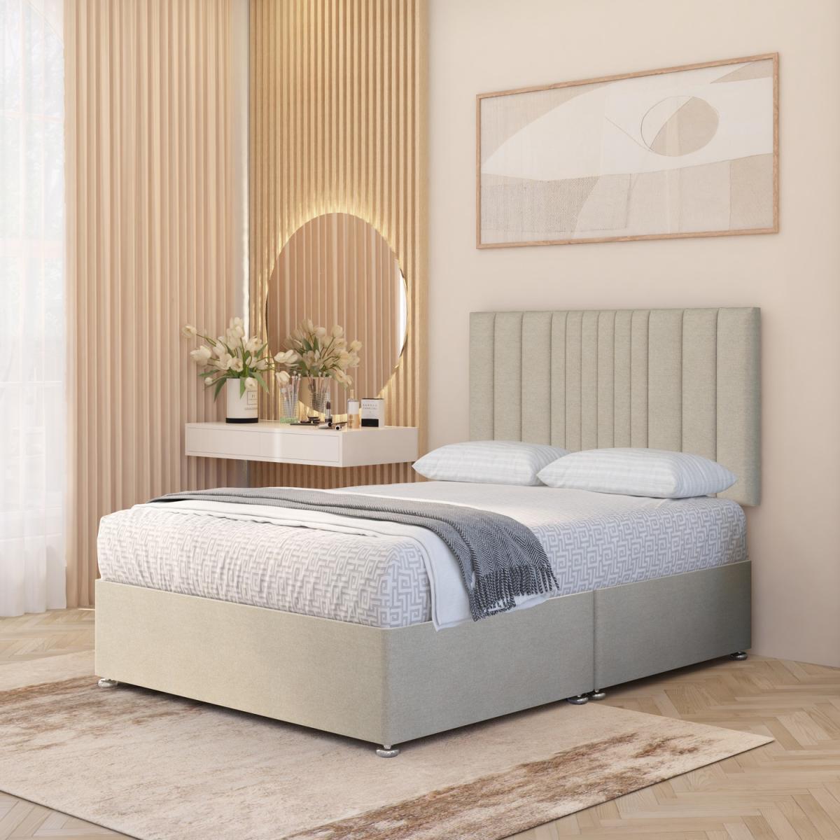 The Arizona Divan Bed Set in Tweed Fabric combines timeless style with lasting comfort. Built with a solid platform top divan base, it offers strength, durability, and the ideal surface to enhance mattress performance. Complete with a 32" upholstered headboard and a 28cm deep Hybrid Midnight Orthopaedic Pocket Spring Mattress, this set delivers exceptional support. The mattress uses individually nested pocket springs that respond to your body for personalised comfort, each reacting independently to weight for tailored support, reducing partner disturbance. The 7-zone support system eases pressure on shoulders, hips, and back, and layers of luxury foams provide contouring comfort and bounce-back support. The breathable core helps regulate temperature, and the soft-touch cashmere fabric with hand tufting ensures a durable, supportive sleep surface. Finished with cushioned vertical panels, the elegant headboard makes this divan bed the perfect bedroom upgrade, base and headboard finished in Tweed Fabric for a textured look. Available in all UK sizes 2FT. 6 Small Single (79x193cm), 3FT Single (92x193cm), 4FT Small Double (123x193cm), 4FT. 6 Double (137x193cm), 5FT King (153x203cm), 6FT Super King (183x203cm). One-sided mattress, reccomended to rotate throughout the year. Base Height 34.5cm with chrome gliders attached, 30.5cm without.