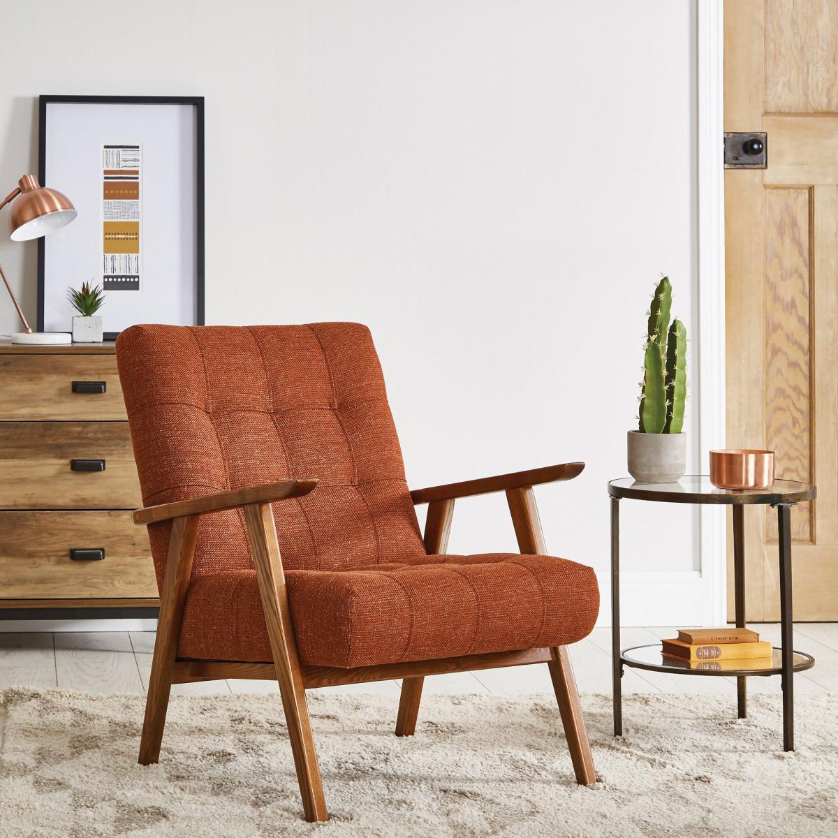 The Arkin Wooden Frame Accent Chair in vibrant orange is a great statement piece that adds warmth and energy to any interior. It works particularly well in mid-century modern or eclectic schemes, where its colour can serve as a focal point or be complemented with other bold accents. Style tip: pair it with neutral surroundings such as soft greys or whites to let the chair shine, or mix it with patterned cushions and throws for a cosy, layered look. Its wooden frame gives it a timeless appeal, making it versatile enough for living rooms, reading nooks, or even stylish home offices. Practicality-wise, its sturdy construction and comfortable proportions mean it’s both beautiful and functional for everyday use.