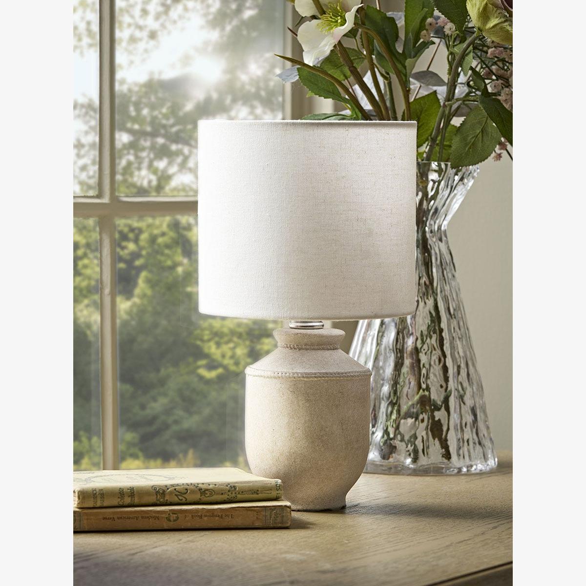 Warm each and every corner of your home with our Arlene table lamp. An organic ceramic base creates a slightly sculptural quality to this lamp, whilst the neutral shade complements the base and offers a gentle glow around your home when lit.
