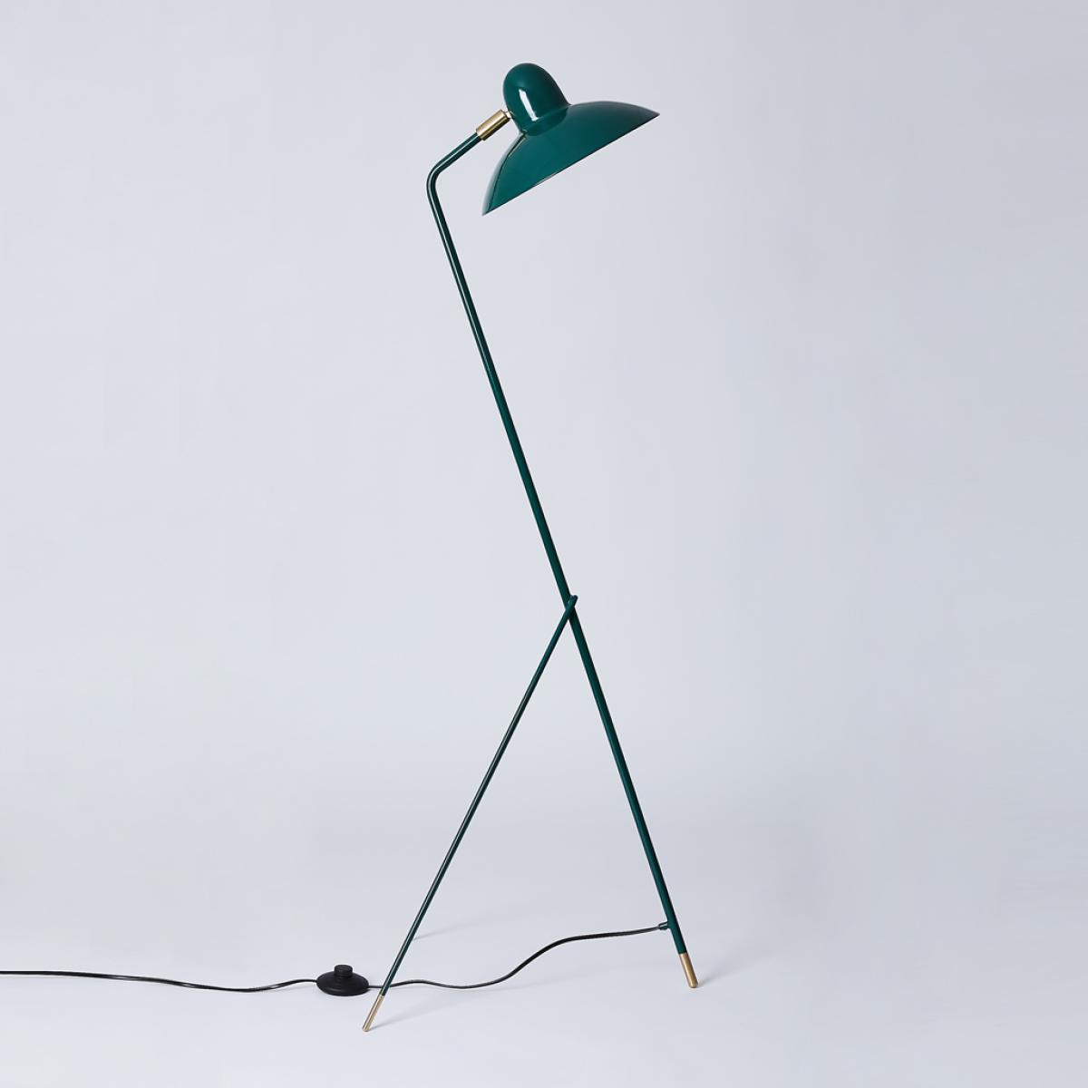 Designed by Domei Endo, this compact, contemporary Arles Floor Lamp in a racing green finish is crafted from a combination of painted steel and brass. Showcasing a design inspired by a scene in the Southern French town of Arles, the lamp's shape is reminiscent of an image of a French woman elegantly holding a hat in the breeze, with the lamp's shade representing the hat and her bent elbow interpreted by the lamp's stem. Designed by Domei Endo, the Arles Floor Lamp has an adjustable shade, so you can angle the light in any direction, making it an ideal as a reading lamp. Requires: 1 x Max 40W E14 bulb (not included)