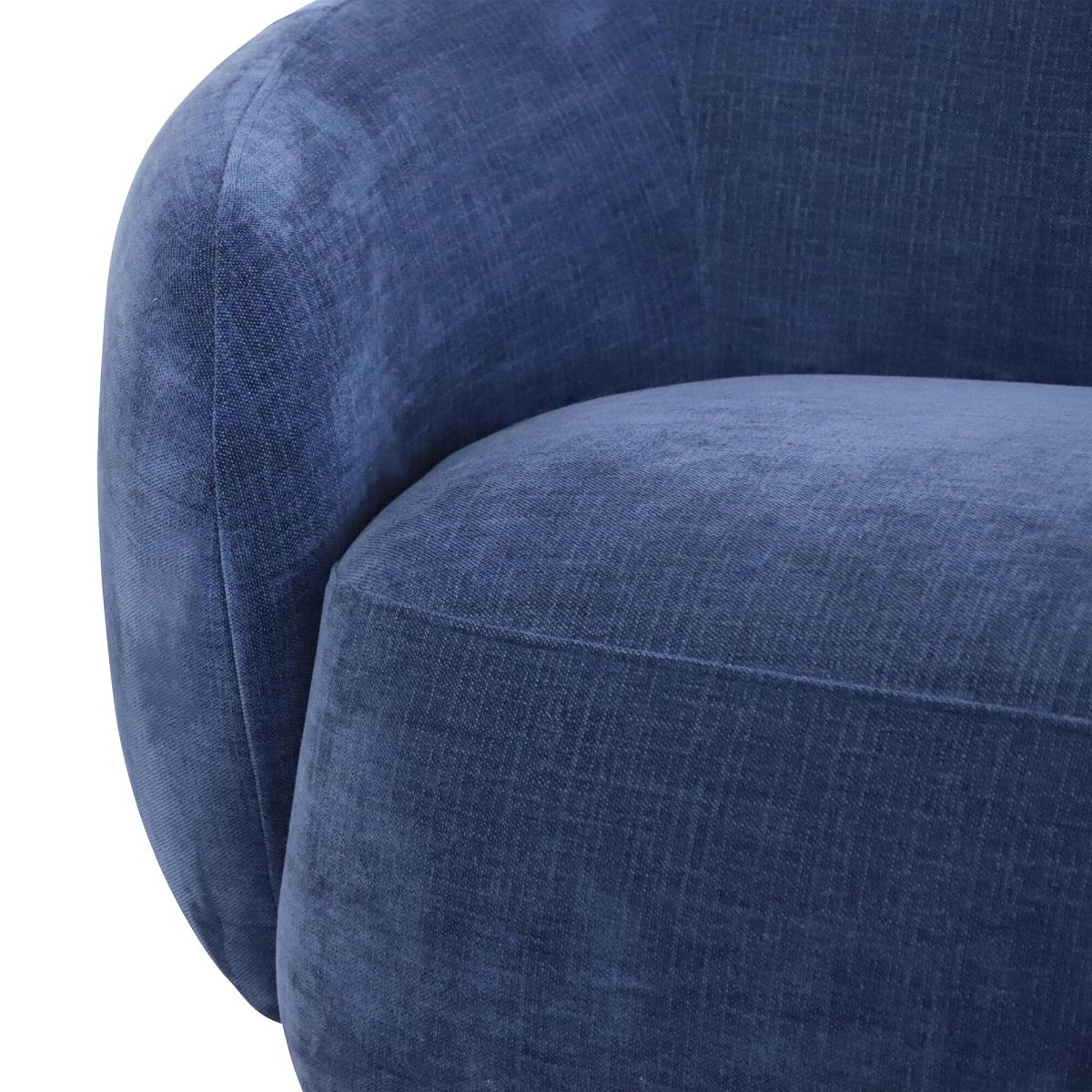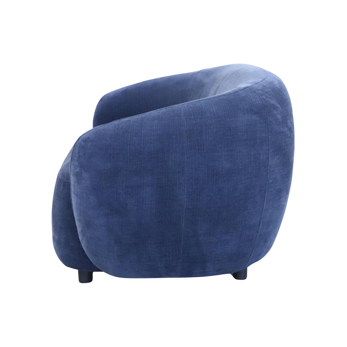 I love this blue sofa for its contemporary yet versatile appeal. Its rounded shape and plush fabric make it inviting without overwhelming the space, making it a great focal point in both modern and eclectic interiors. It works particularly well in living rooms with neutral tones or soft colour palettes, adding a splash of colour while maintaining understated elegance. For styling, consider pairing it with textured cushions in contrasting colours or patterns to add visual interest, and keep accessories simple to let the sofa stand out. Its compact design also makes it ideal for smaller rooms or cosy corners, ensuring comfort without sacrificing style.