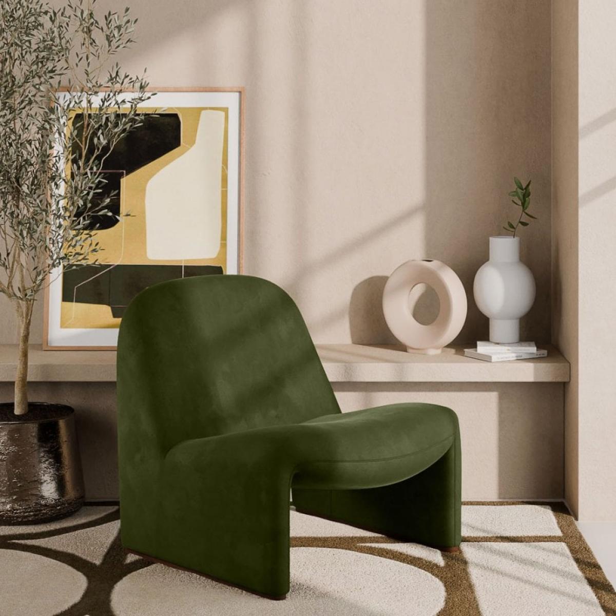 I love this chair for its rich olive green velvet, which adds a touch of colour without overpowering a space. It works well in both contemporary and mid-century interiors, especially if you’re looking to introduce a statement piece that’s also practical. The sustainable velvet adds a layer of texture and eco-conscious appeal, making it ideal for eco-friendly homes. For styling tips, pair it with neutral-toned accessories or patterned cushions to create visual interest. It’s versatile enough to work as a standalone accent in a living room corner or as part of a layered seating arrangement. Its cosy, rounded shape makes it inviting and perfect for creating a relaxed yet sophisticated vibe.