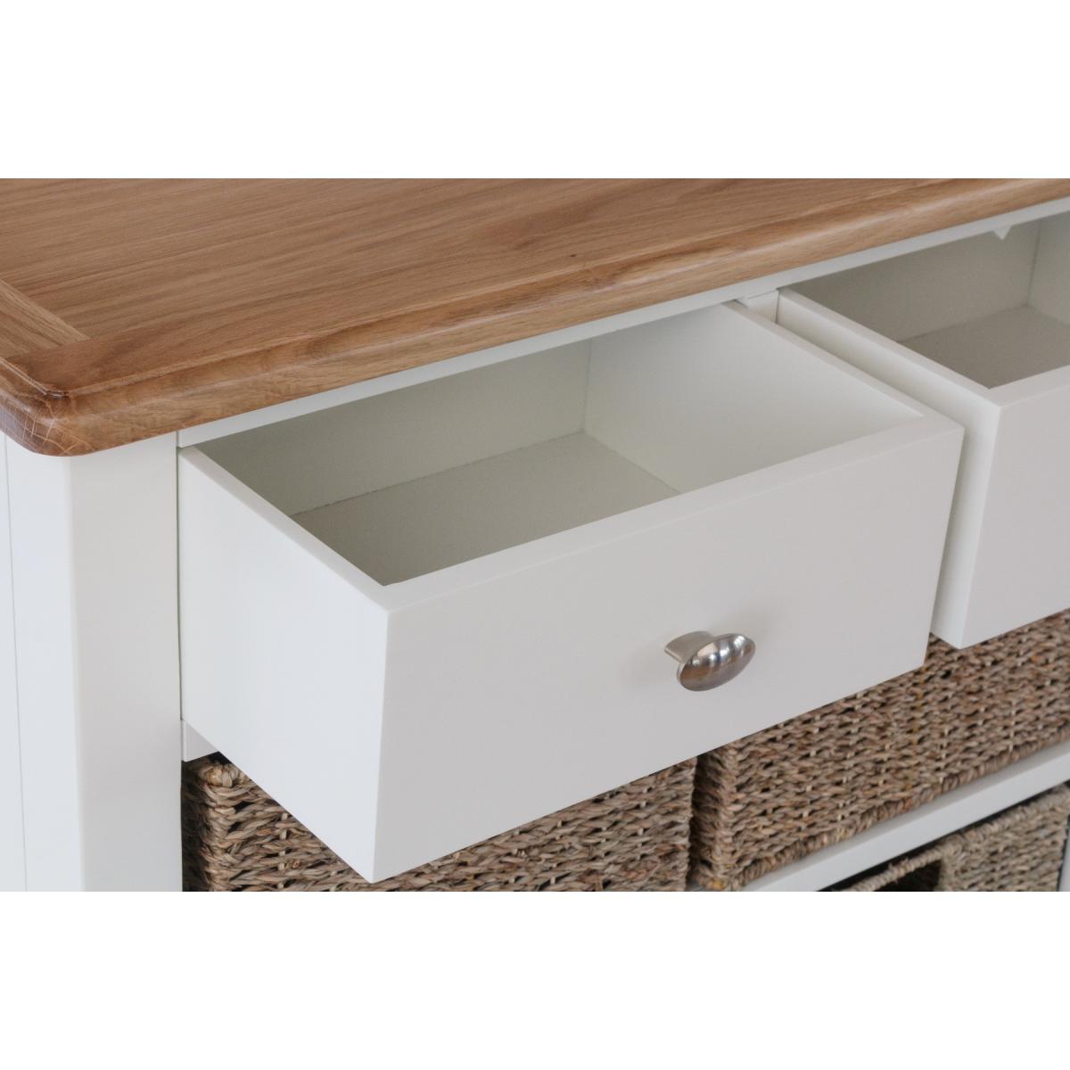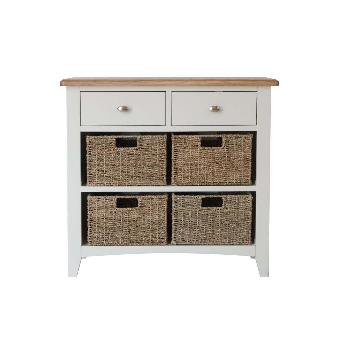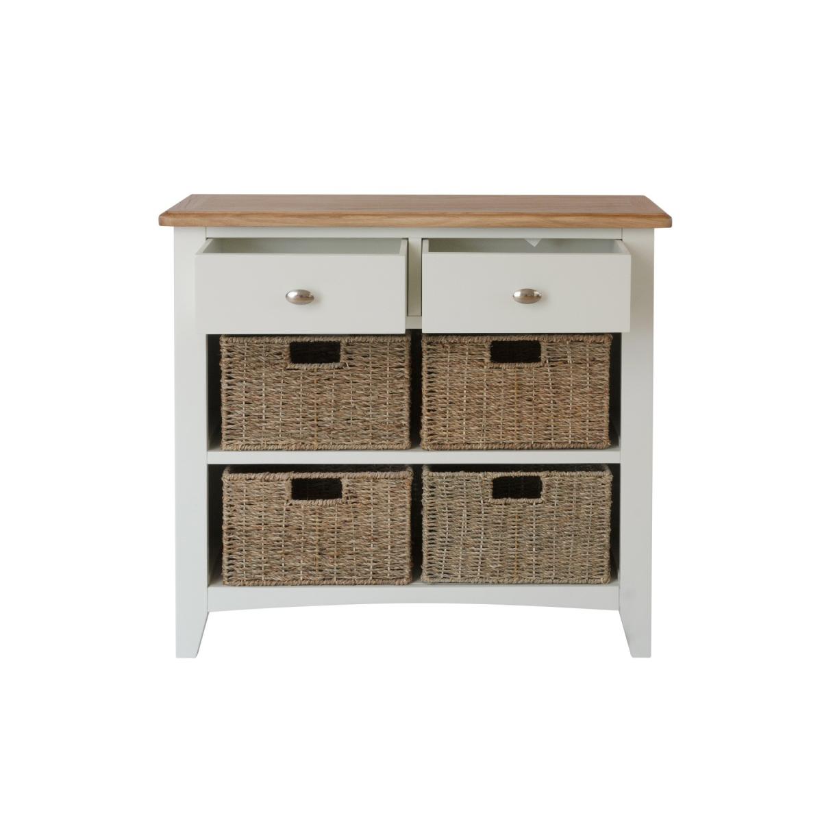 This storage unit is the perfect addition to your dining room, providing you with lots of storage space. Carefully crafted with a solid frame, the unit is practical and stylish. 2 dovetailed drawers and 4 vintage wicker baskets. The drawers have brushed metal oval knob handles that give it a classic look. Compact and takes up very little room. Has a light oak top with smooth bevel detailing and rounded edges. Strong tapered legs that offer steady support. Comes ready assembled.