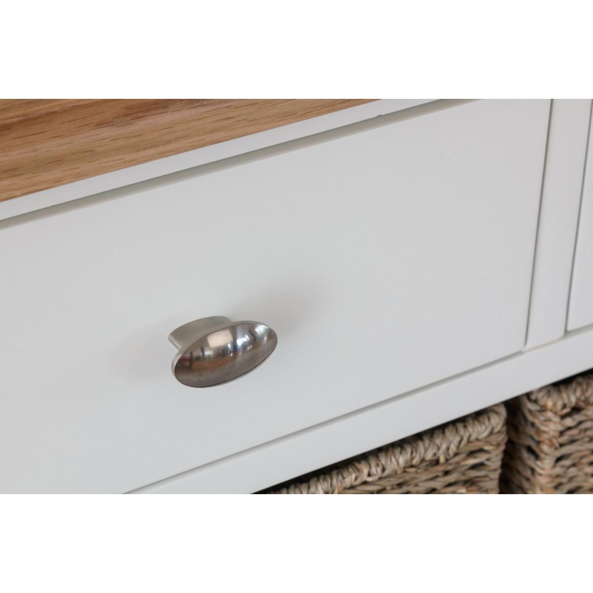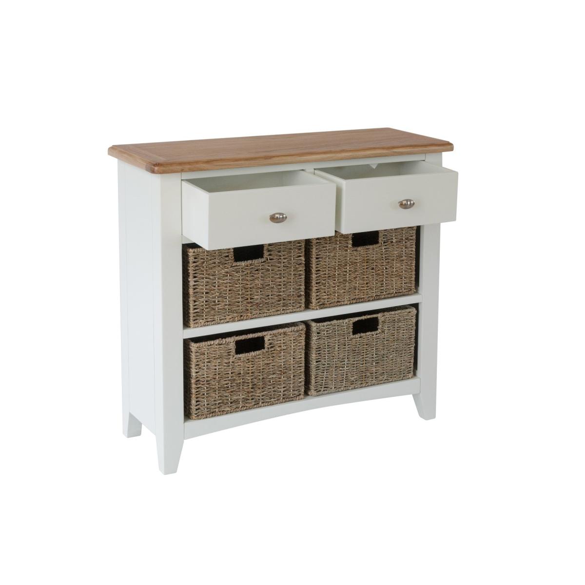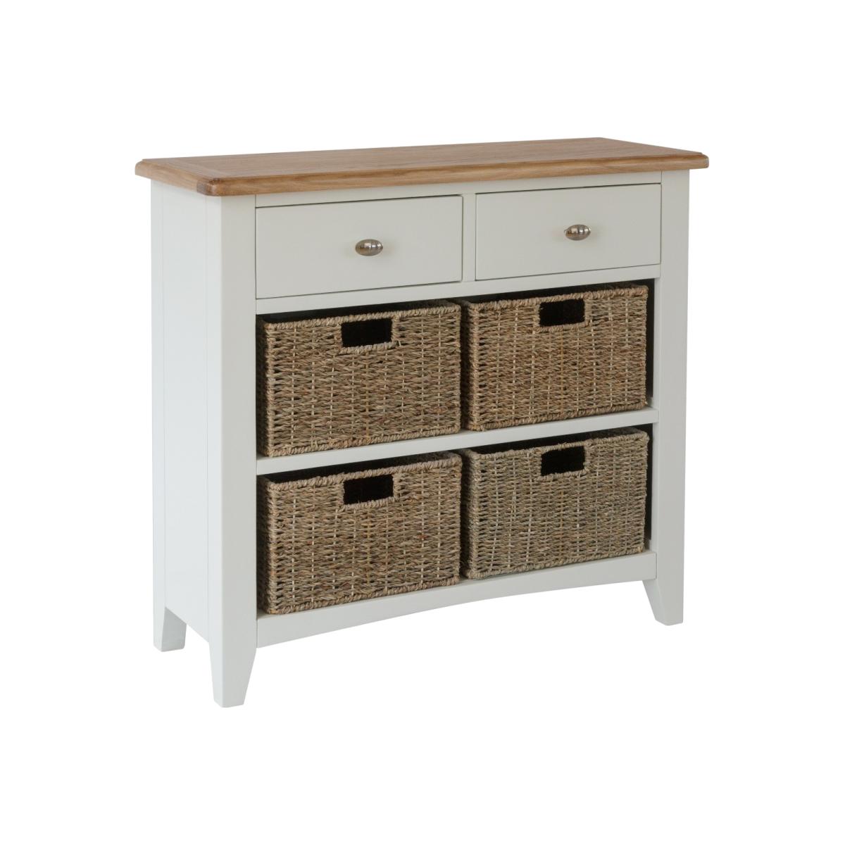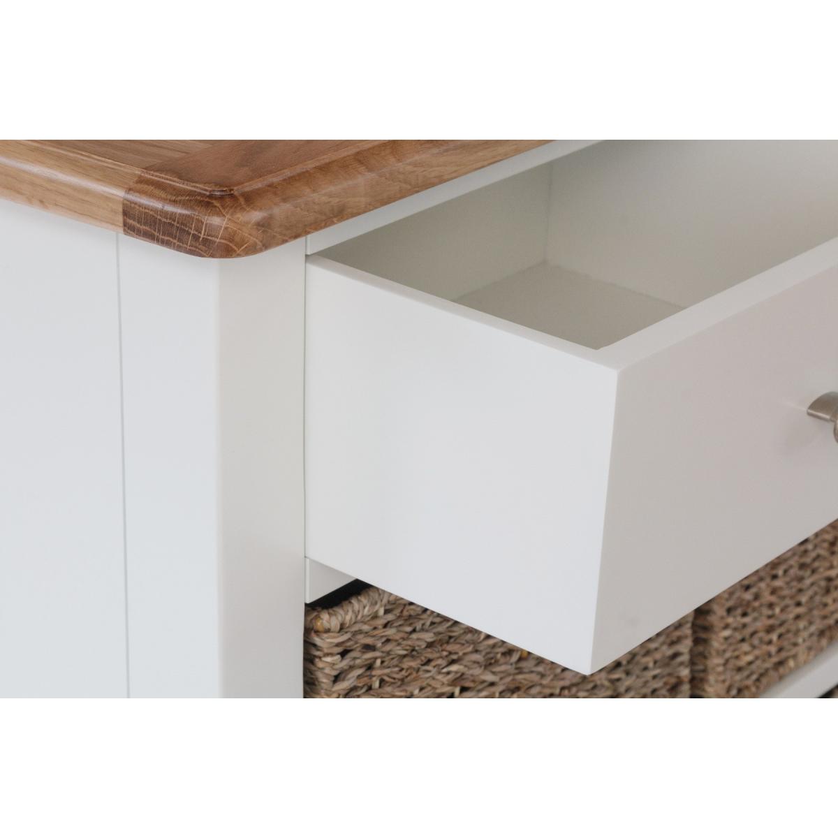 This storage unit is the perfect addition to your dining room, providing you with lots of storage space. Carefully crafted with a solid frame, the unit is practical and stylish. 2 dovetailed drawers and 4 vintage wicker baskets. The drawers have brushed metal oval knob handles that give it a classic look. Compact and takes up very little room. Has a light oak top with smooth bevel detailing and rounded edges. Strong tapered legs that offer steady support. Comes ready assembled.