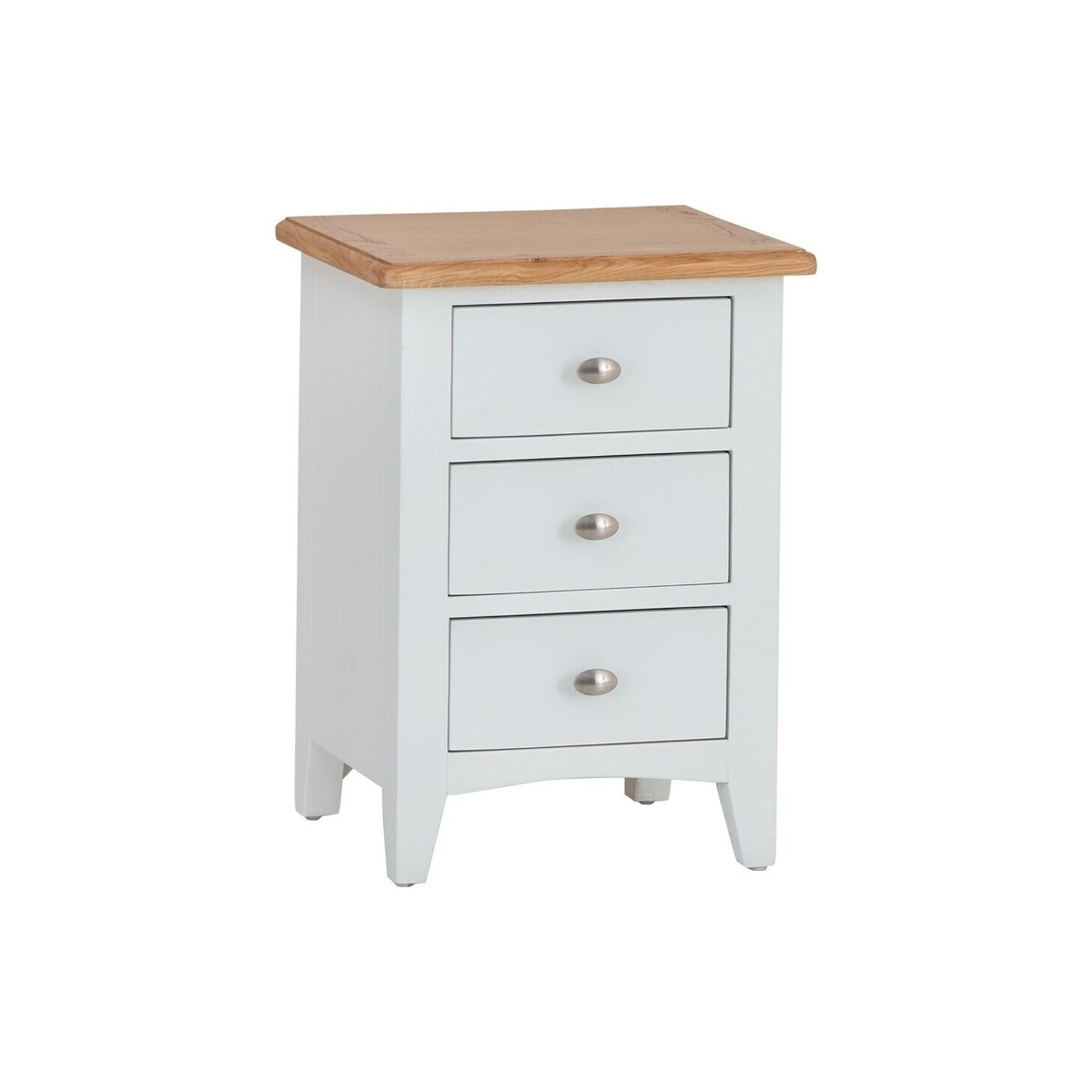 The Arlia 3 Drawer Bedside Cabinet is a perfectly functional and beautifully-designed item of furniture. It is compact and takes little room while providing lots of space to tuck away your nighttime essentials. This cabinet has three spacious, dovetailed drawers. Solid wood frame with a beautiful off-white finish. Oak tops with delicate bevel detailing and sturdy legs that taper downward. Oval brushed metal knob handles for the perfect finishing touch. Comes ready-assembled