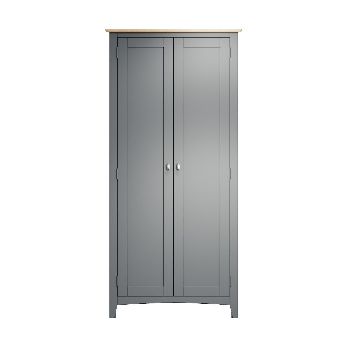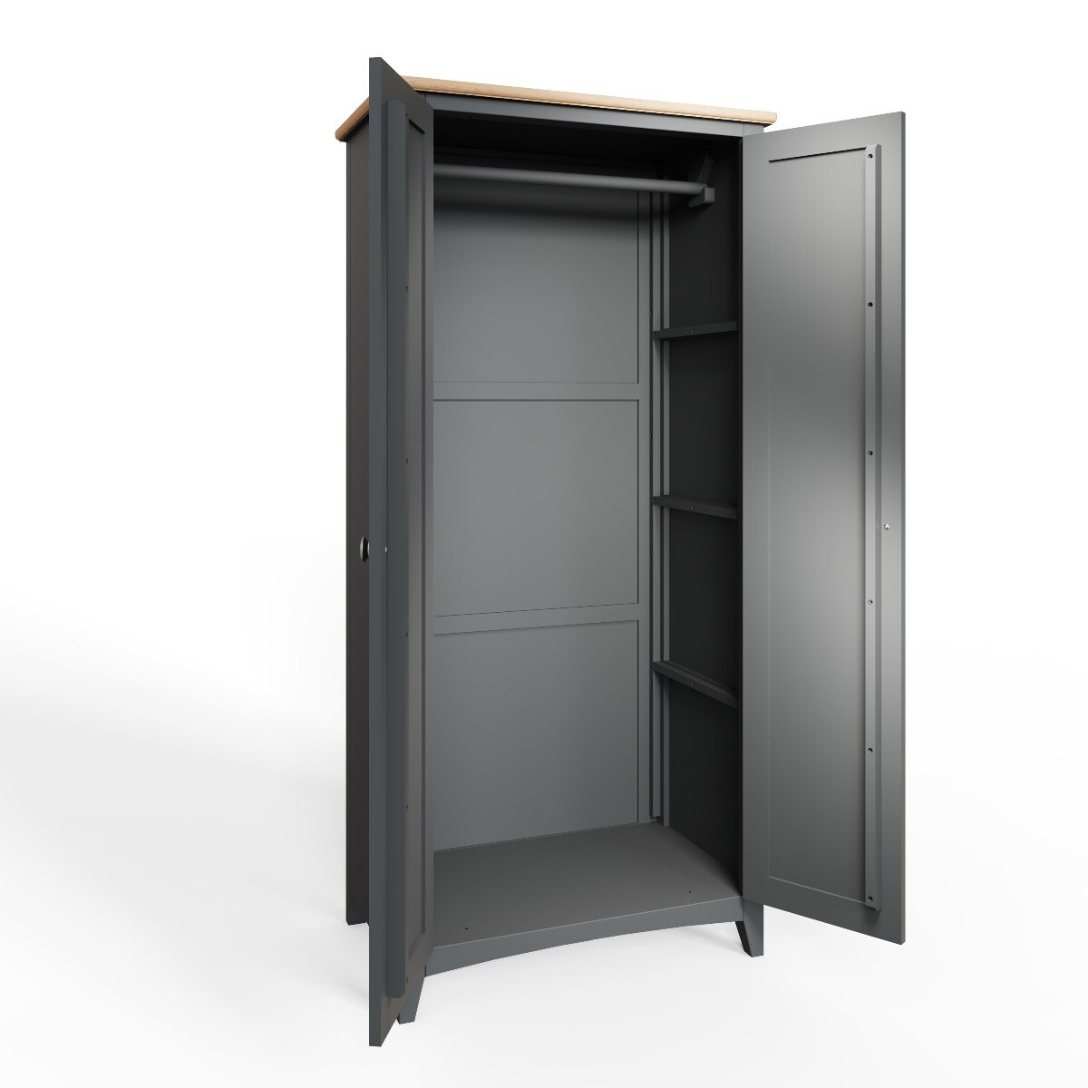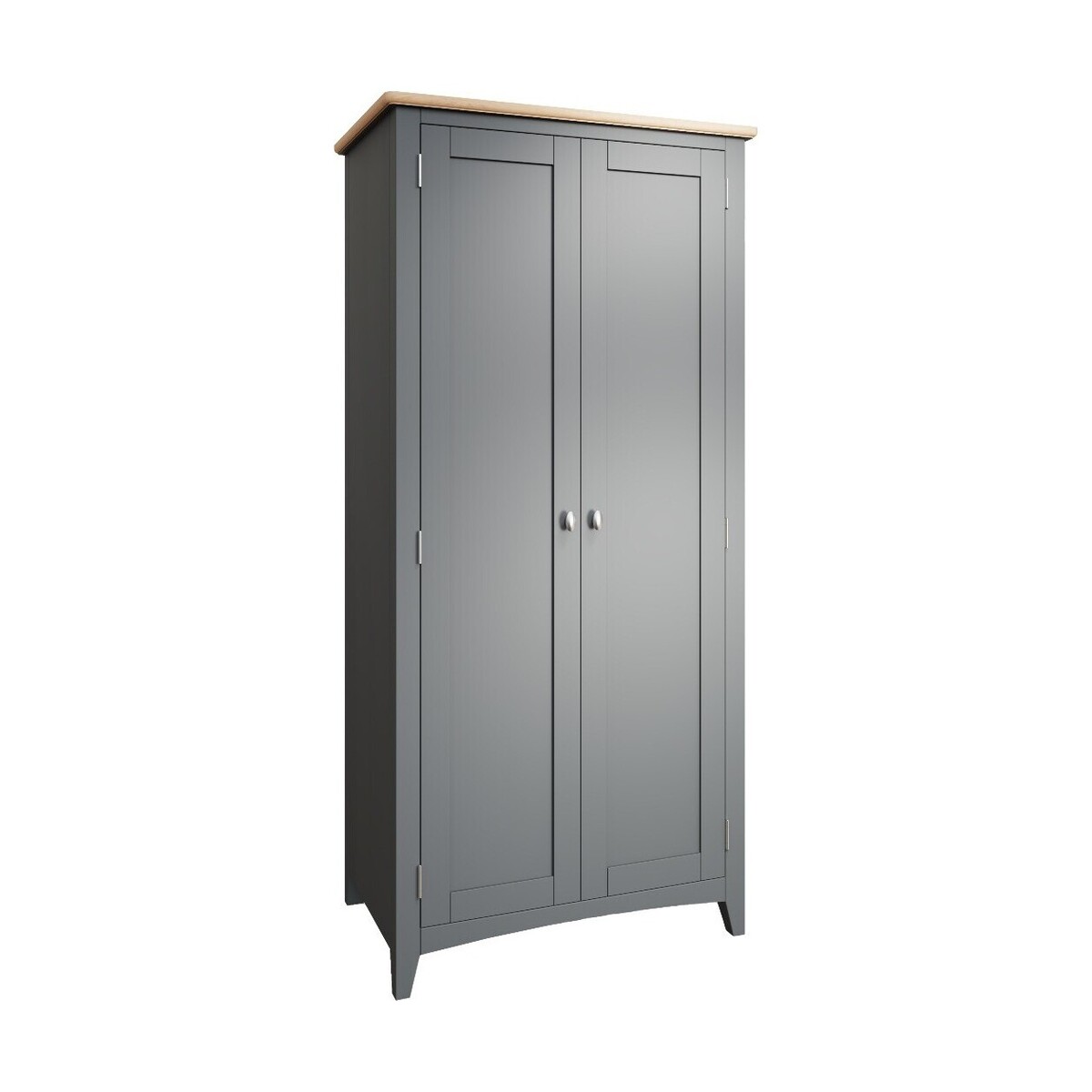 The Arlia Oak and Grey 2 Door Full Hanging Wardrobe features a classic design to flatter any bedroom. With a grey painted frame, the full hanging wardrobe features an oak top and is complete with brushed metal knobs. Durable and stylish wardrobe. Stunning two-tone design makes a statement. Smooth grey-painted finish on the frame. Chunky solid oak top with rounded edges and bevel detailing.2 doors with brushed metal knob handles. Provides full-hanging wardrobe space. Solid wood hanging rod. Clean internal finish. Metal clasps to help keep the doors shut. White-painted design also available. Gents wardrobe also available. Look out for more items from this collection.