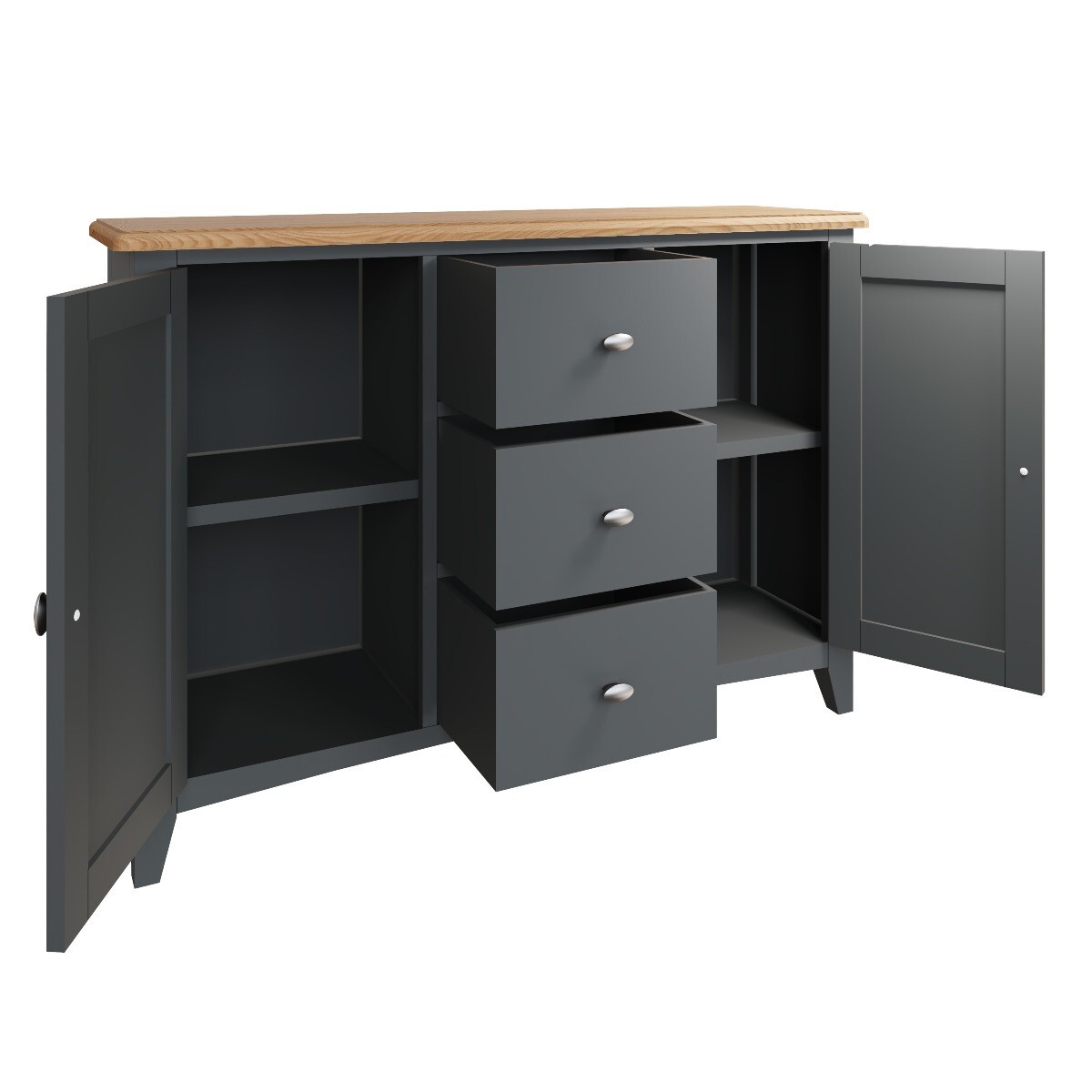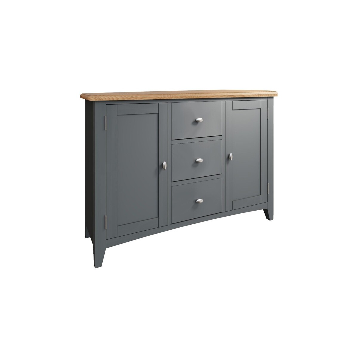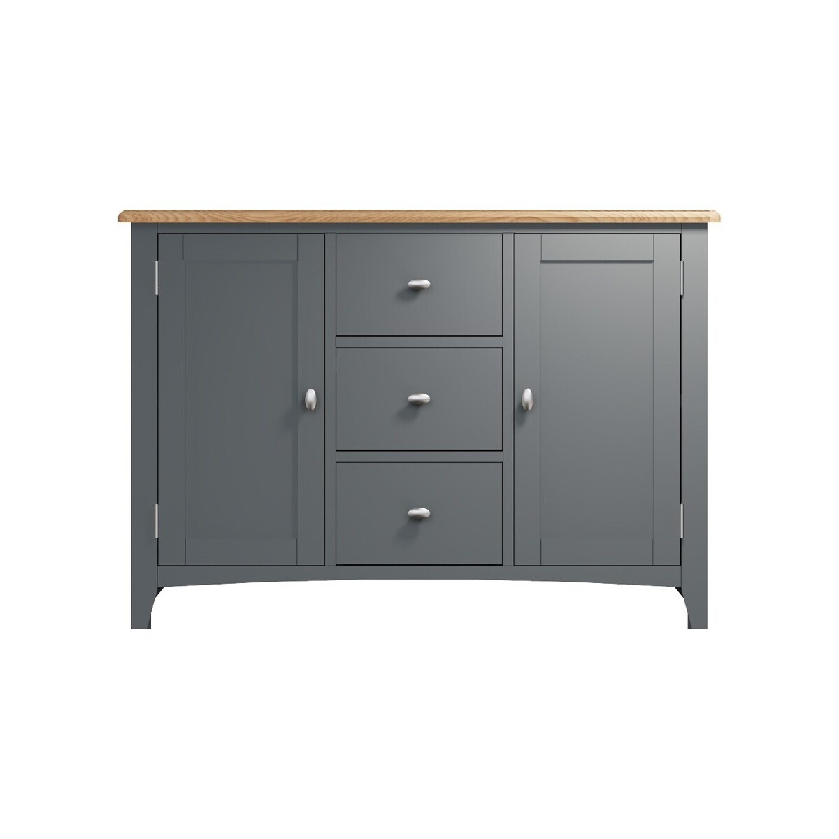 The Arlia Oak and Grey Large Sideboard is stylish and practical. Perfect for more spacious homes, the large sideboard features a grey painted frame with an oak top and is complete with 3 dovetailed drawers and 2 cabinet doors finished with brushed metal knobs. Stylish and practical large sideboard. Two-toned design, complete with a grey painted finish and a rustic oak top. Chunky solid oak top features a classic grain pattern, smooth rounded edges and classy bevel detailing. 3 dovetailed drawers and 2 wooden cabinet doors with oval brushed metal knob handles. Wide and spacious design offers lots of storage space. Enclosed shelf space. A 3-door, 2-door and small sideboard also available. Comes ready assembled. Look out for more items from this collection.