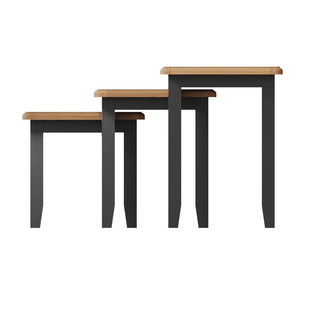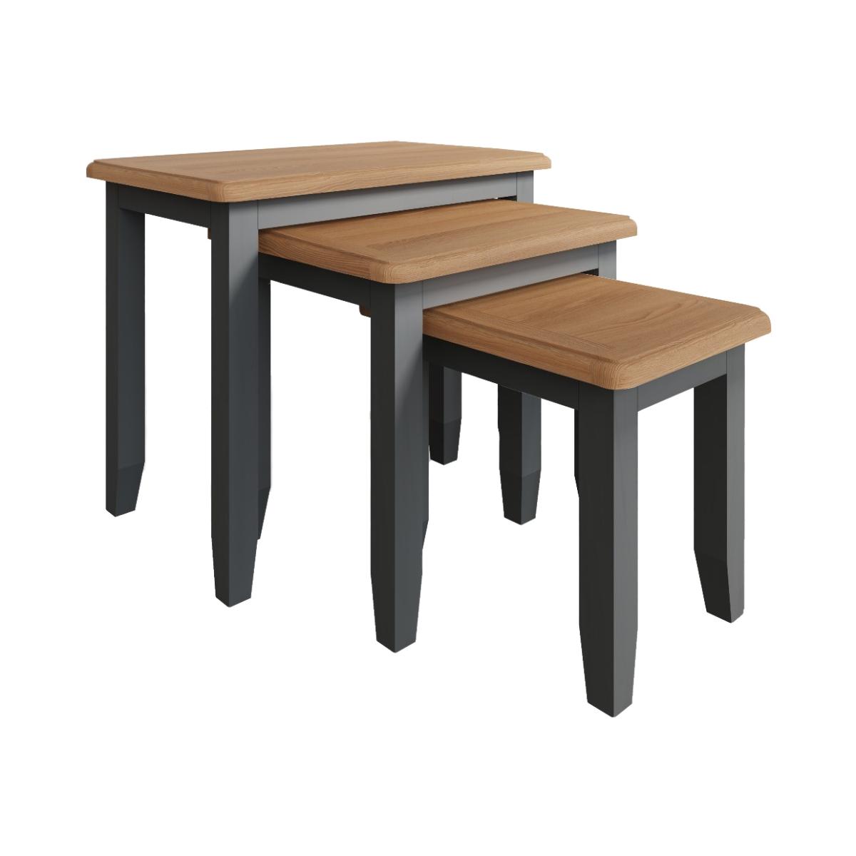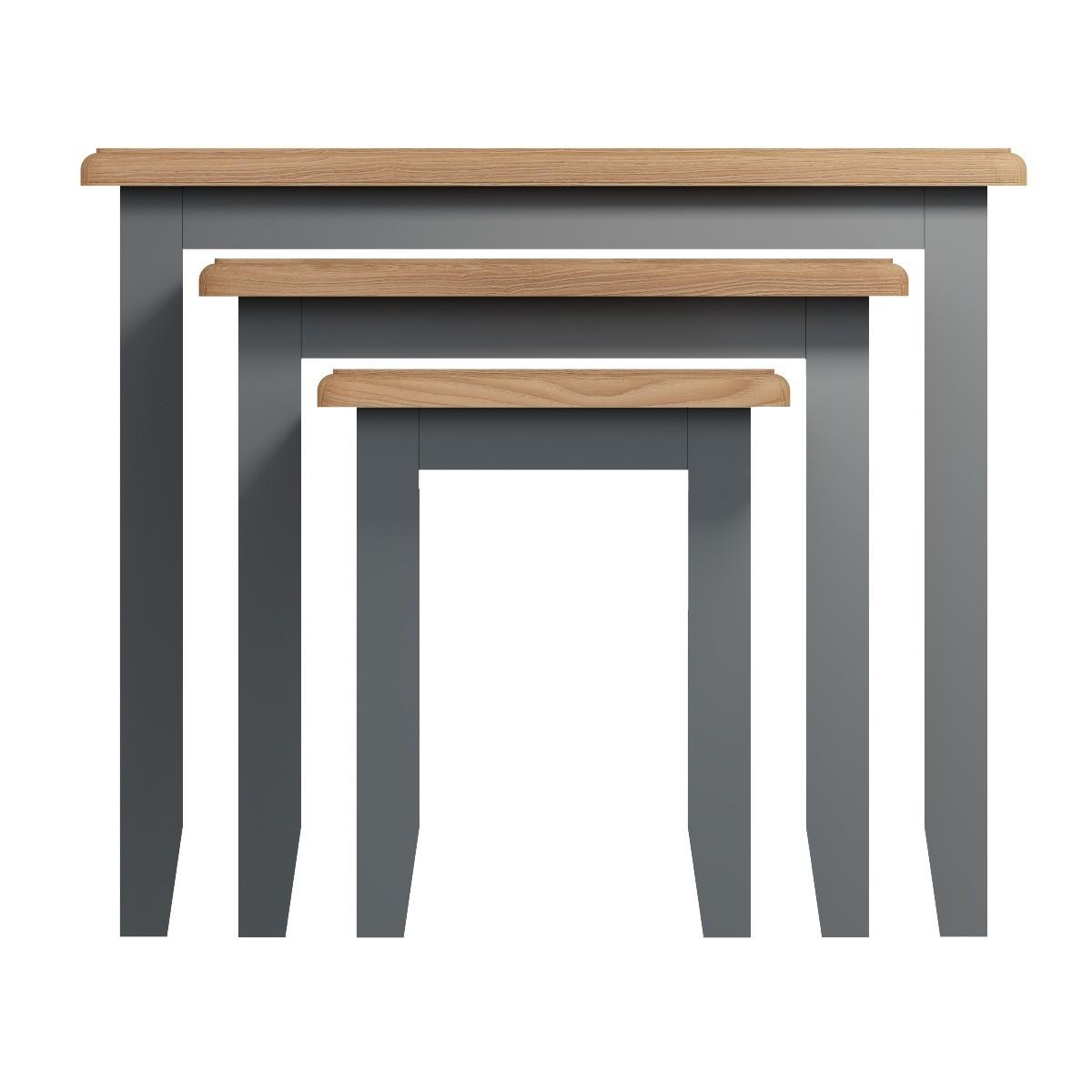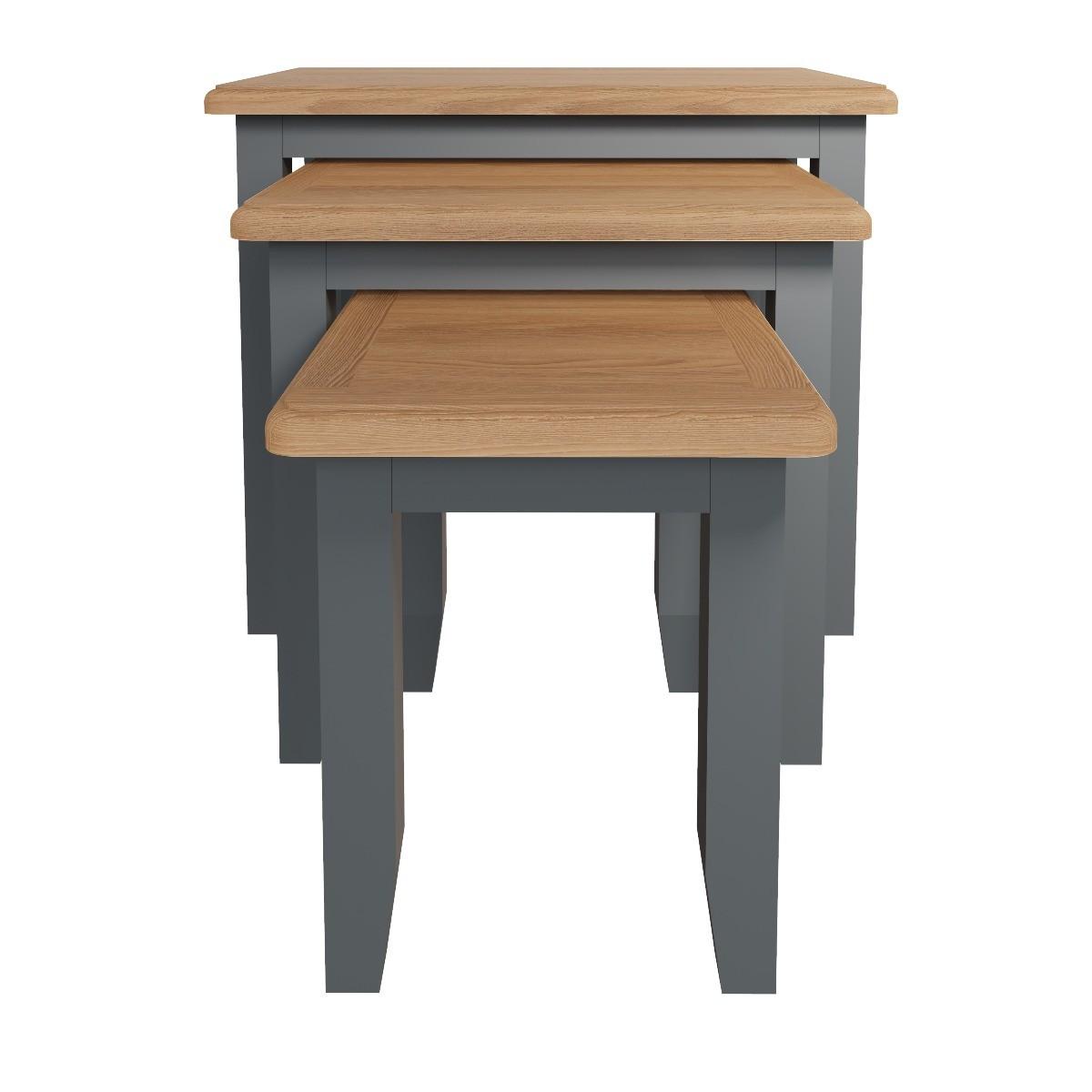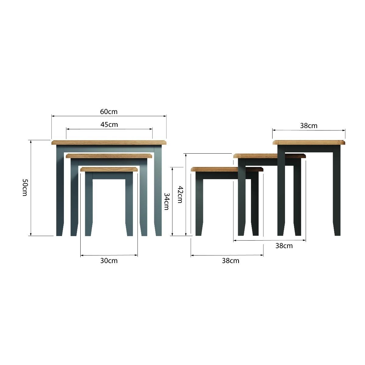 The Arlia Oak and Grey Nest of 3 Tables is a practical and stylish addition to your home. Perfect for your living room or dining space, the set features three versatile tables with grey-painted legs and oak tops that stack neatly together when not in use. Handy set of tables with a classic, two-toned design. Chunky solid oak top with a rustic oak finish, bevel detailing and smooth rounded edges. Grey painted finish on the legs. The tables stack together for easy storage. Sturdy solid wood legs provide firm stability and support. A model with a white and light oak finish also available. Nest of 2 tables also available. Comes ready assembled. Look out for more items from this collection.