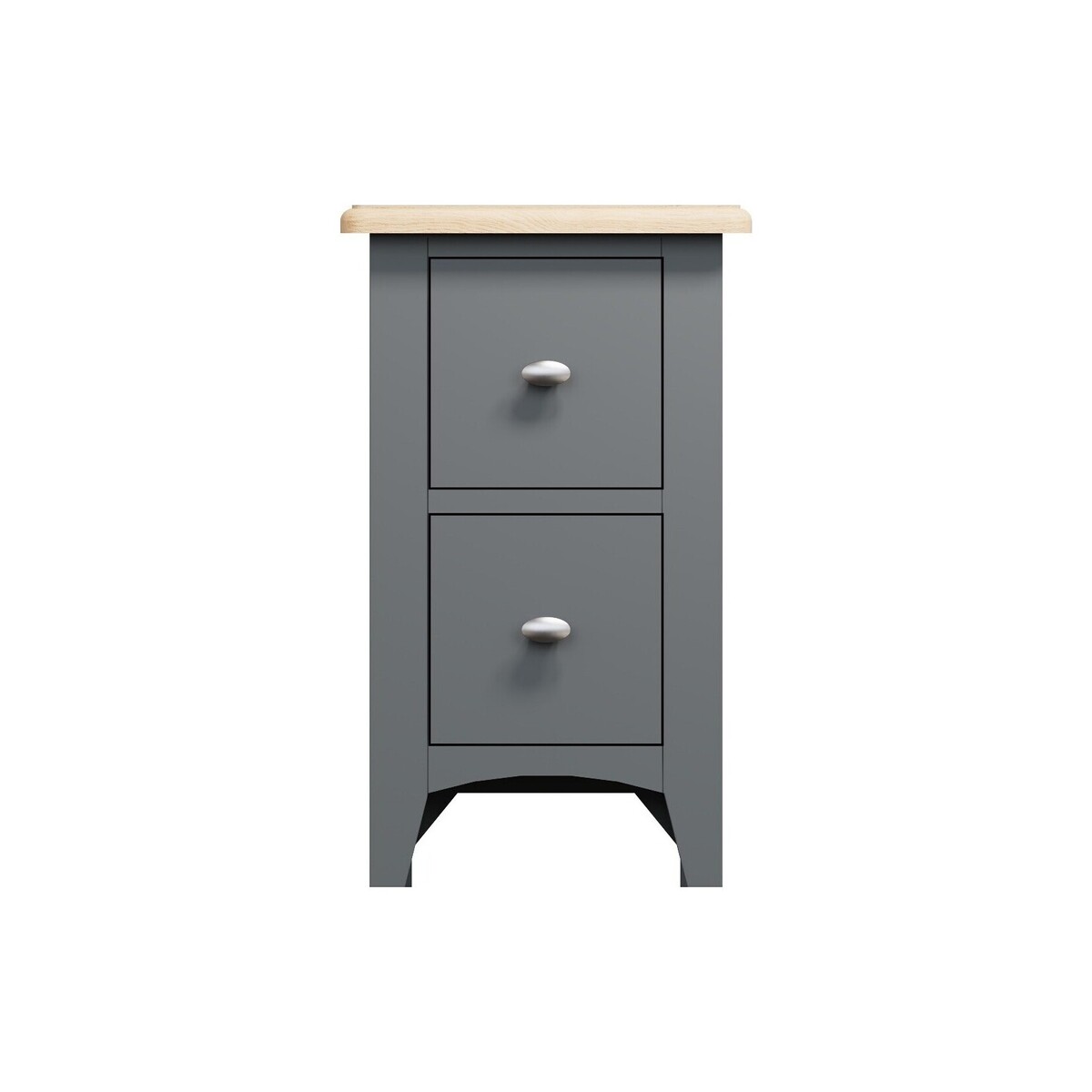The Arlia Oak and Grey Small Bedside Table brings classic style to your bedroom. With two handy drawers, the small cabinet features a grey painted frame contrasting with an oak top for a stylish two-toned finish. Stylish and practical bedside cabinet. Minimalist design with two-toned oak and grey finish. Compact design conserves floor space.2 small dovetailed drawers to neatly store your bedtime essentials away. Drawers complete with brushed metal knob handles. Chunky solid oak top with rounded edges, bevel detailing and a rustic light oak finish. White painted design also available.3 drawer bedside cabinet also available. Comes ready assembled. Look out for more items from this collection.