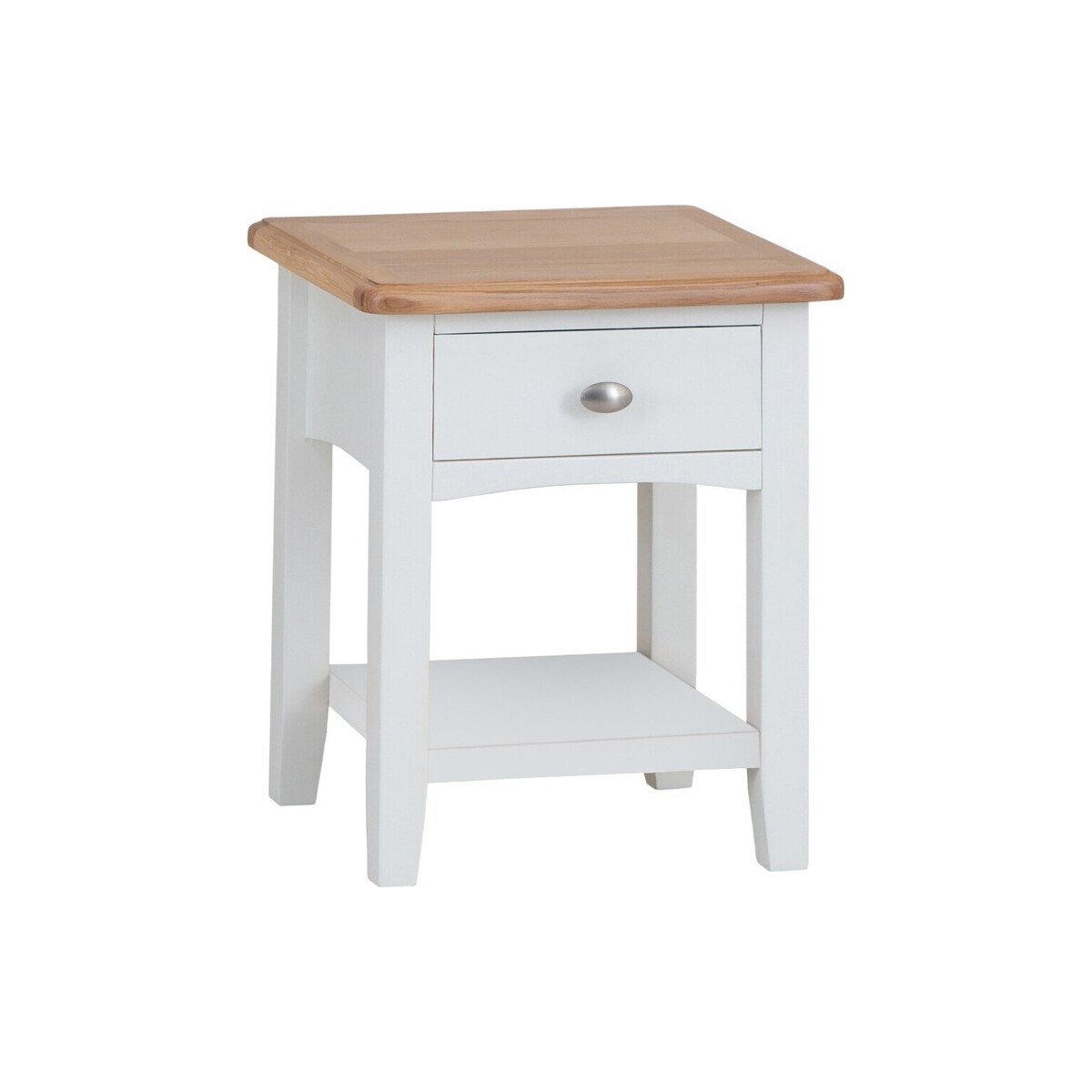 This 1 drawer side table is small and minimalist and elevates the atmosphere of any room you place it in. Featuring a solid wood frame, the side table is steady, strong, and stylish. Off-white frame and a glossy light oak top. Strong legs that taper towards their ends. One dovetailed drawer with a vintage oval knob handle. Low 11 cm magazine shelf. Light oak top with rounded corners and sensational bevel detailing. Comes ready assembled.