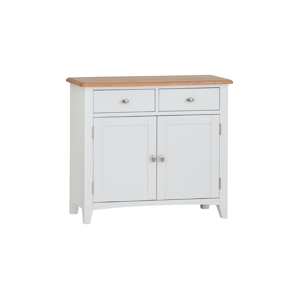 This sideboard is tall, wide, and very spacious. Sturdy and stylish with an elegant two-toned theme that features an off-white body and a light oak top. Sturdy, solid wood frame is built to last. Two dovetailed drawers to tuck away dining room essentials. The top has rounded edges and light bevel detailing. Internal shelf and strong tapered legs. Brushed metal oval knob handles. Comes ready assembled.